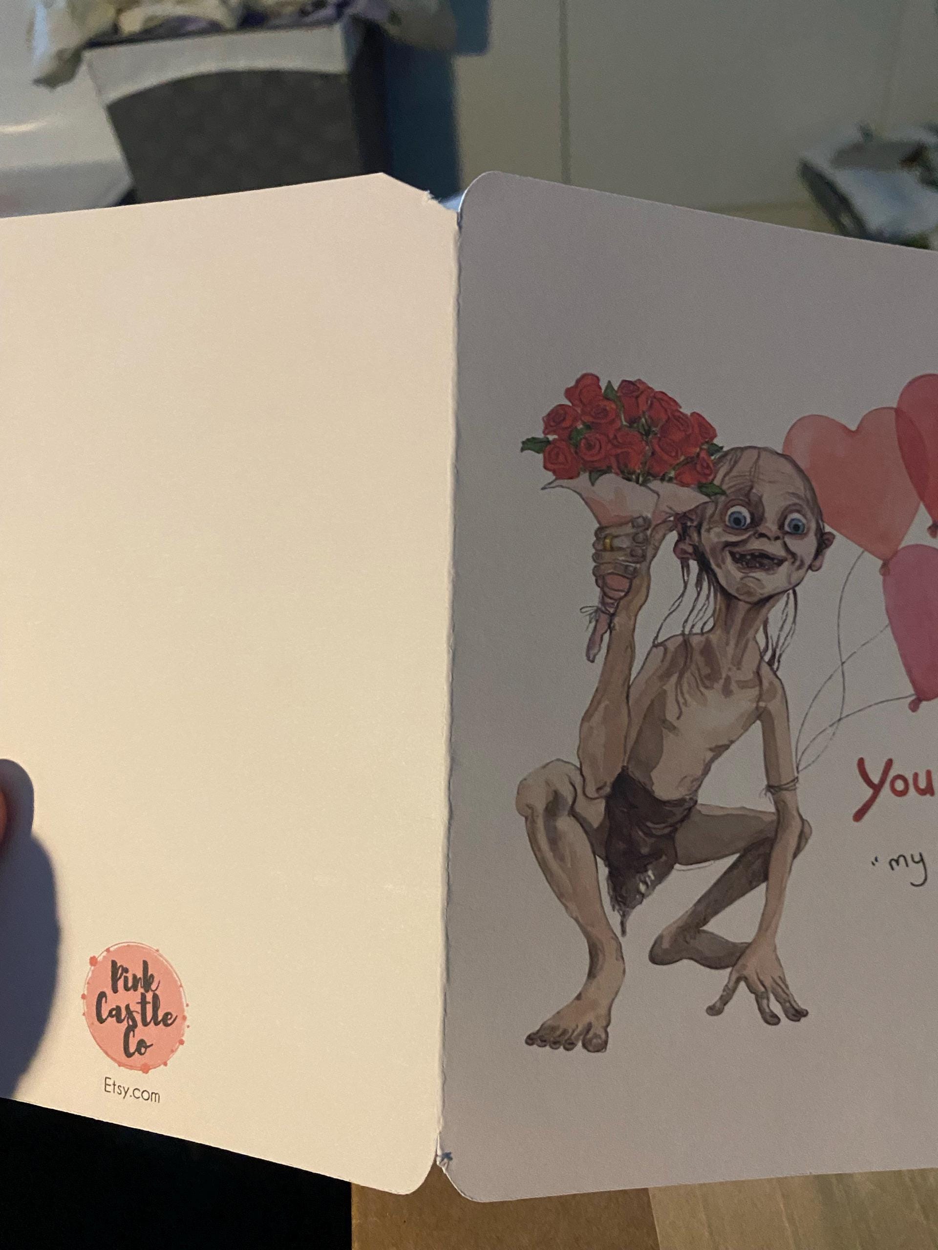 A very cute way to show someone you are thinking of them, this card features a Smegol Gollum from Lord of the rings and the hobbit and reads “you are my precious”
