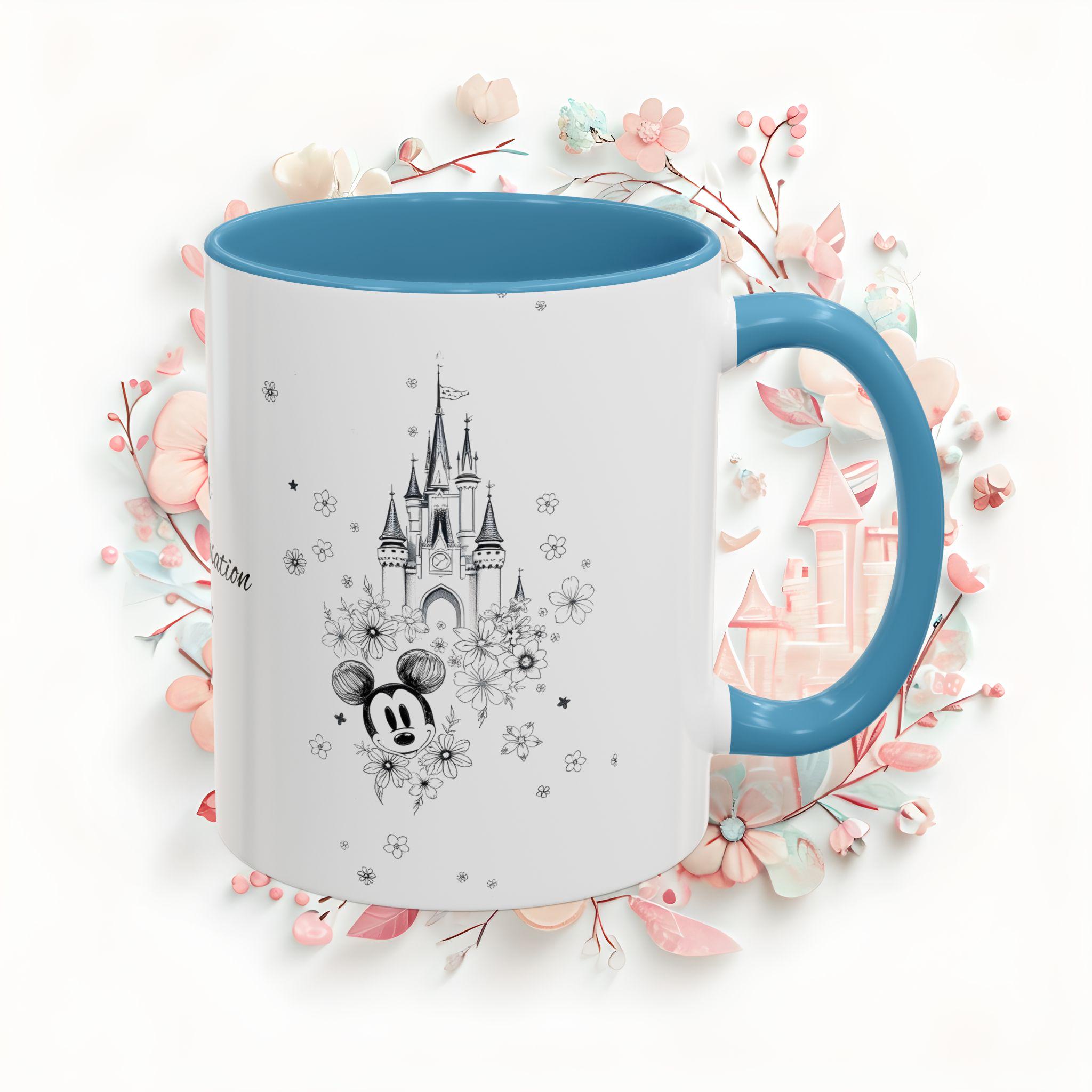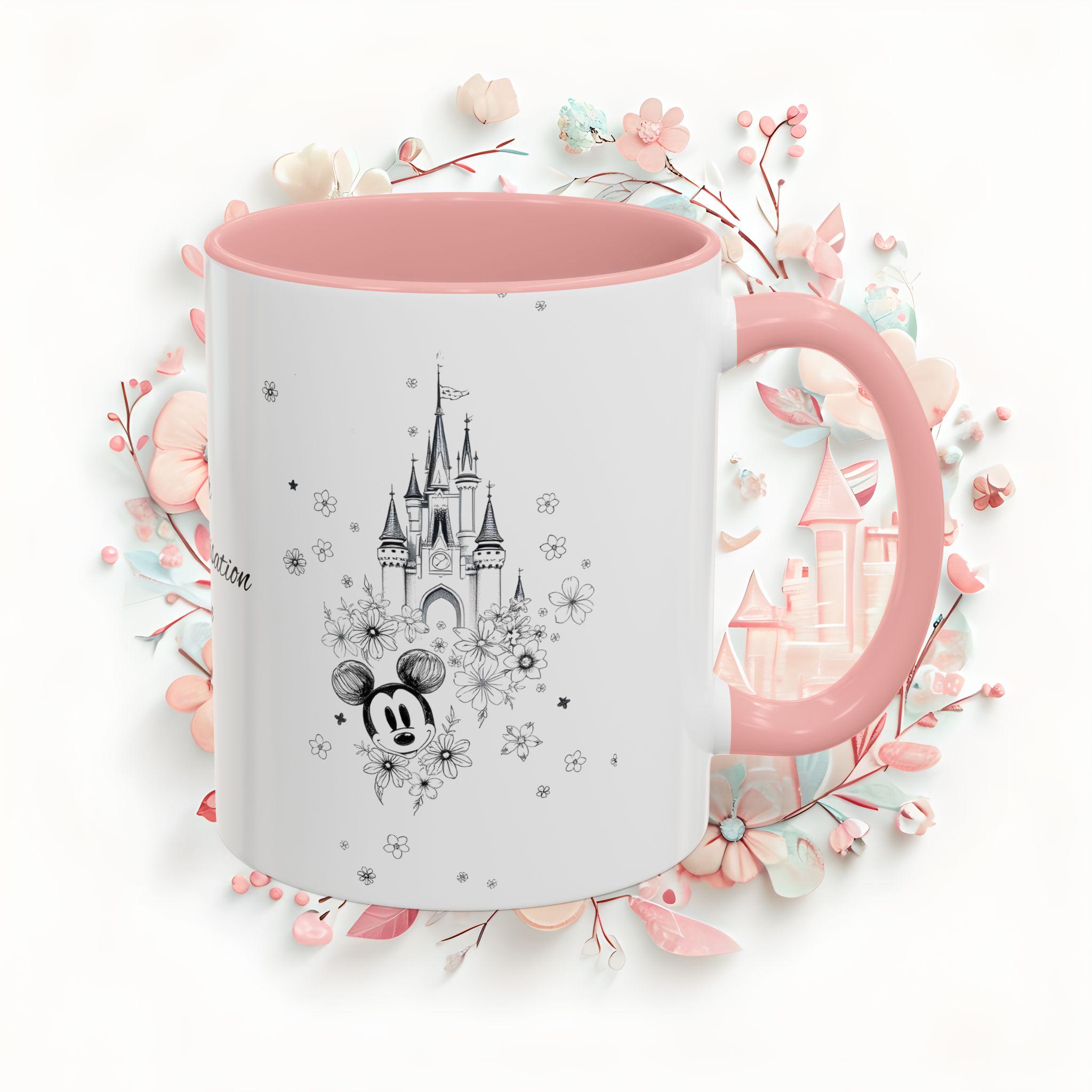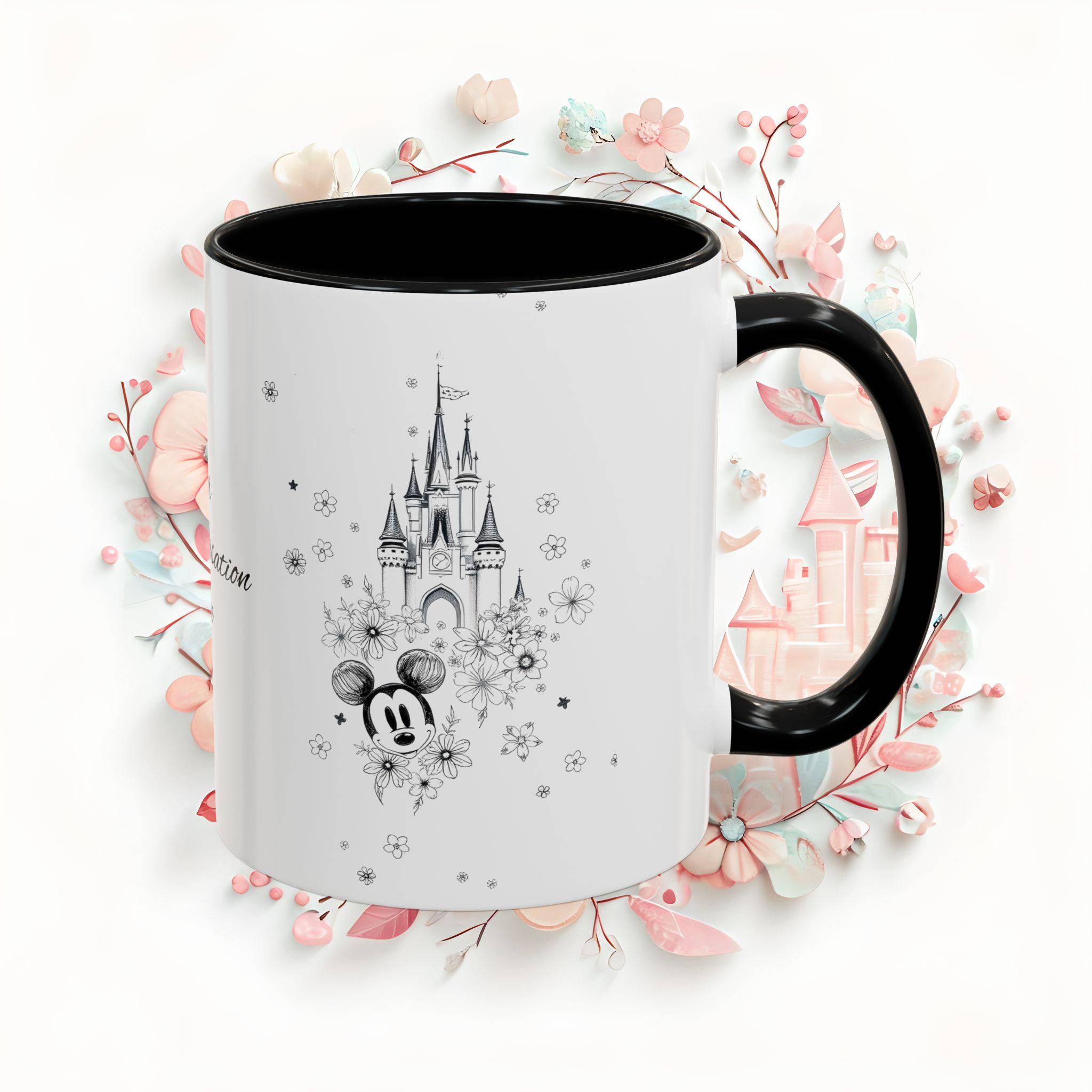 Personalized Floral Disney Castle Coffee Mug perfect for Disney lovers. Customizable mug for home or office, giving off a magical and enchanting vibe. Ideal for birthdays and fans of the Happiest Place On Earth.