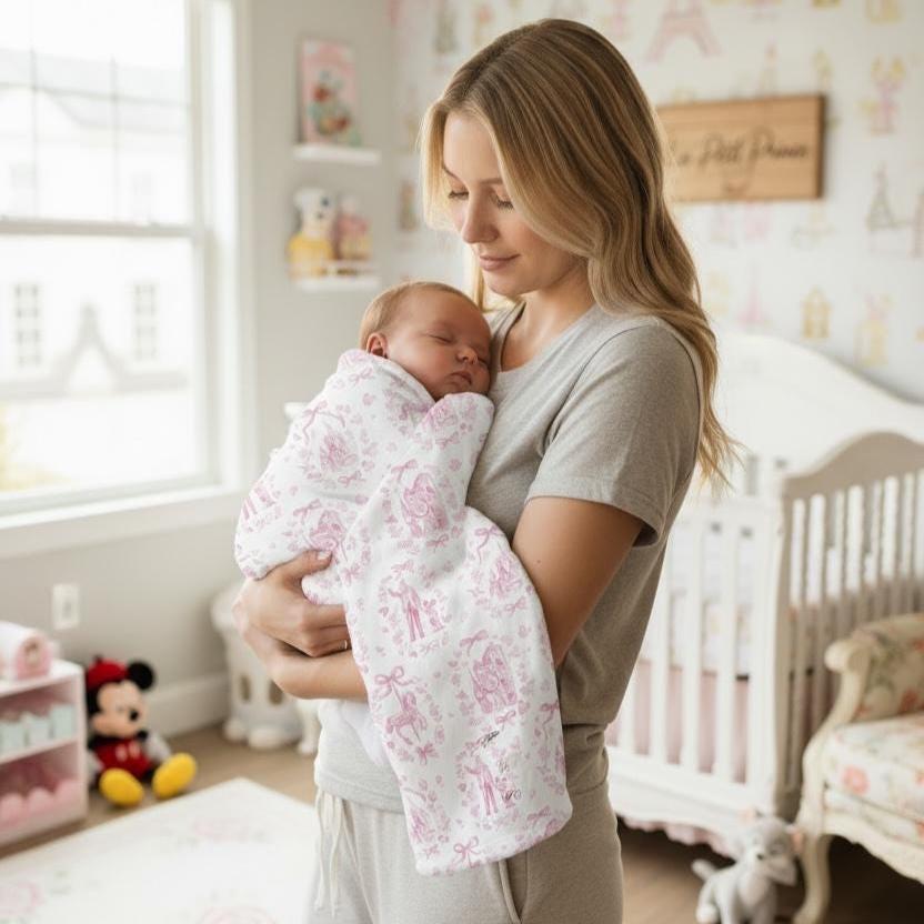 Pink Disneyworld Mickey Walt Inspired Baby Blanket, perfect for adding a touch of magic to a nursery or playroom. Cozy and soft, it makes a great gift for baby showers, birthdays, or any Disney lover. Ideal for keeping little ones warm and comfortable.