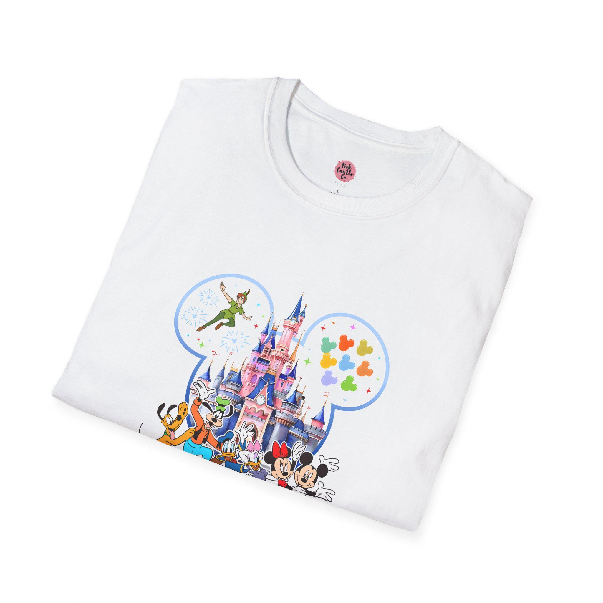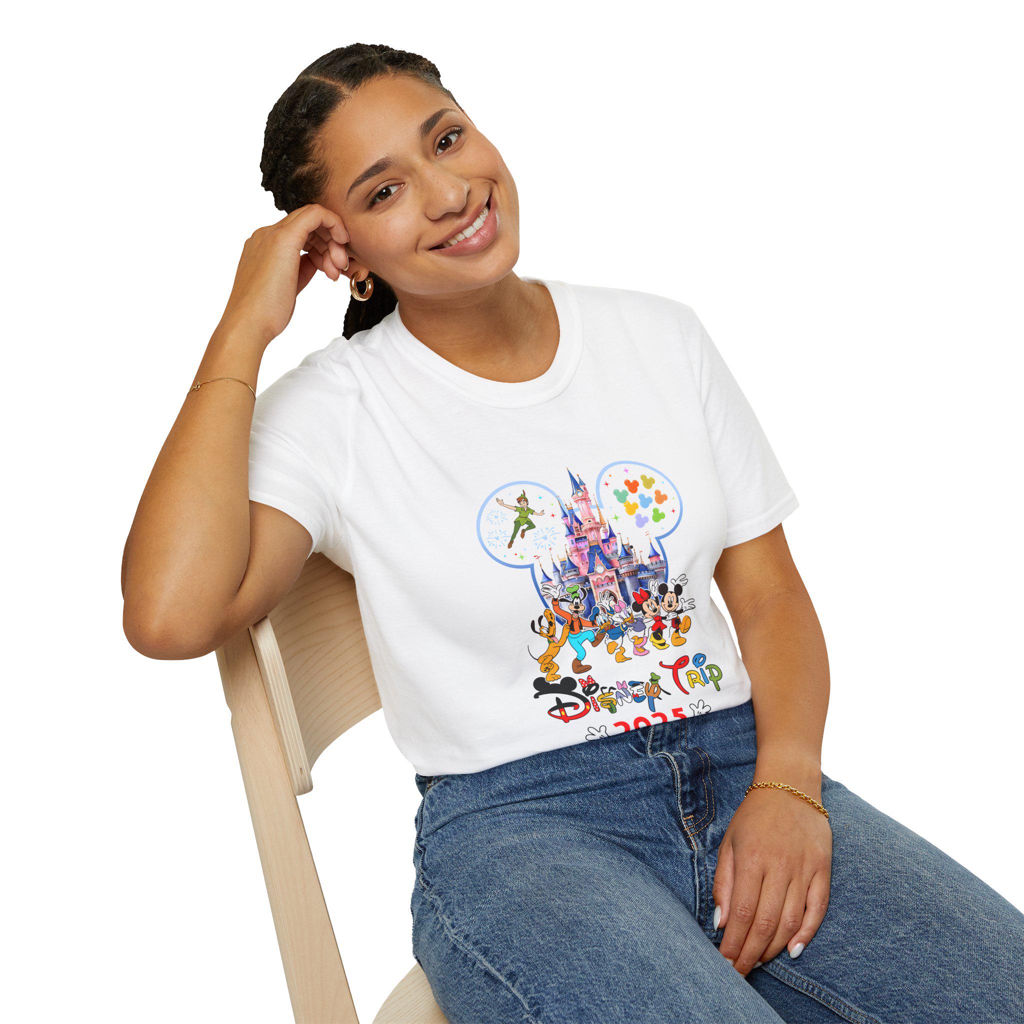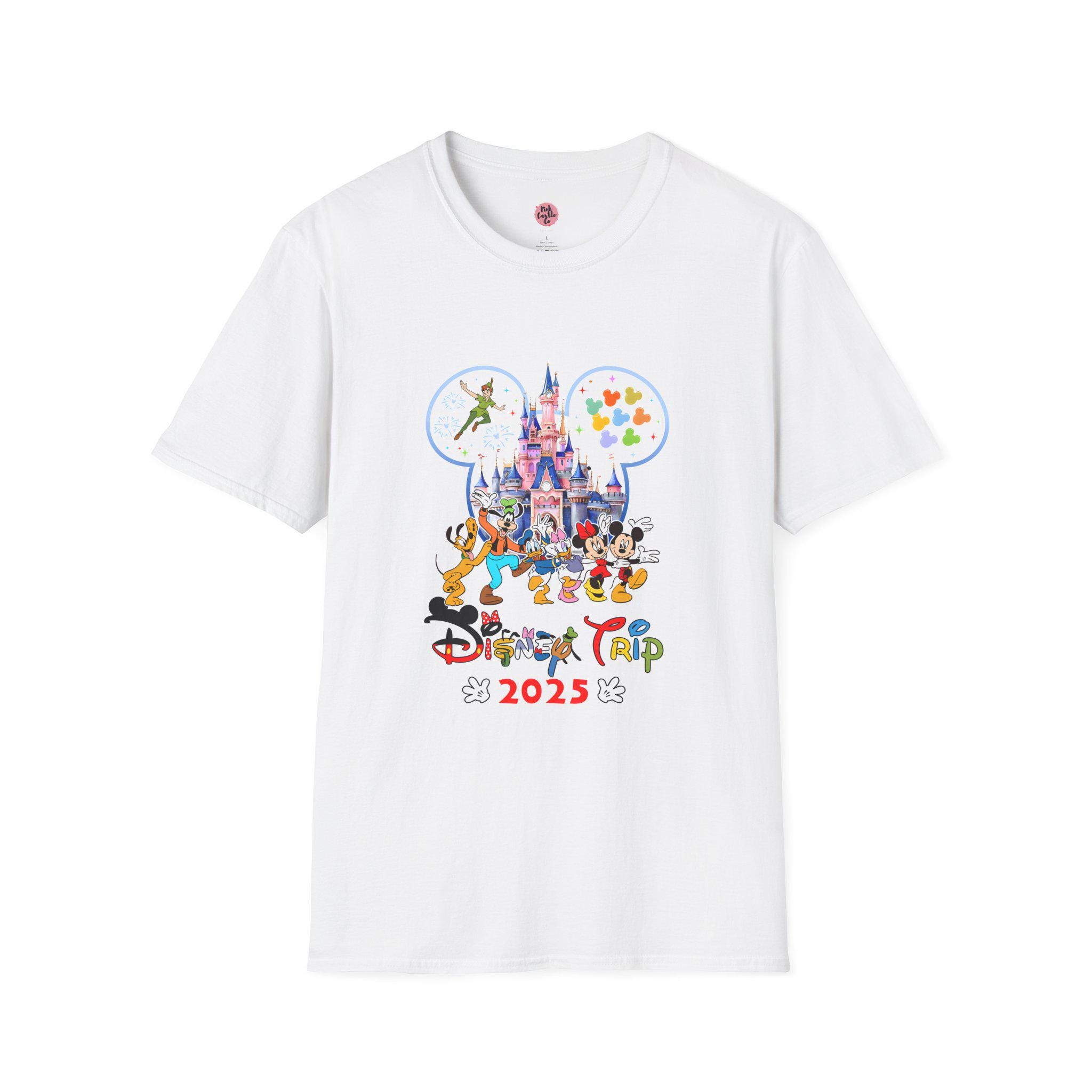 Customizable Unisex Softstyle T-Shirt perfect for Disney holiday vacations, featuring a personalized family name and cute 2025 Disney Trip design. This shirt is ideal for Disney lovers looking to create magical memories on their family vacation.