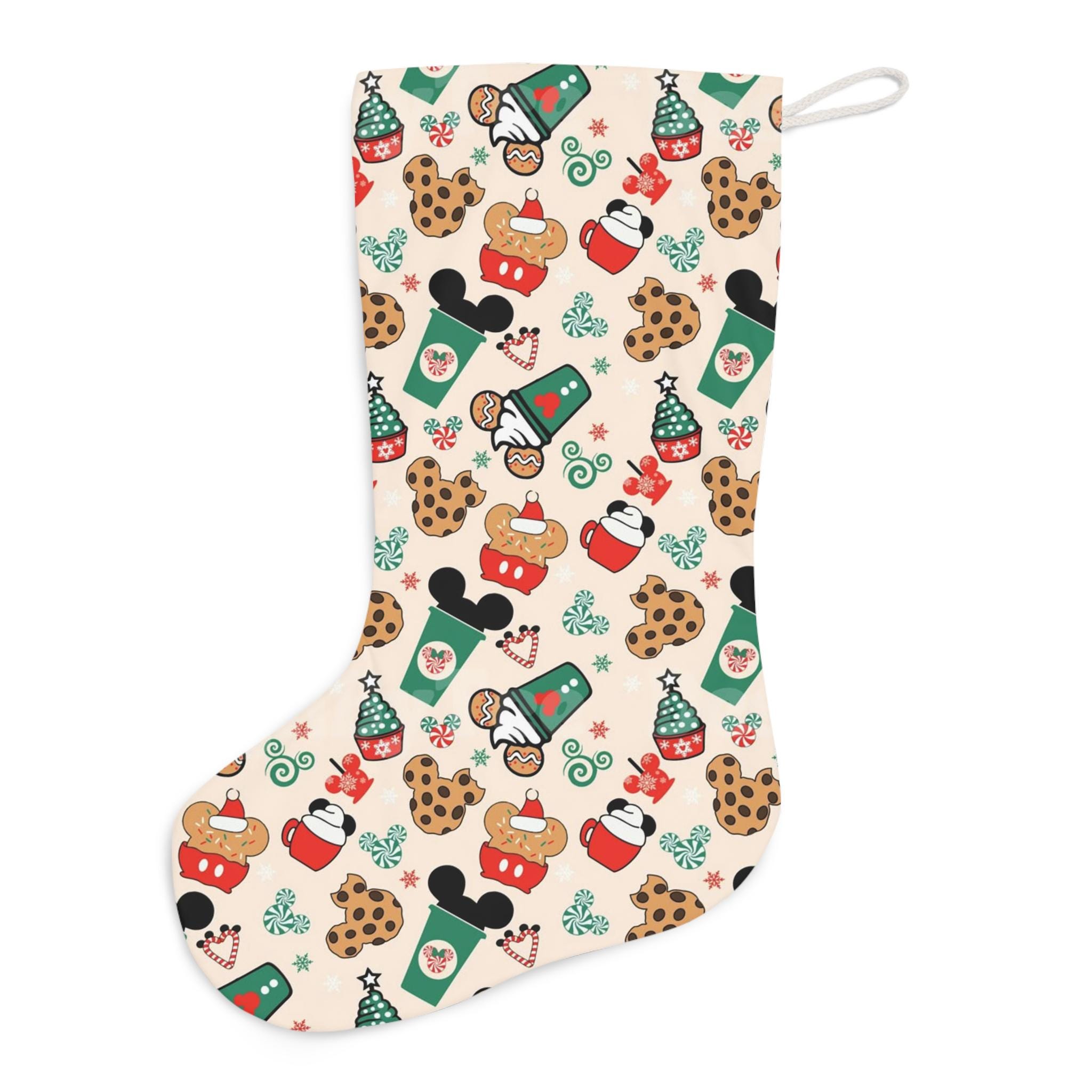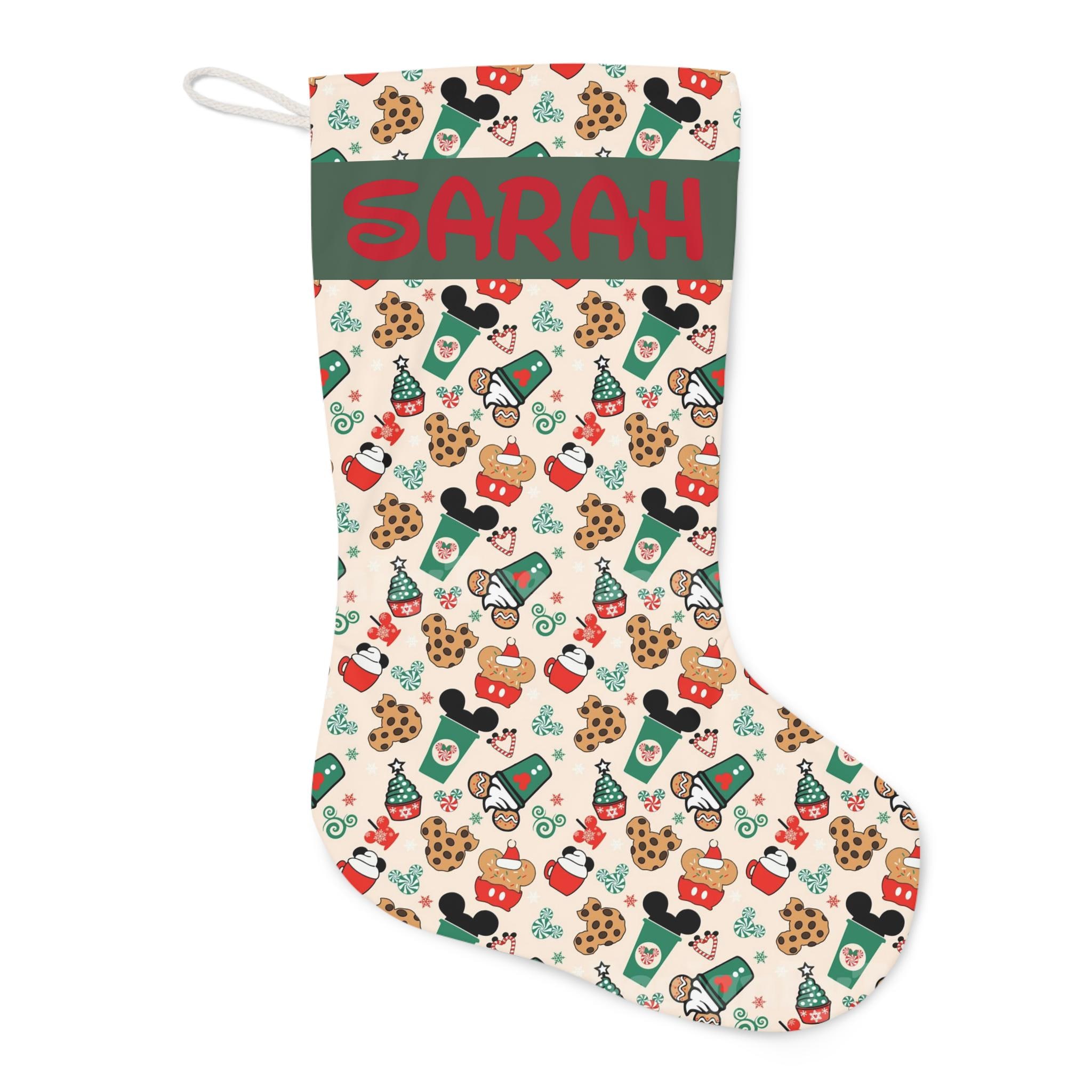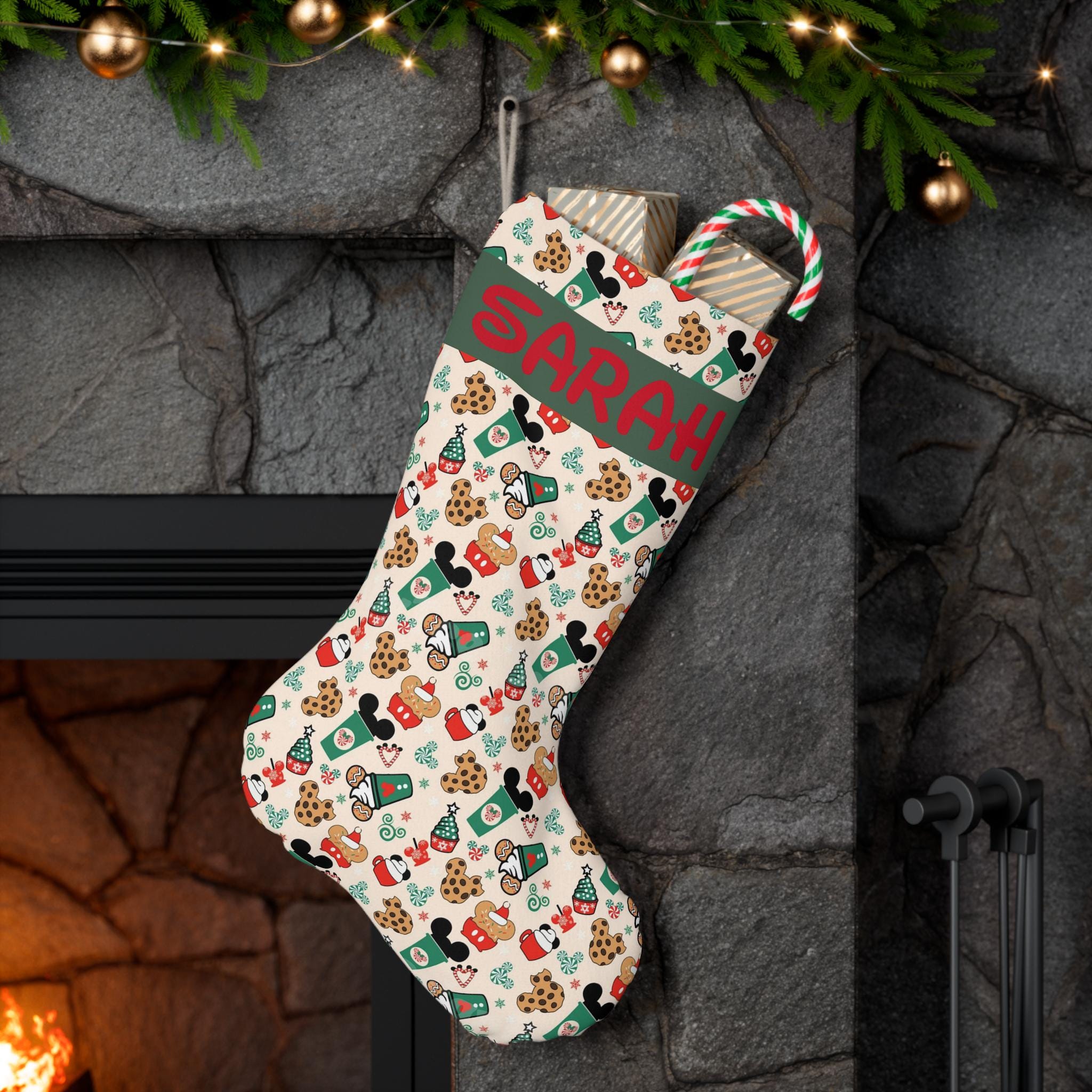 Disney Christmas snacks park inspired personalized Santa stocking. A cute and unique holiday decor that adds festive vibes to your home. Perfect for families looking to start or continue a holiday tradition. Ideal as a holiday keepsake or as a special Christmas gift for loved ones. Relevant for Christmas celebrations and gift-giving occasions.