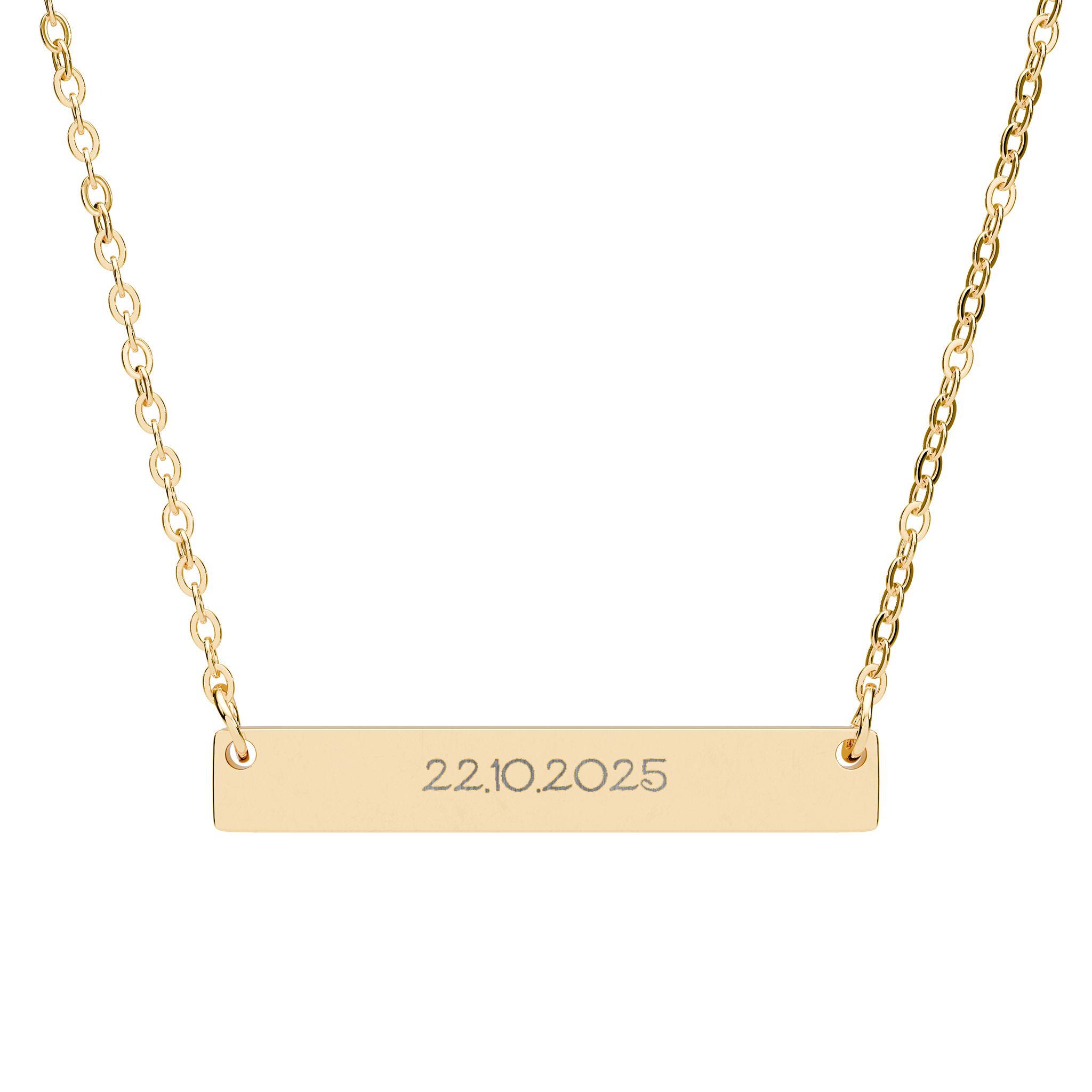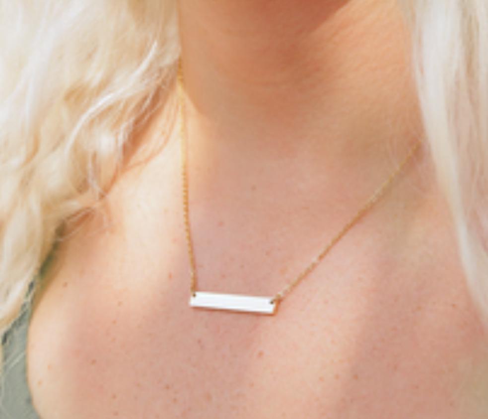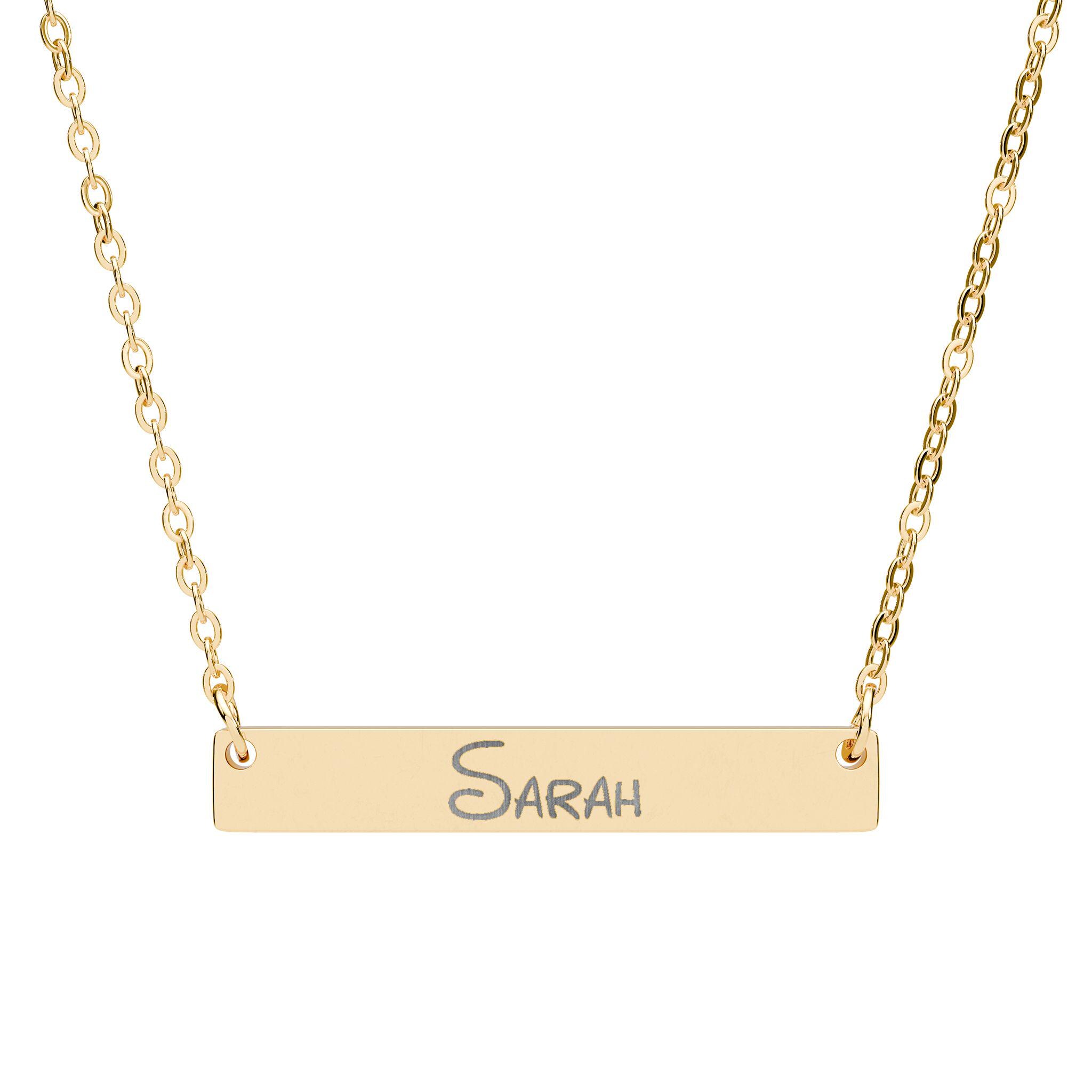 Personalized Horizontal Bar Necklace made from high-quality stainless steel with custom engraving. This minimalist necklace is a unique gift for her, perfect for birthdays or anniversaries. The sleek design in Disney font style adds a high-end look to any outfit. Ideal for adults looking for a timeless piece of jewelry.