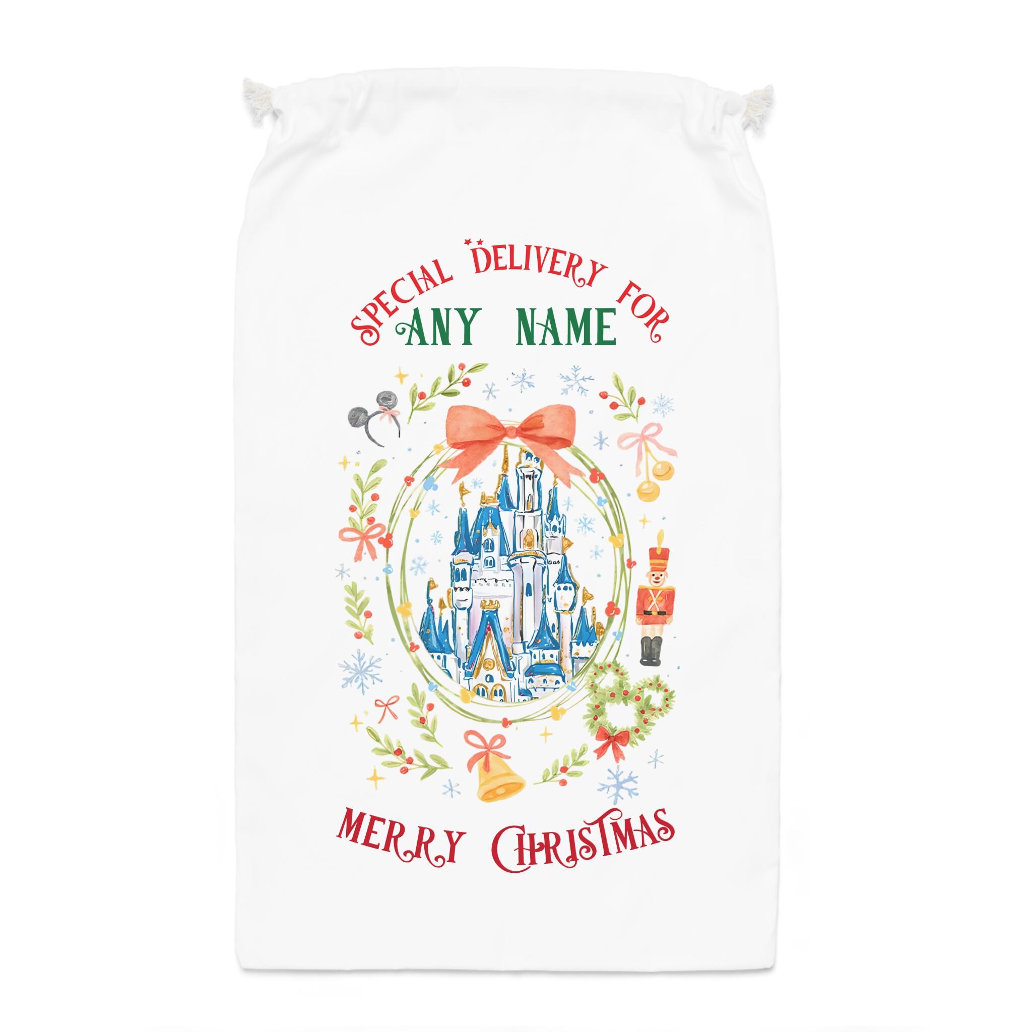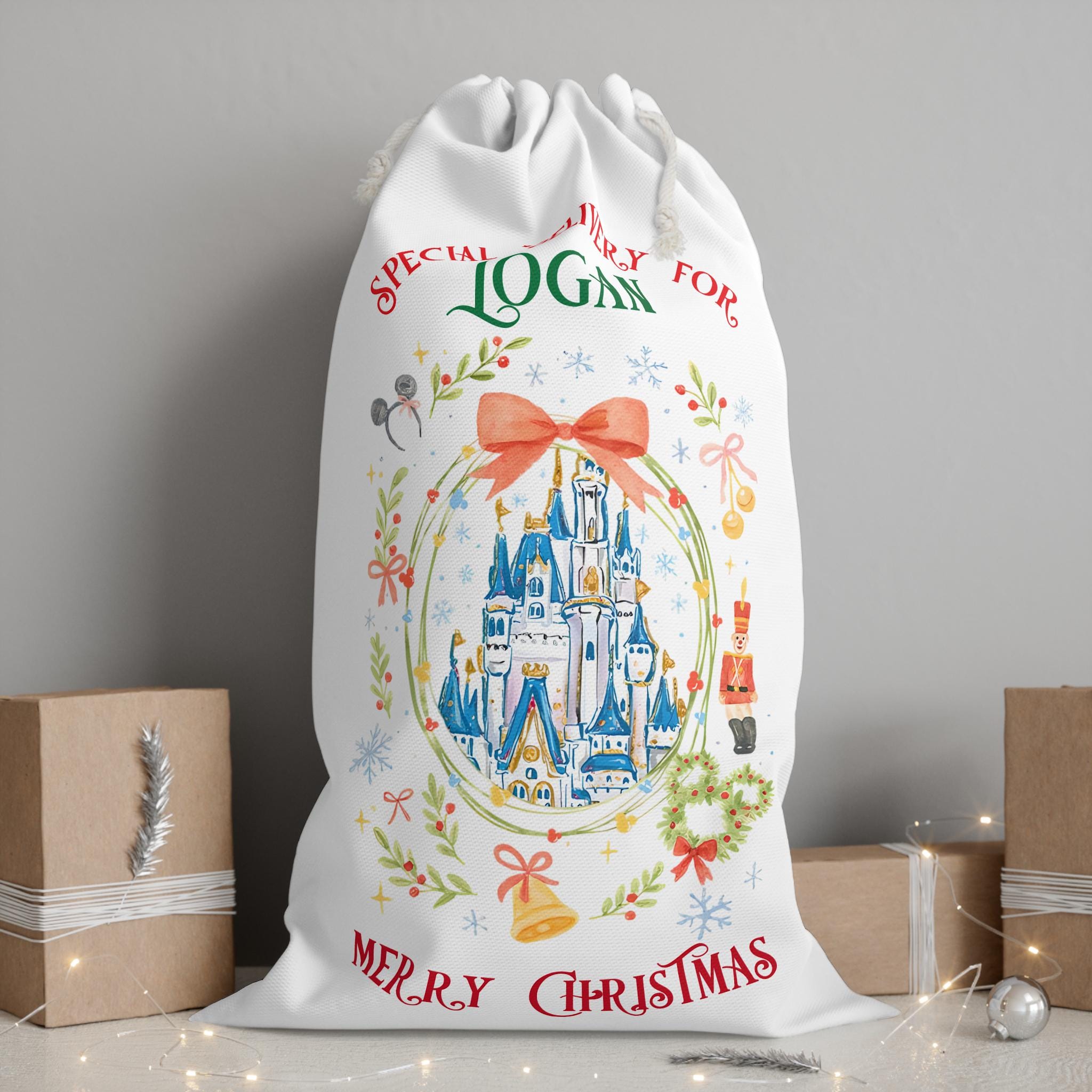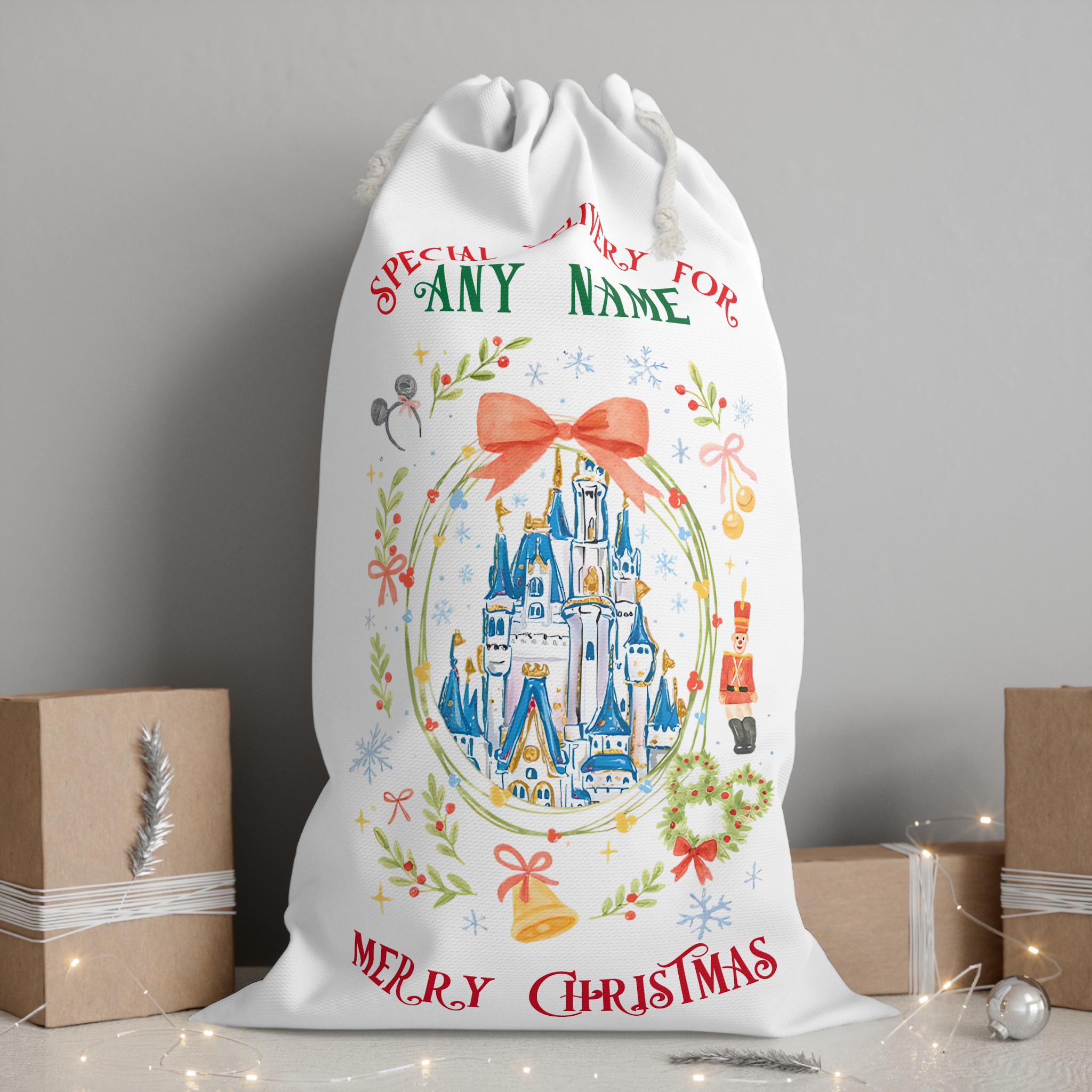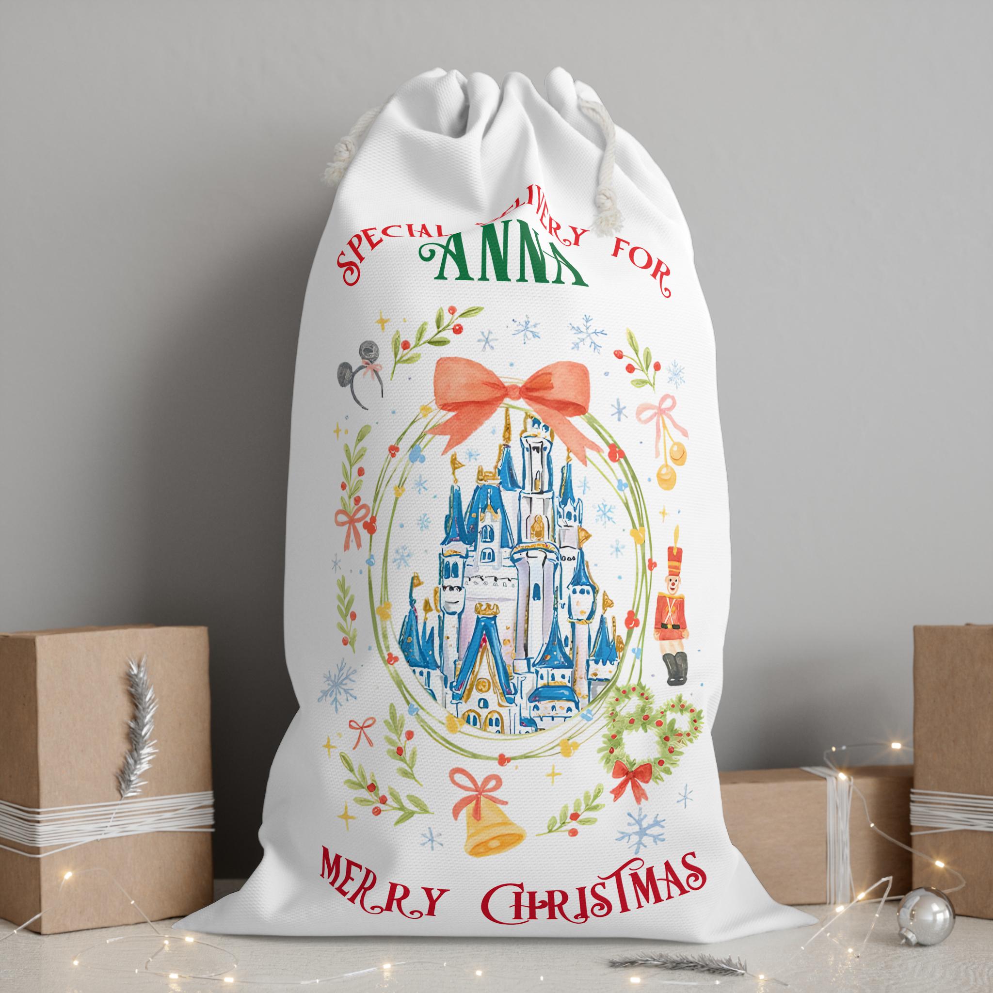 Personalized Christmas Gift Sack inspired by the Disney castle, perfect for holiday decoration and storing kids' Christmas presents. Customizable with a name, this festive Santa bag brings fun and joy to any Christmas celebration. Suitable for anyone looking to add a touch of magic to their holiday festivities.