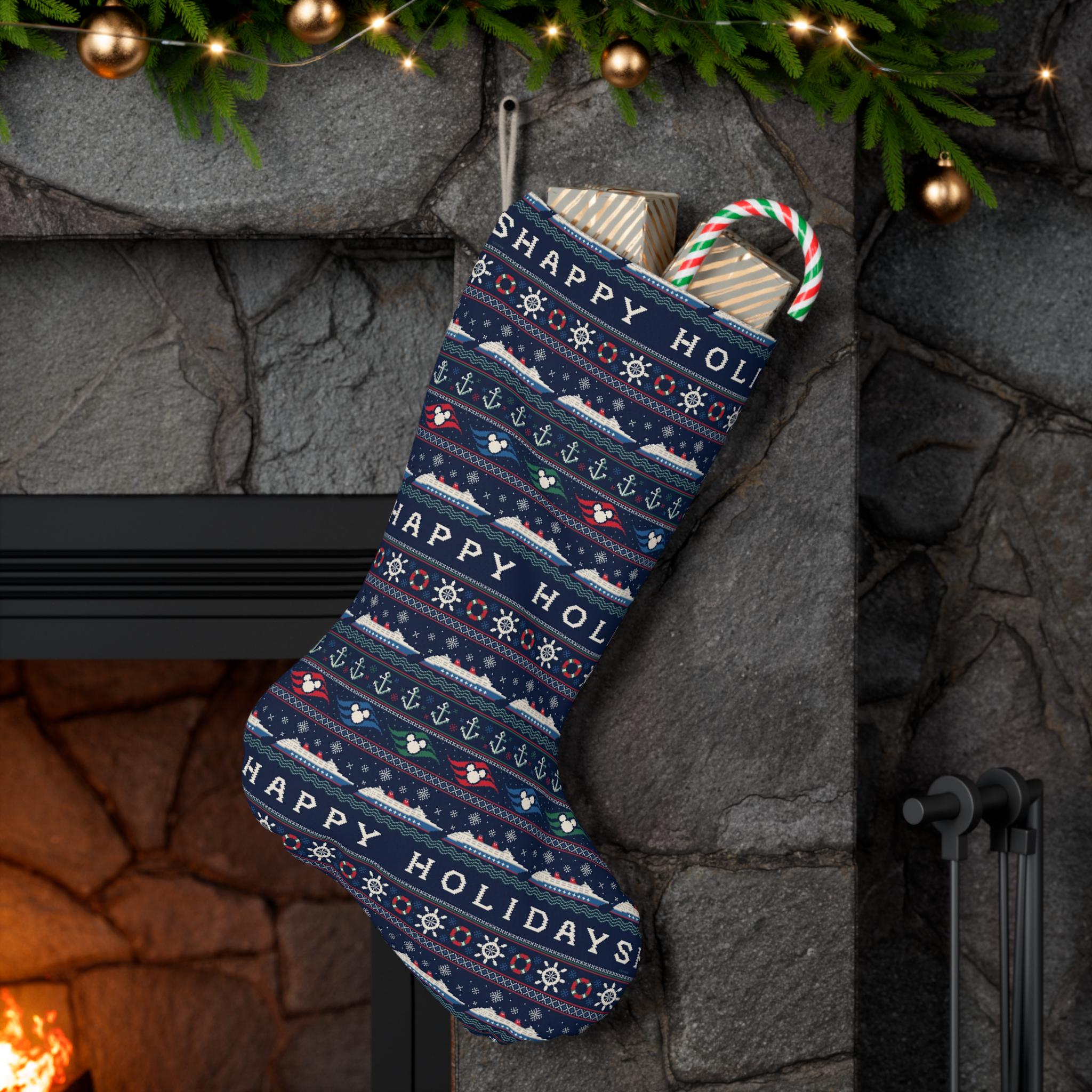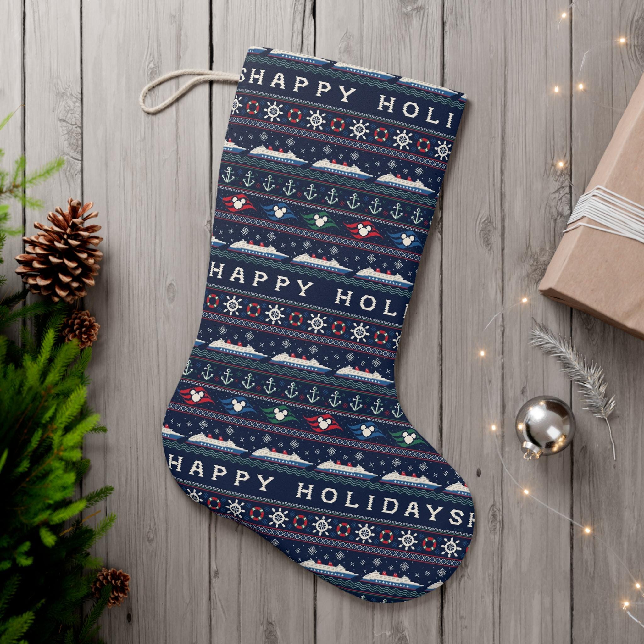 Get into the holiday spirit with this Santa Stocking, inspired by Disney Cruise Line. Perfect for adding a touch of festive magic to your home decor and continuing family traditions. The knitted ugly Christmas sweater jumper design gives a unique and cozy vibe. Ideal for anyone looking to make Christmas extra special, perfect for hanging by the fireplace or staircase. Suitable for Christmas, holiday celebrations, and family gatherings.