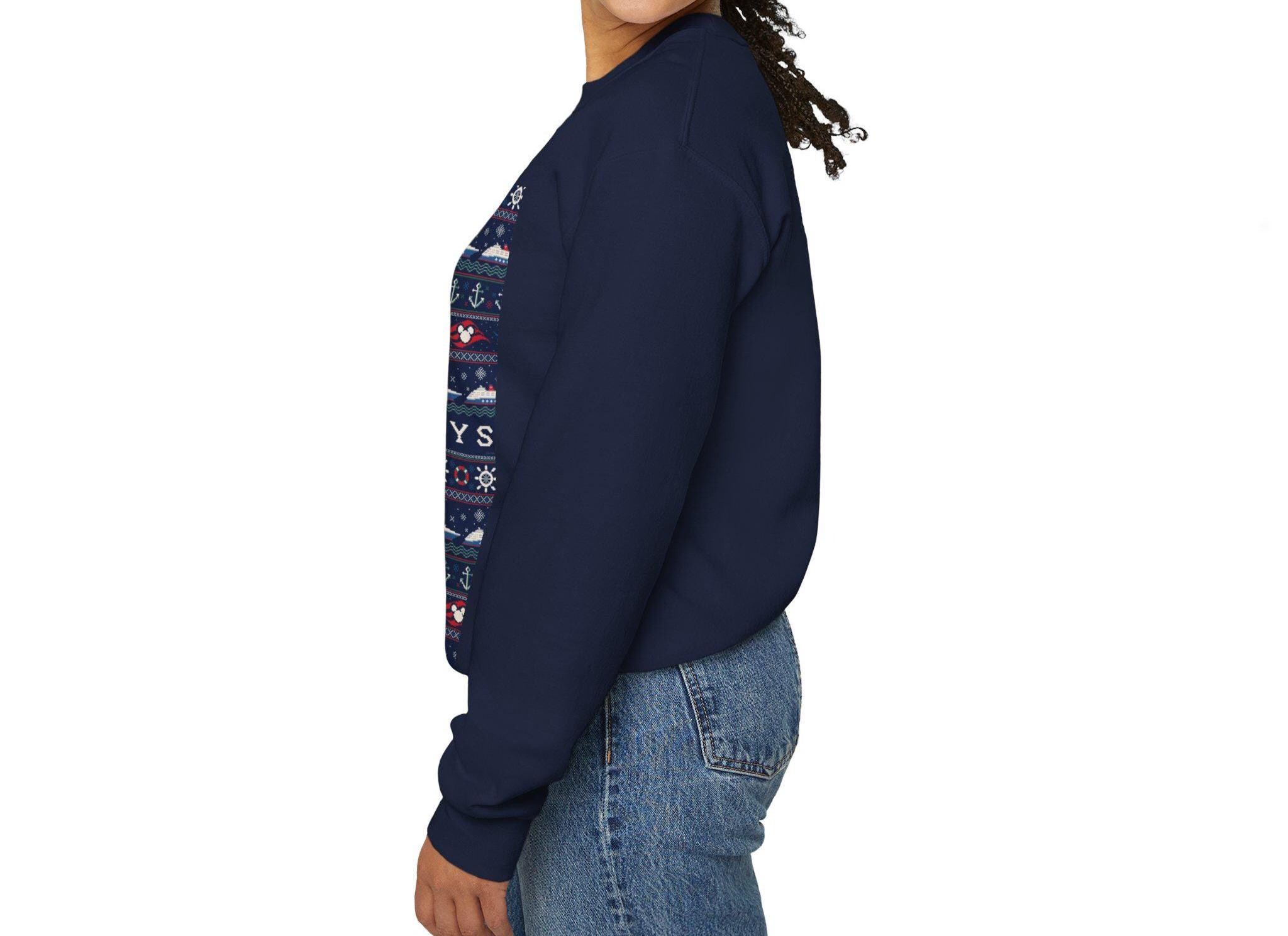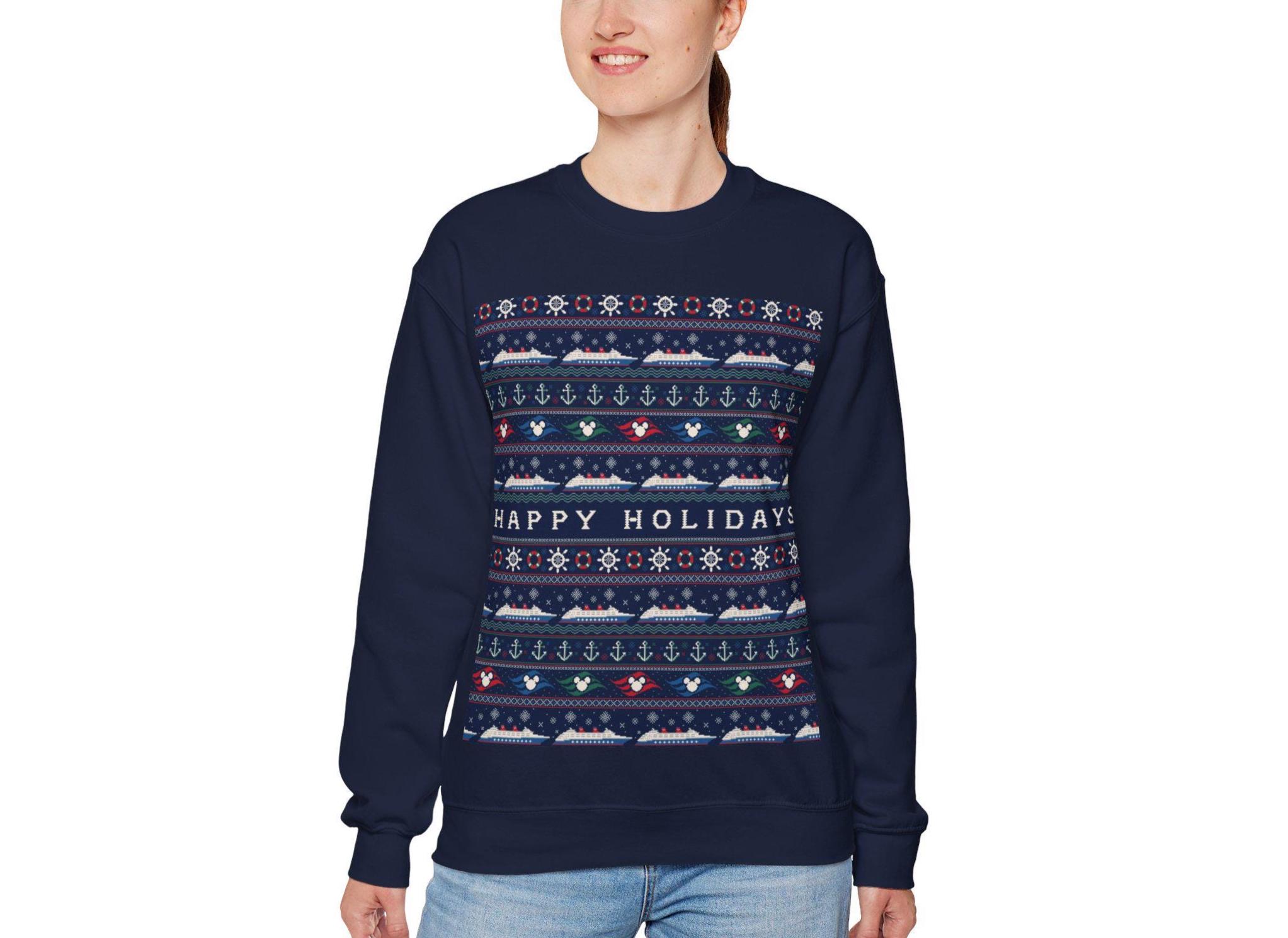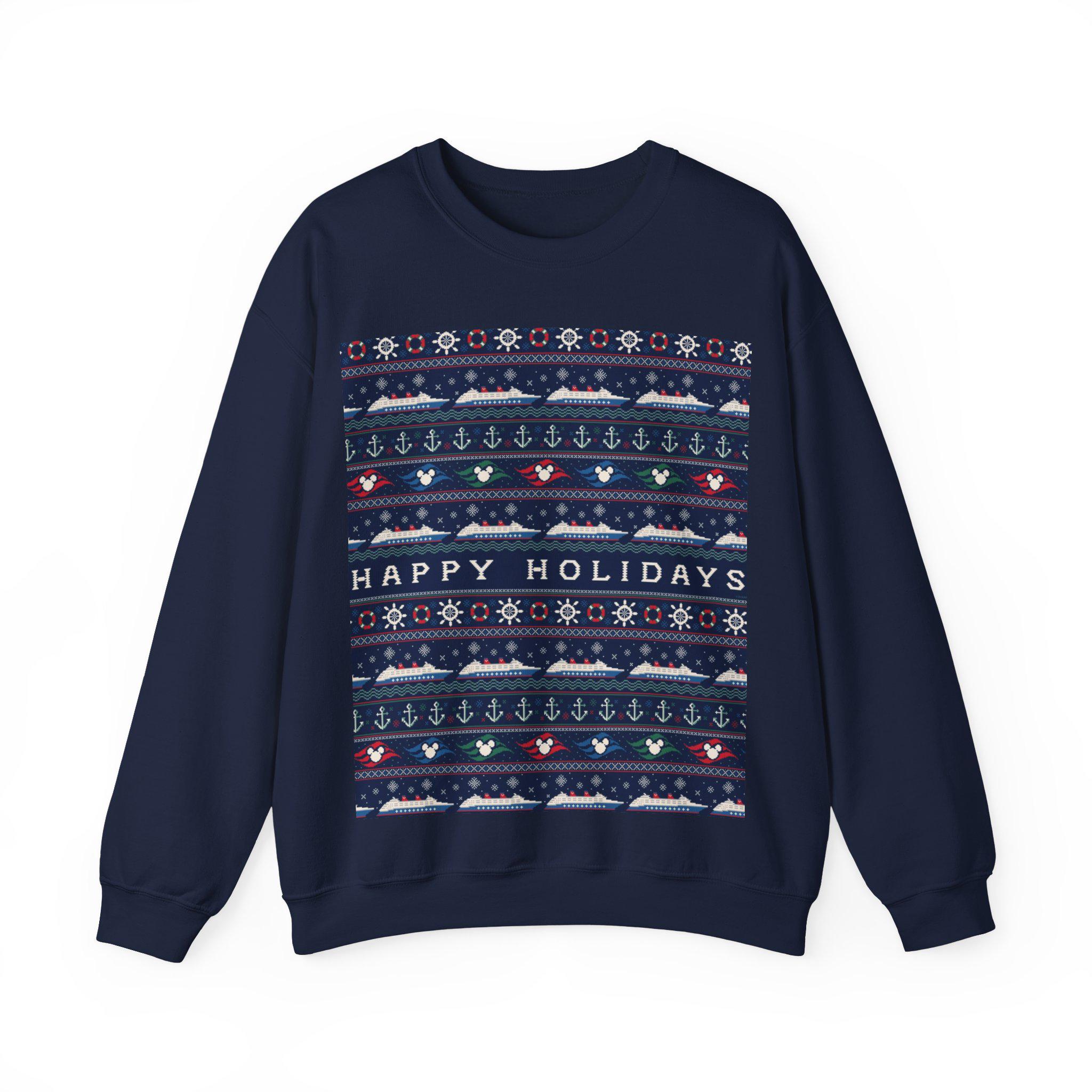 Stay cozy and festive with this Happy Holidays Disney Cruise Line inspired ugly knitted sweater jumper Unisex Crewneck Sweatshirt. Perfect for holiday celebrations and seasonal layering, this sweatshirt is a great gift for friends looking for a cozy winter wear option.