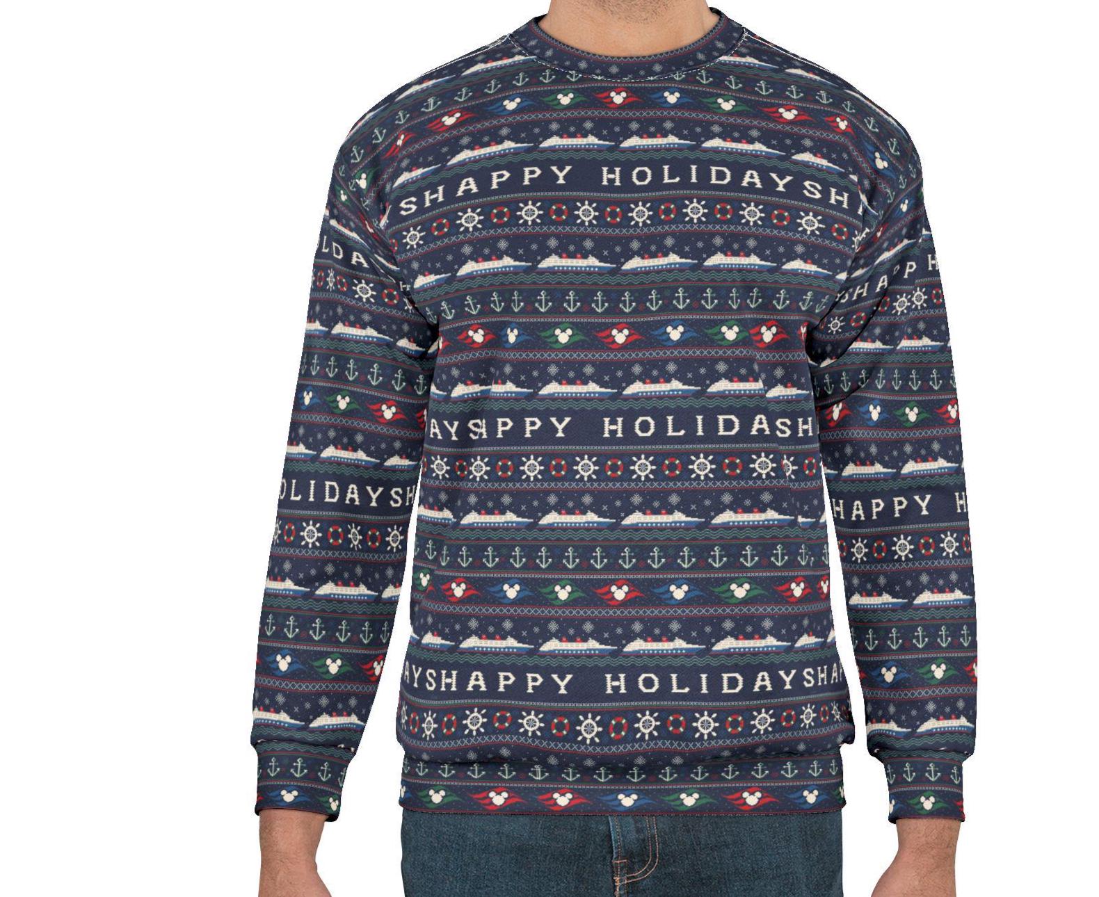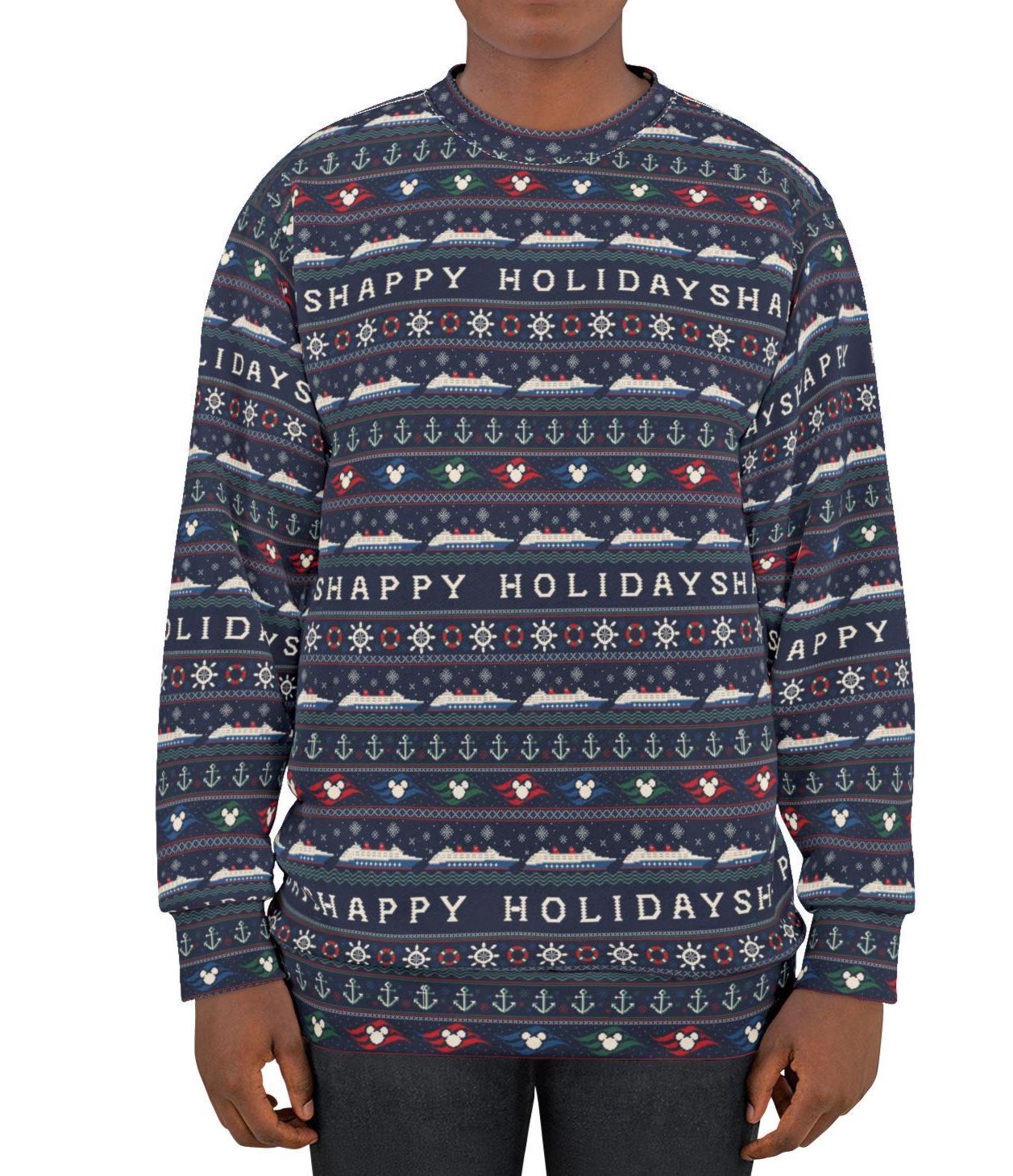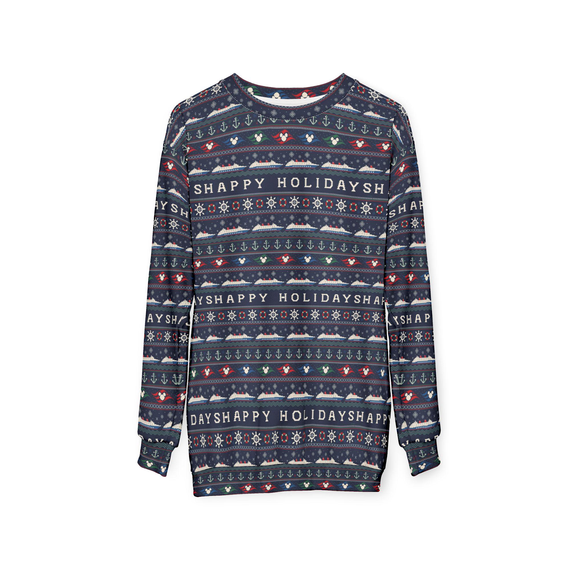 Stay warm and cozy in this Disney Cruise Line inspired holiday sweatshirt. The all-over print design features bright and intense colors, perfect for the festive season. Whether you're lounging at home or going out for a holiday gathering, this unisex sweater is a great Christmas gift for Disney fans.