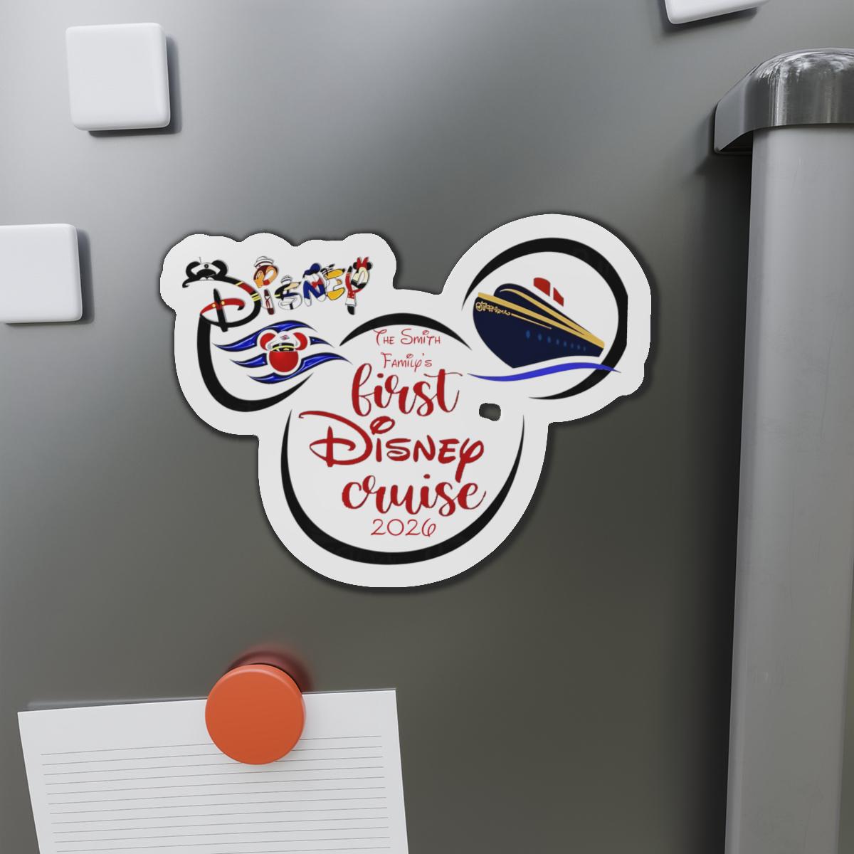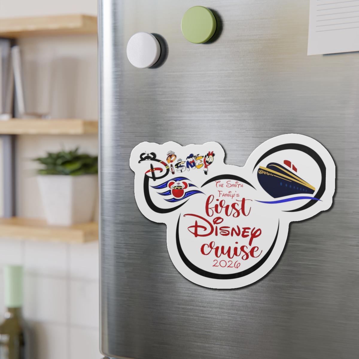 Personalized Disney Cruise Die-Cut Magnet, perfect for Disney fans looking to commemorate their first cruise experience. This fun travel decor adds a touch of Disney magic to any smooth flat surface, making it a great keepsake and vacation souvenir. Ideal for families or individuals who love Disney and cruising. Relevant for Disney vacations, family trips, cruise enthusiasts, and Disney fans.