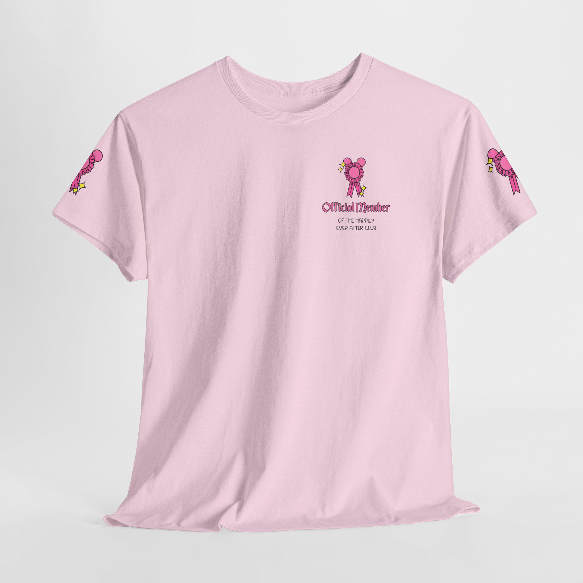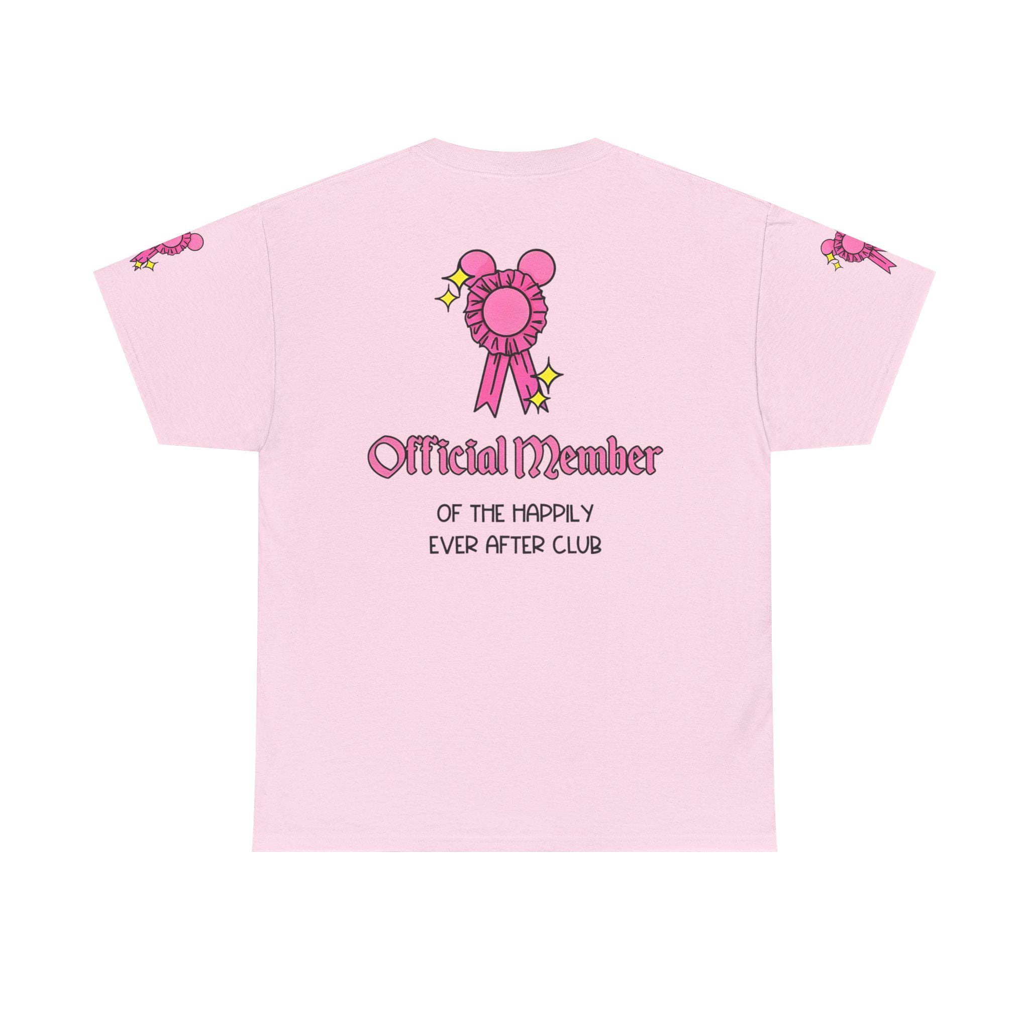 Official Member Happily Ever After Ribbon T-Shirt inspired by Disney, perfect for fans who want to show their love for Disney in a stylish way. This tee gives off a cheerful and magical vibe, ideal for everyday wear or special occasions. Relevant for Disney enthusiasts, fans of fairytale princesses, and those celebrating birthdays, anniversaries, and theme park visits.