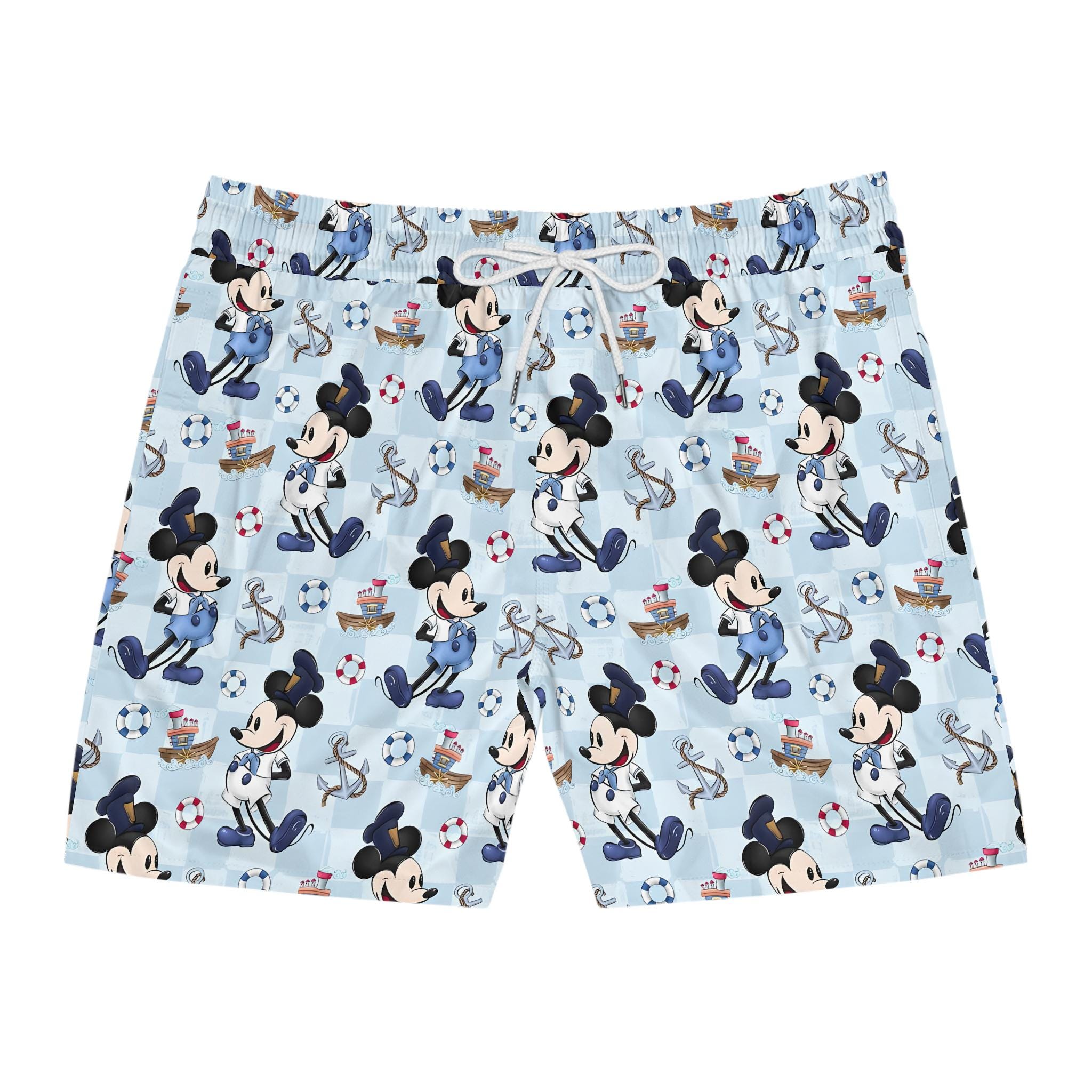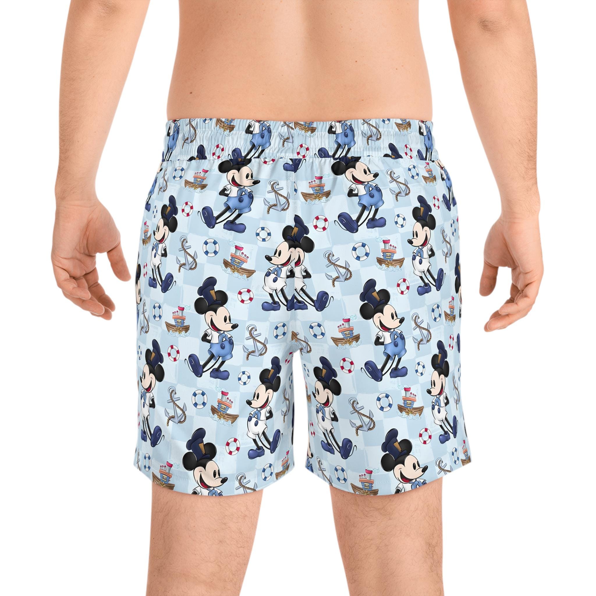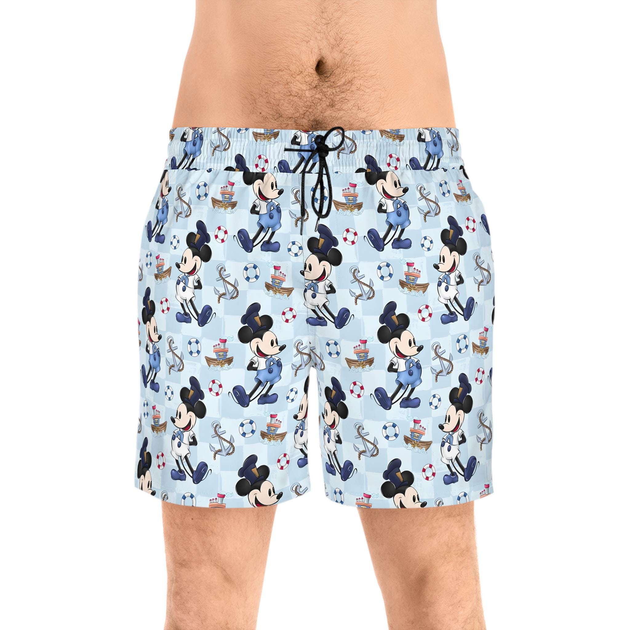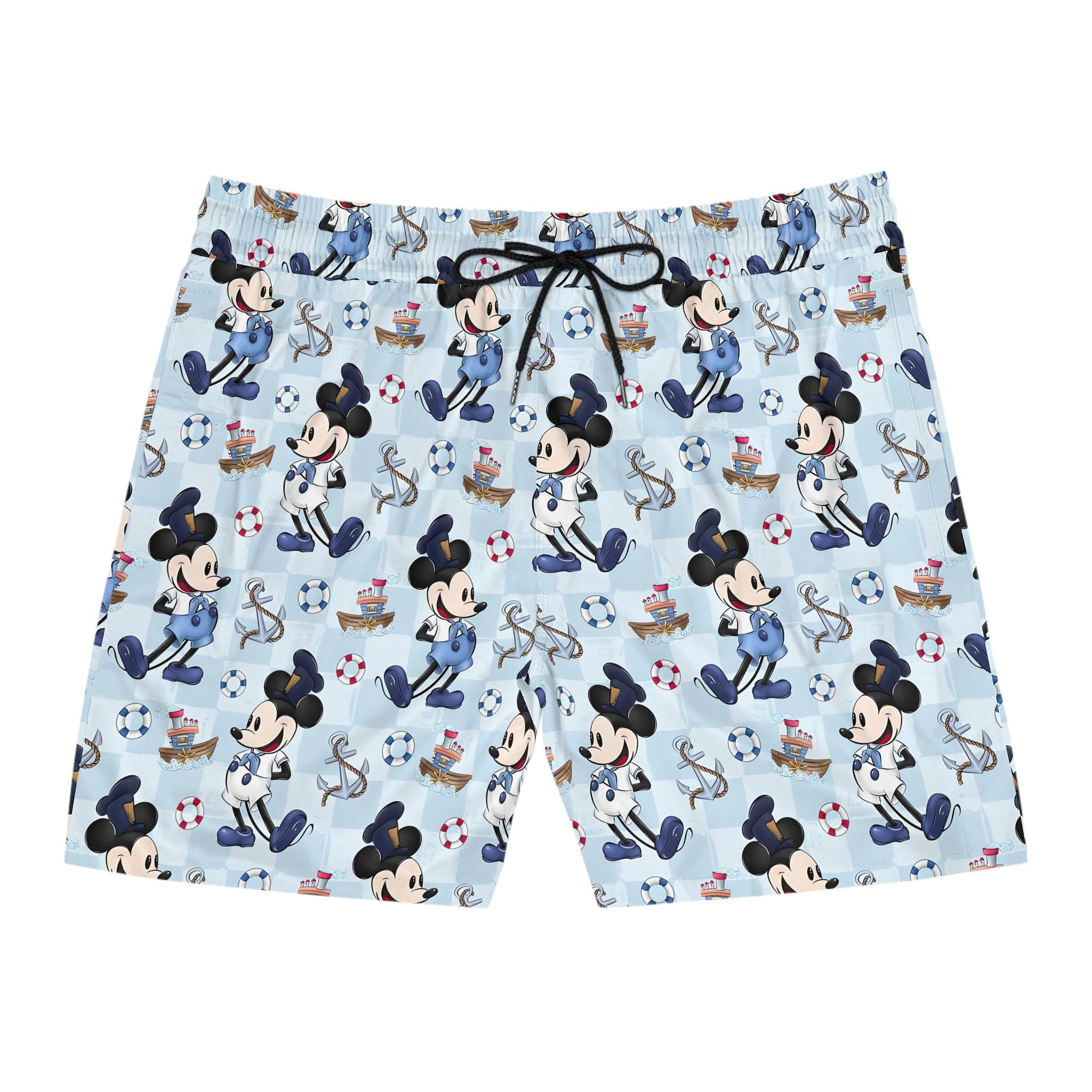 These mid-length swim shorts bring a playful, nautical energy to beach days and poolside hangs. Lightweight stretch fabric moves with you whether you’re cutting through waves or walking the boardwalk. The inner mesh brief keeps things secure and comfortable; elastic waist with drawstring lets you fine-tune the fit. Two deep side-entry pockets hold keys or a small wallet while the seam thread and drawstring color coordinate with the print for a clean finish. The sailor-inspired character pattern on a pale blue background gives a vintage seaside vibe that slips easily into vacation rotations and summer escapes.