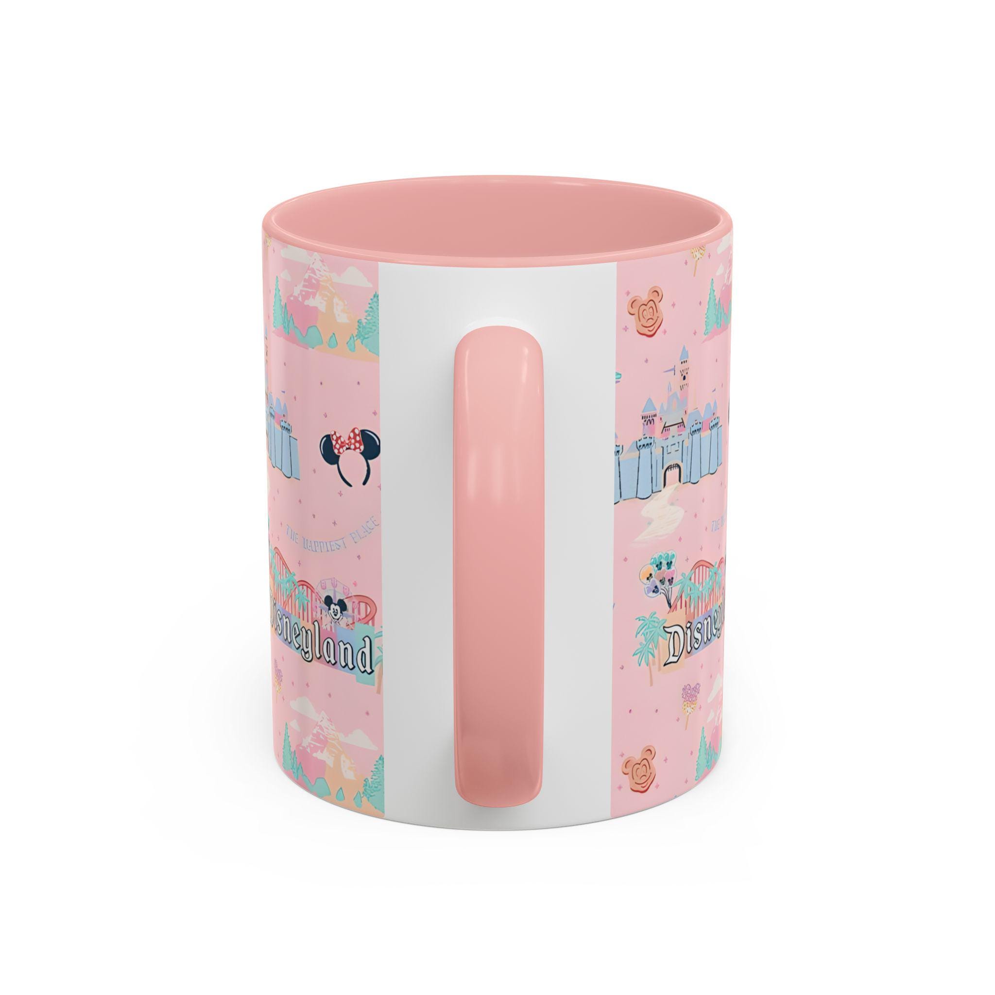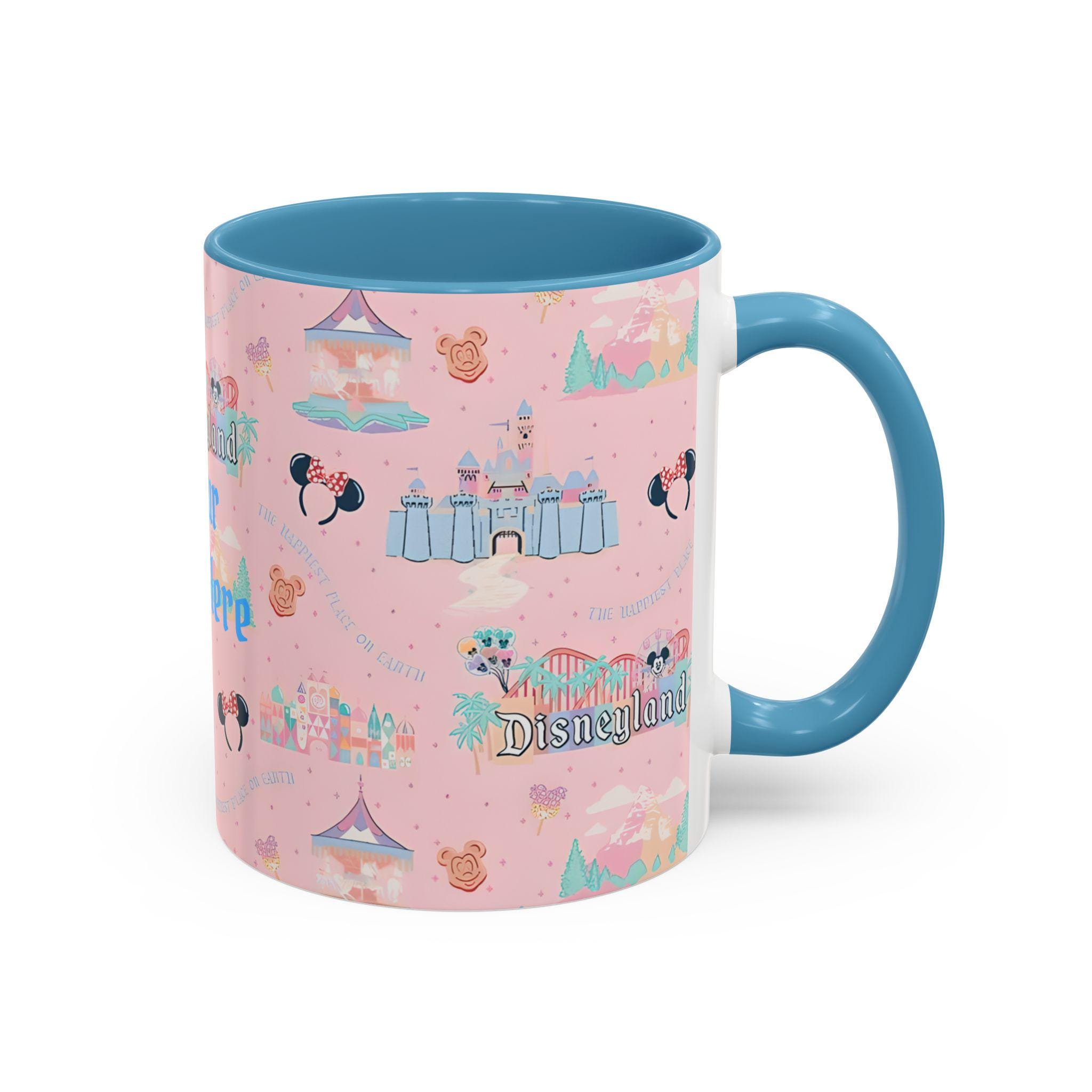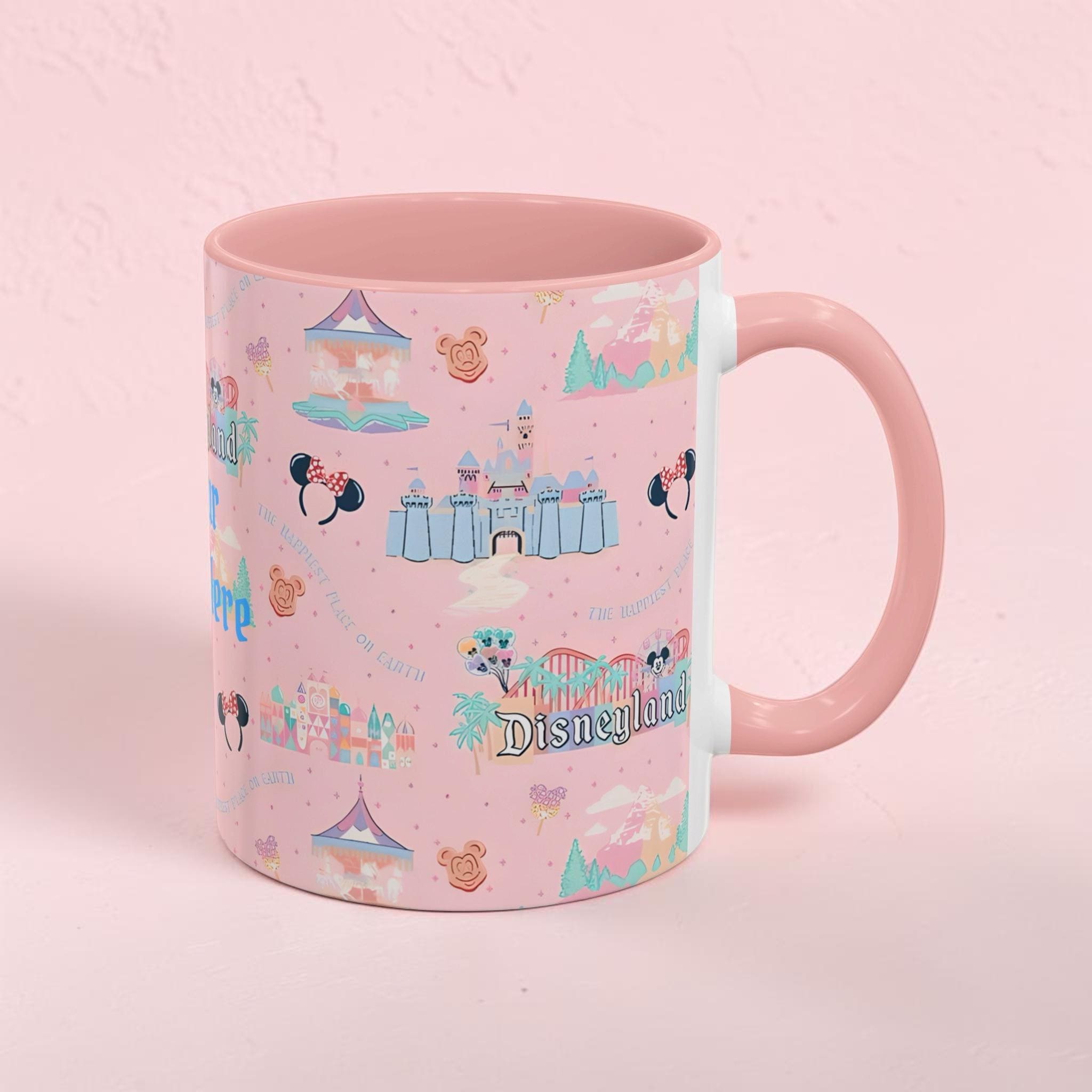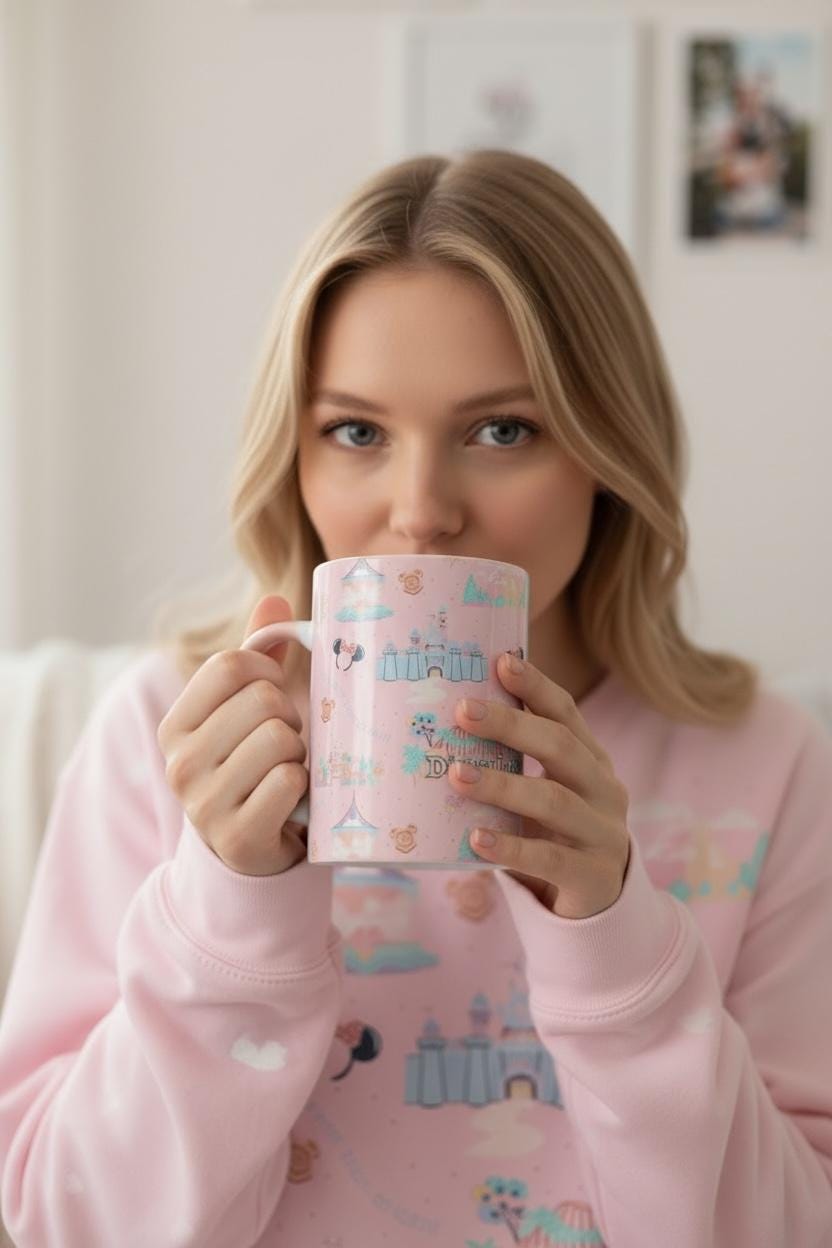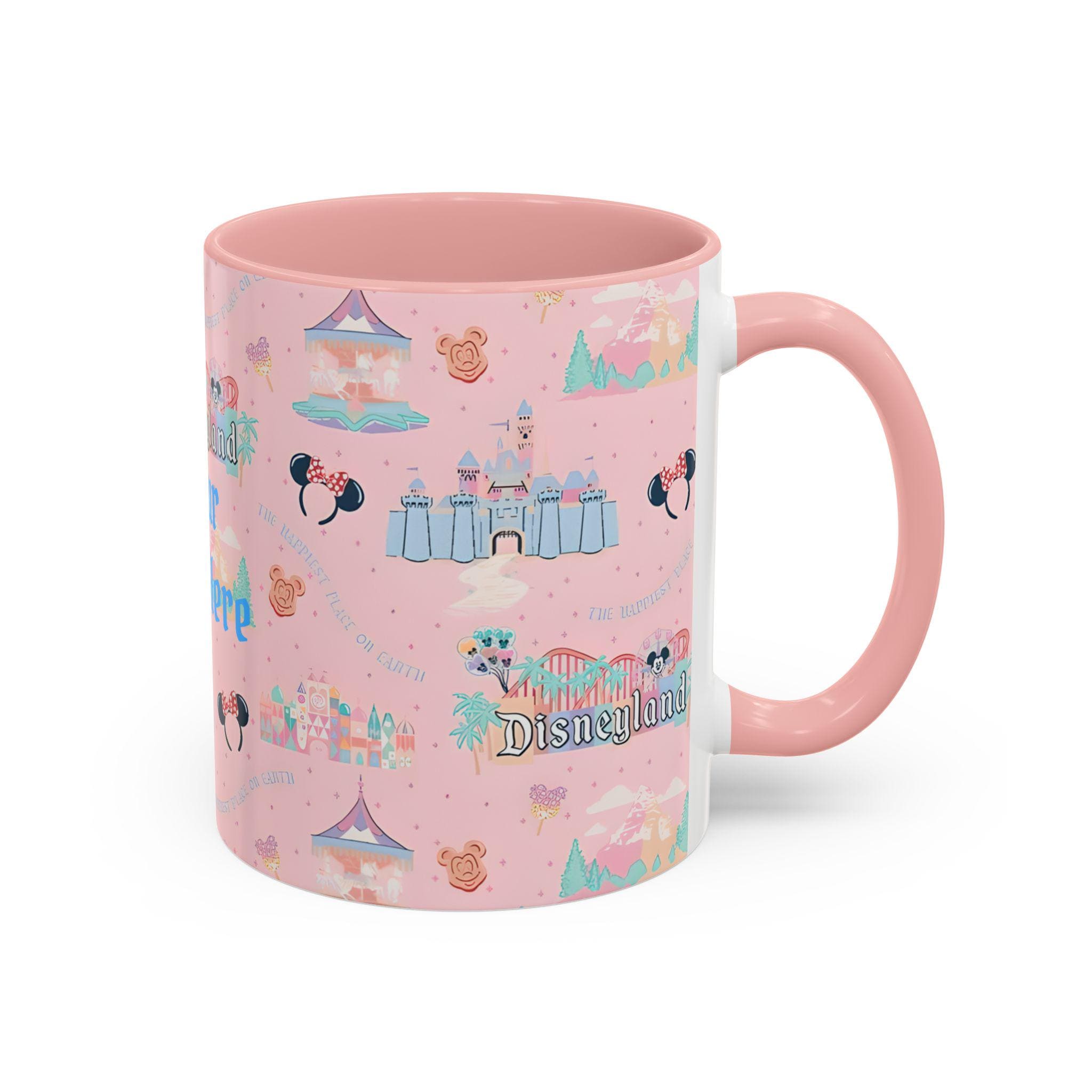 Featuring a charming all-over pattern with iconic park elements, castles, and playful details on a soft pink background, this mug is perfect for adding a little Disney magic to your daily routine.