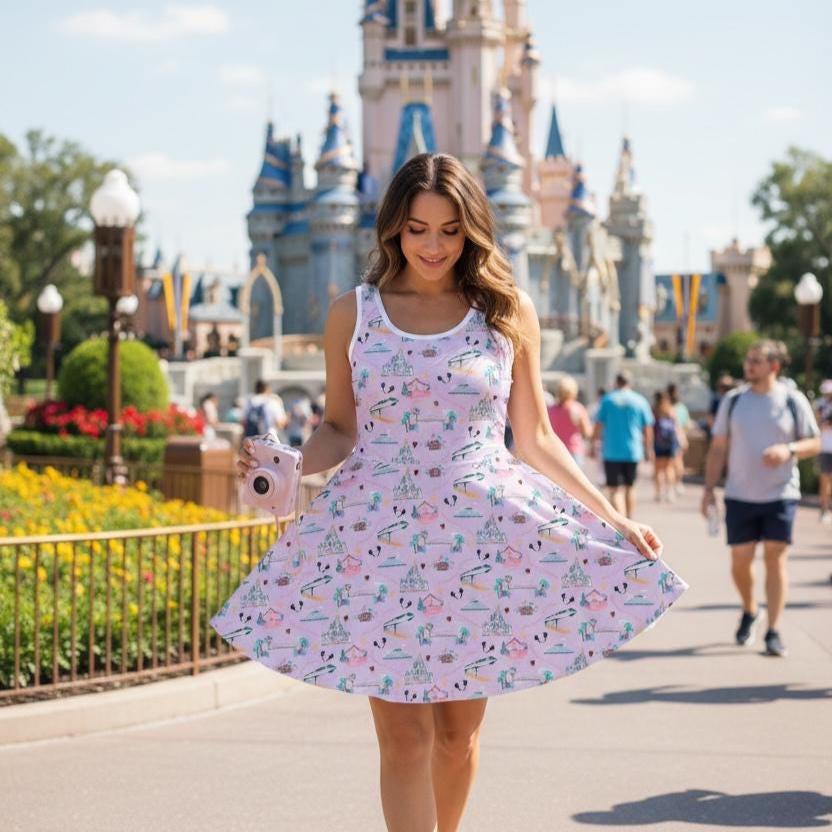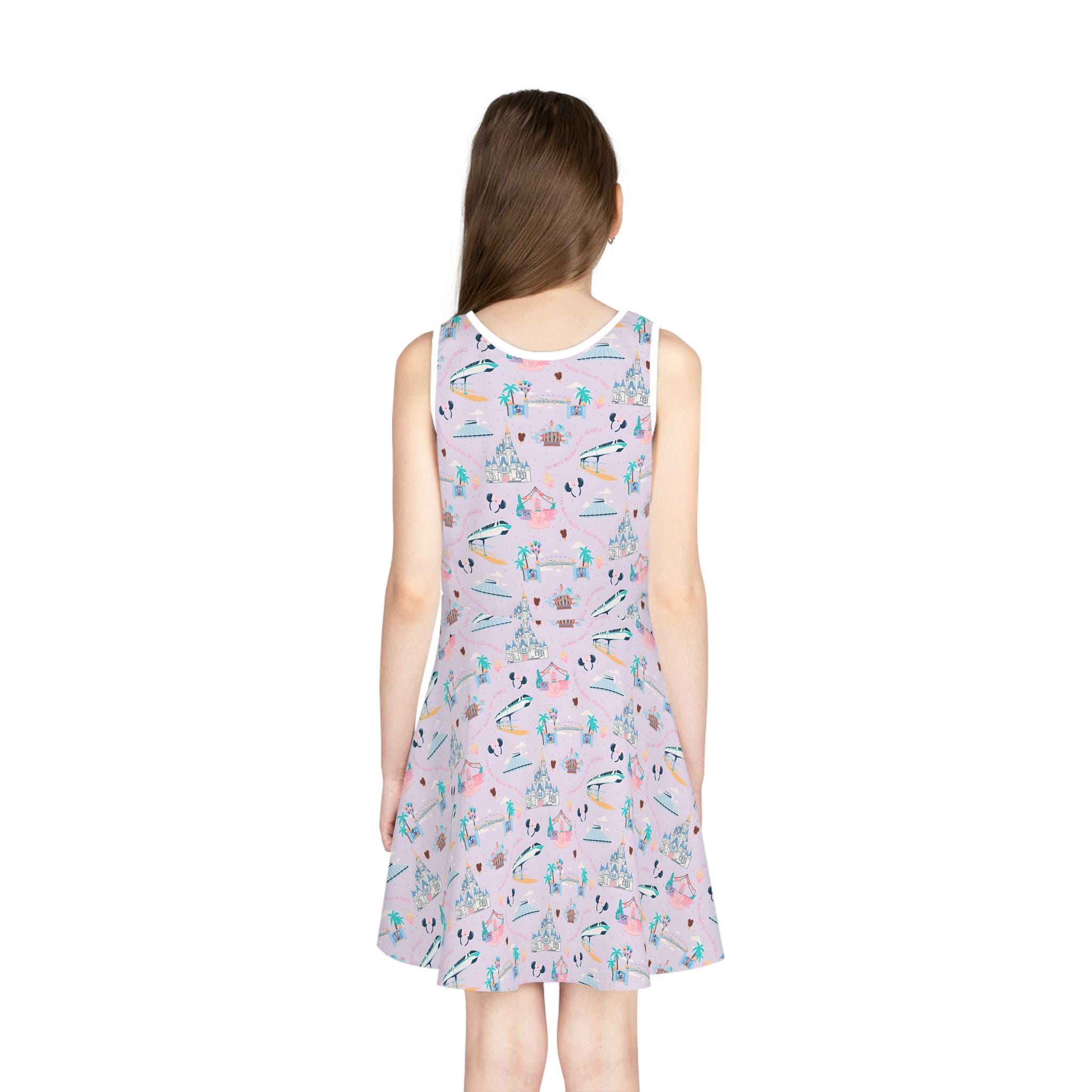 This mid-length sleeveless sundress carries a playful pink fairy-tale print inspired by castle parks and whimsical rides. Lightweight and stretchy, it moves easily through warm days at the park or family outings, the A-line cut giving room to twirl while keeping a neat silhouette. The round neckline and sewn-in label keep the look clean and comfortable, while the medium-weight knit gives structure without feeling stiff. Care gently to preserve the bright pattern and soft hand: use neutral detergent and avoid vigorous rubbing when washing.