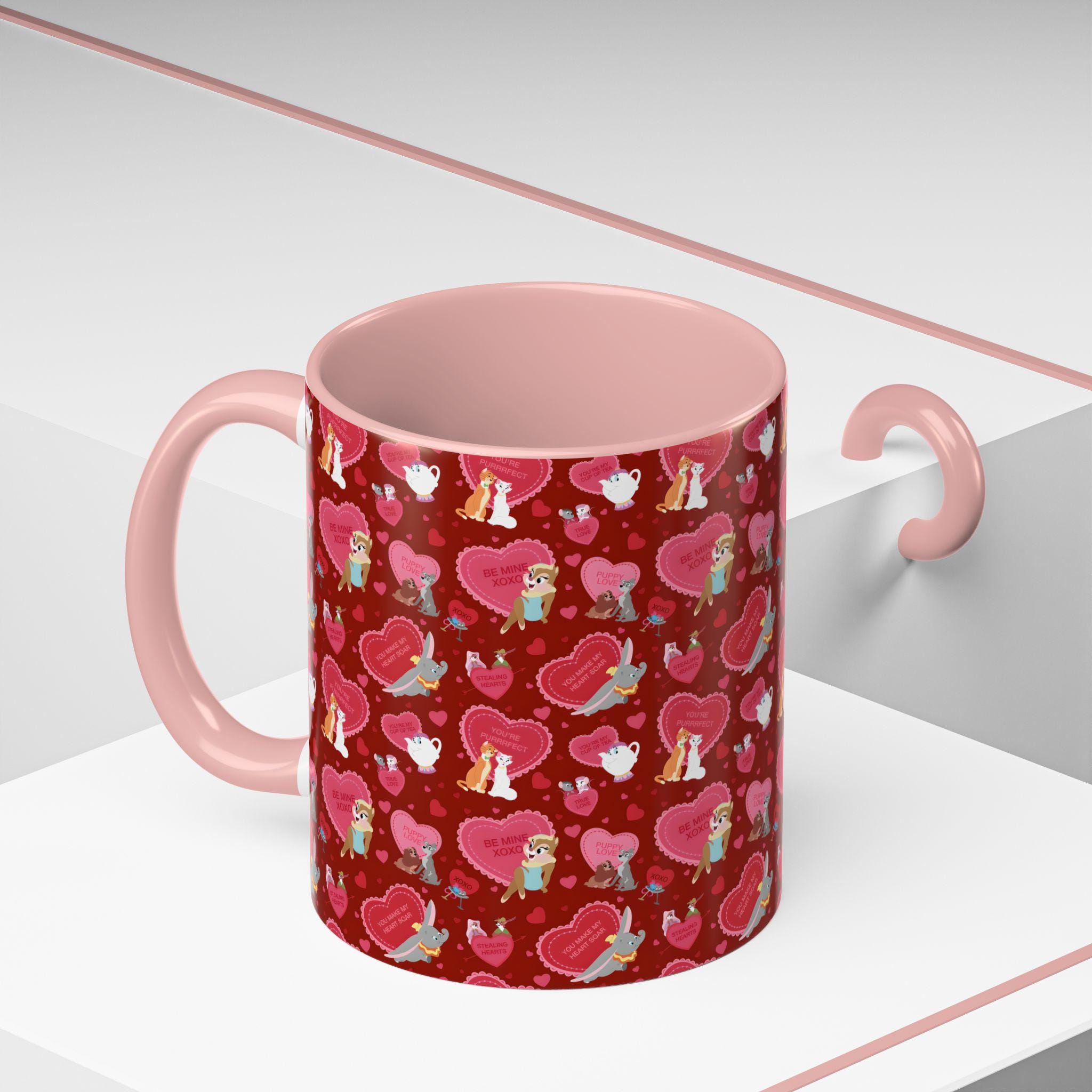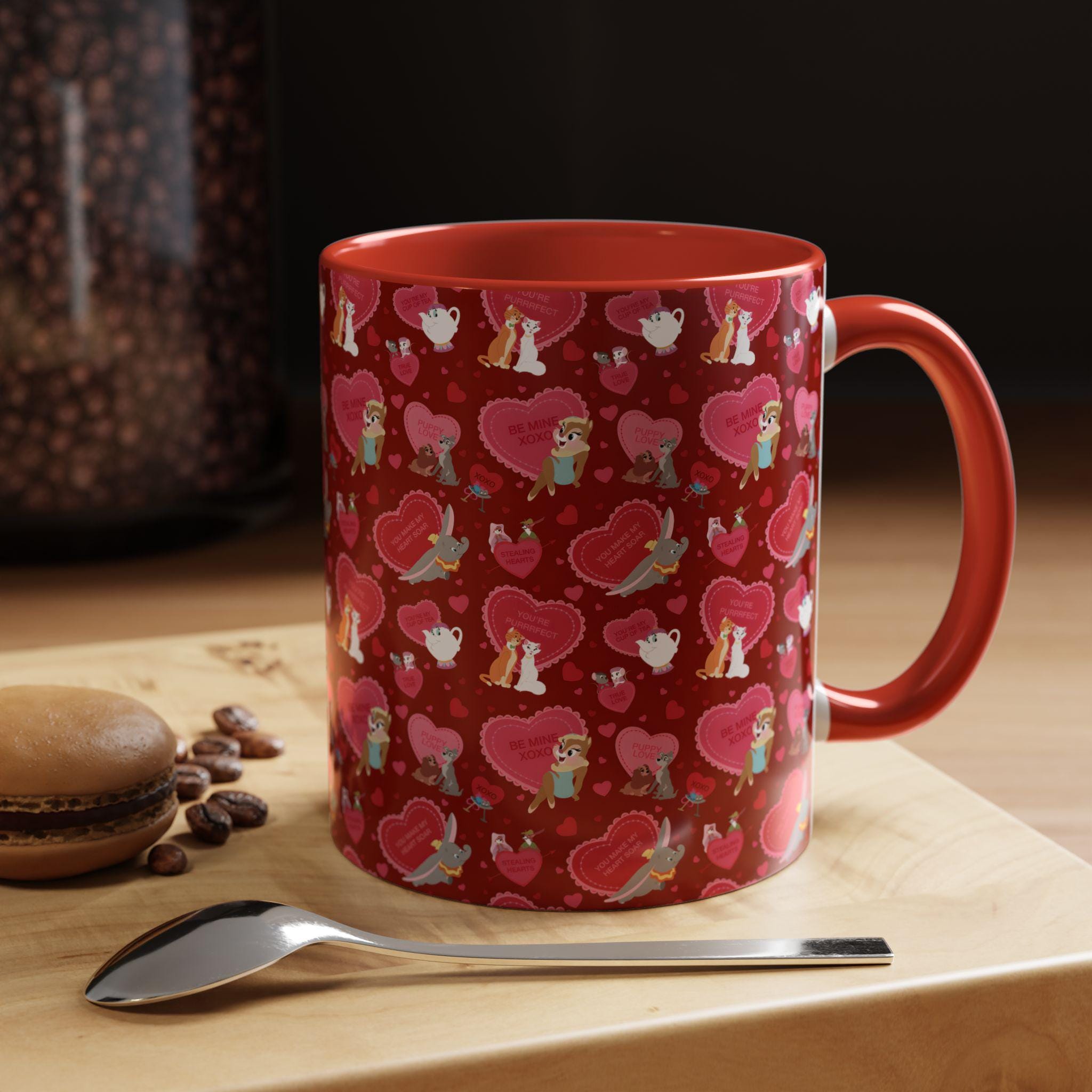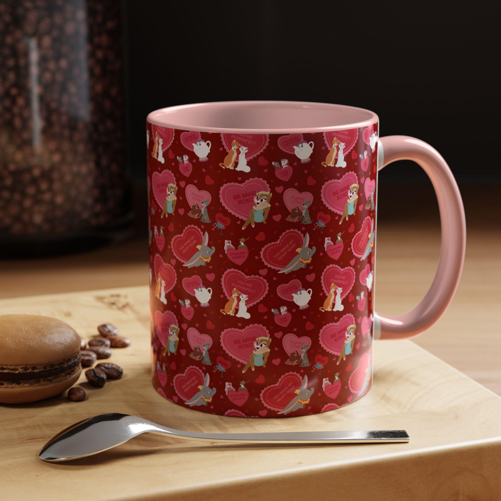 Warmth and whimsy meet over morning coffee. This ceramic mug carries a playful pattern of beloved Disney-style animal couples framed by scattered Valentine hearts. It feels like a small, everyday celebration — a quiet nod to affection while you read messages, plan the day, or share a slow moment with someone. The colored interior and handle add a cheerful pop against the glossy white exterior, making each sip feel a little brighter. Lightweight enough for daily use, the mug slips easily into hands with its comfortable C-handle. The print holds vivid hues wash after wash, so the charm stays with you through breakfasts, movie nights, and cozy afternoons spent together.