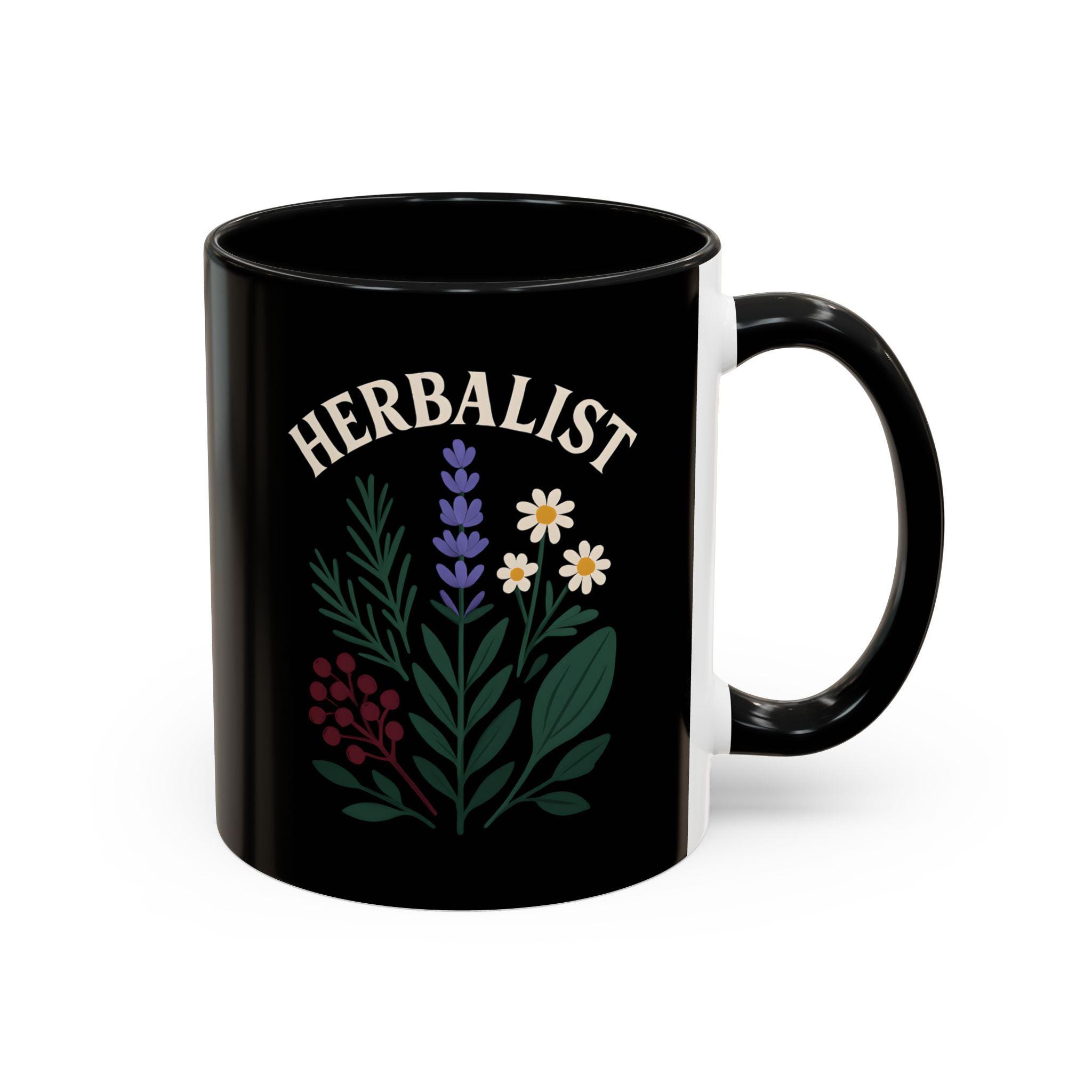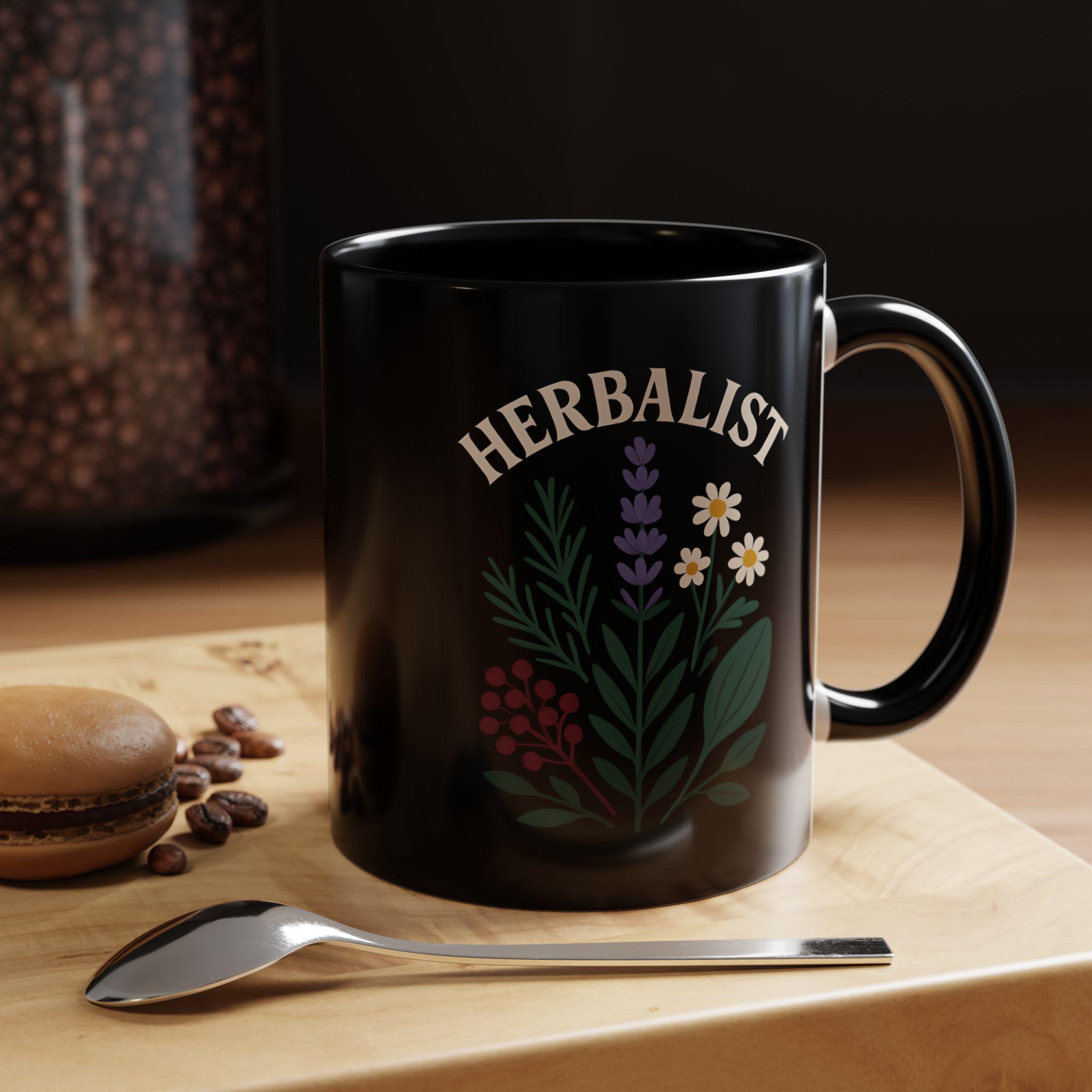 Sip slowly and feel rooted. This ceramic mug carries a hand-drawn bouquet of rosemary, lavender, chamomile and berries beneath the curved title “HERBALIST.” The black glossy background and contrasting colored interior make the floral artwork pop while a comfortable C-handle keeps morning routines calm. Use it for steeped teas, tincture prep, or a quiet moment with brewing herbs — it’s a small ritual vessel for people who love plants and the slow work of making remedies.