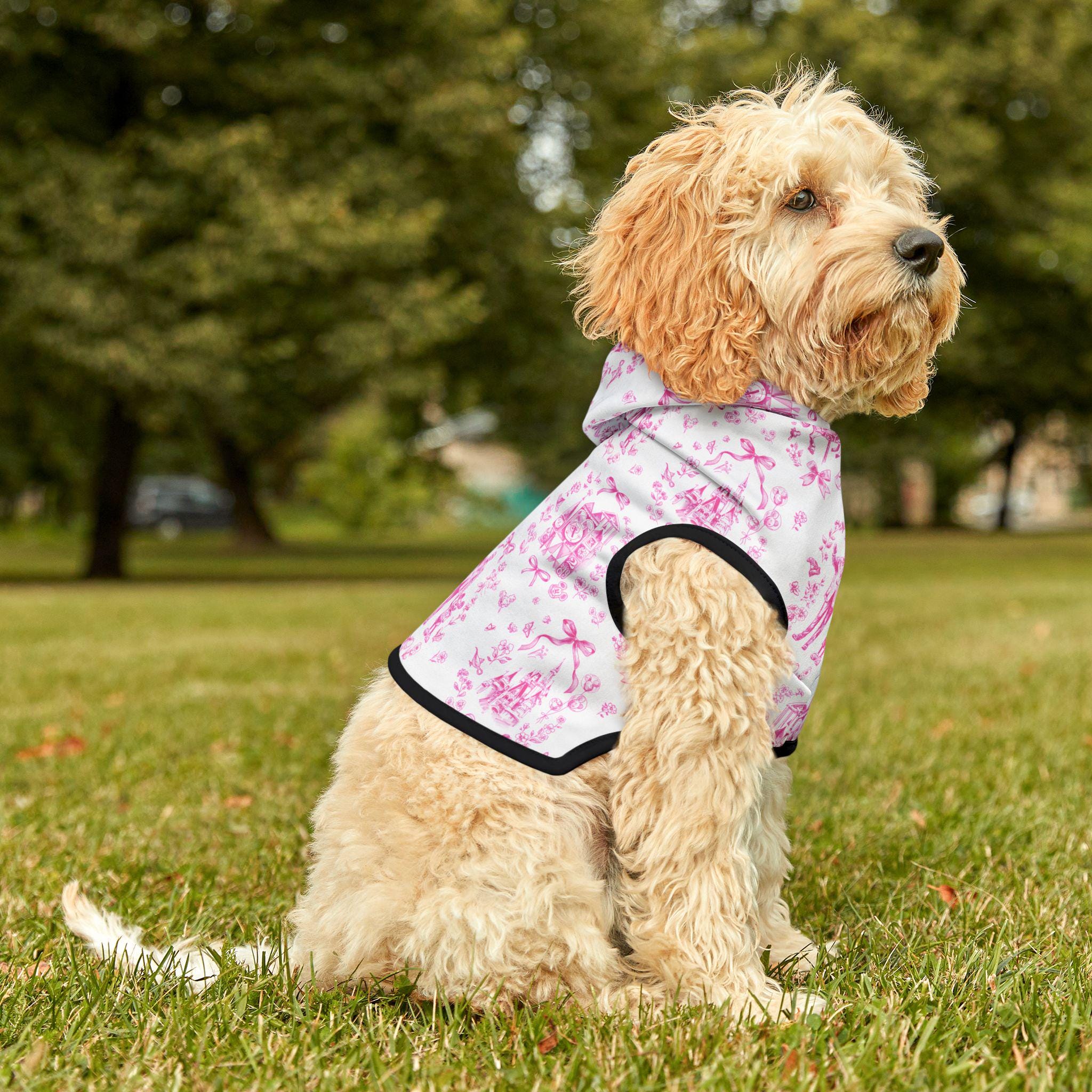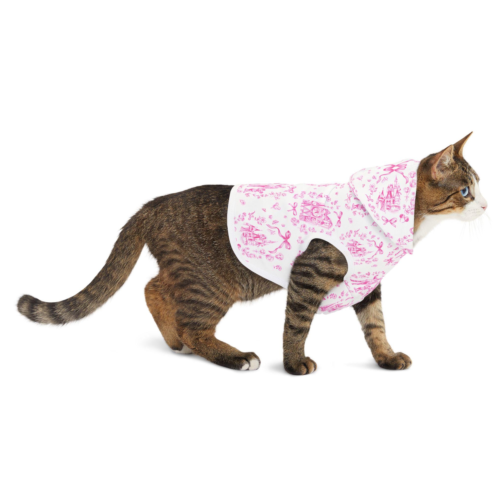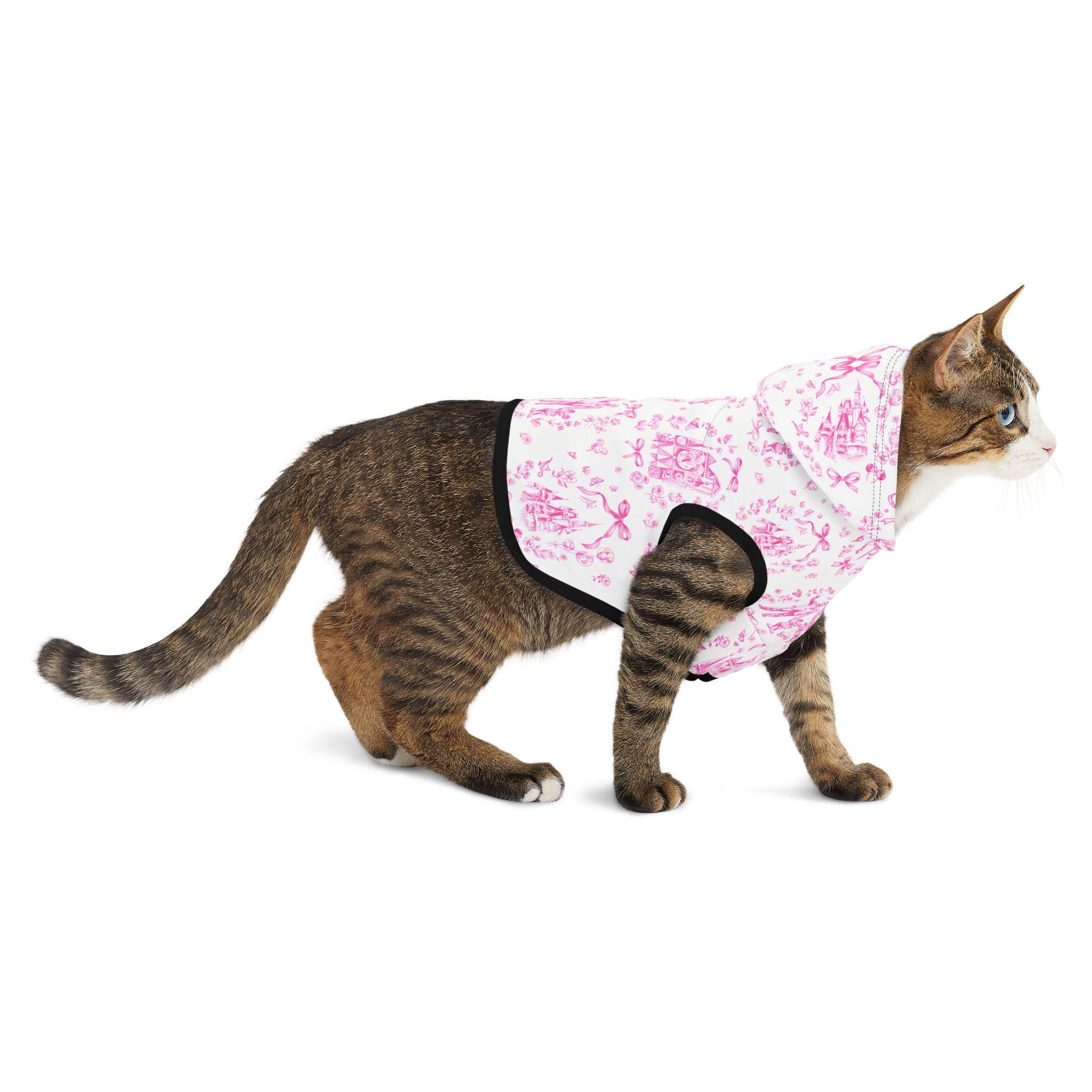 A playful, story-driven pet hoodie that brings a touch of theme-park whimsy to small dogs and cats. The pink toile pattern recalls vintage park illustrations—castles, carousels and tiny icons—scaled down to fit your furry companion. Soft, resilient polyester keeps the print bright and the shape intact during romp sessions and rainy walks. Choose black or white ribbing to suit your pet’s coloring and let the matched seam thread keep the look clean and polished. Lightweight but durable, this hooded sweatshirt slips on easily and stays comfortable for lounging on the couch or wandering around a weekend market. It’s made and assembled in the USA from quality global components, combining playful design with dependable construction for pets who like to be noticed without fuss.