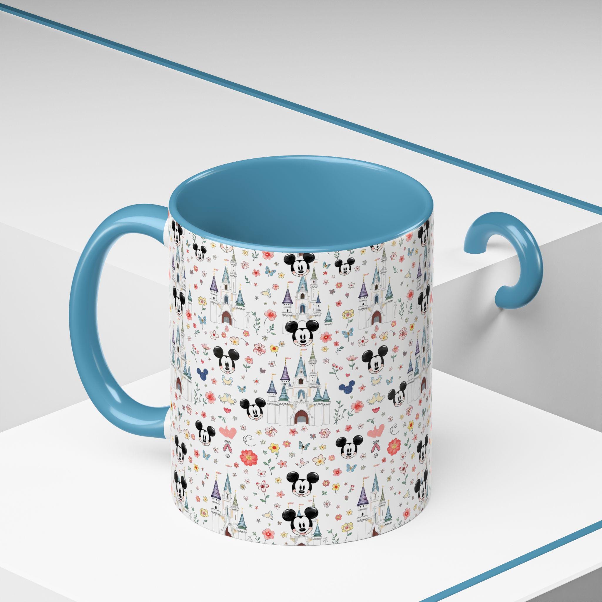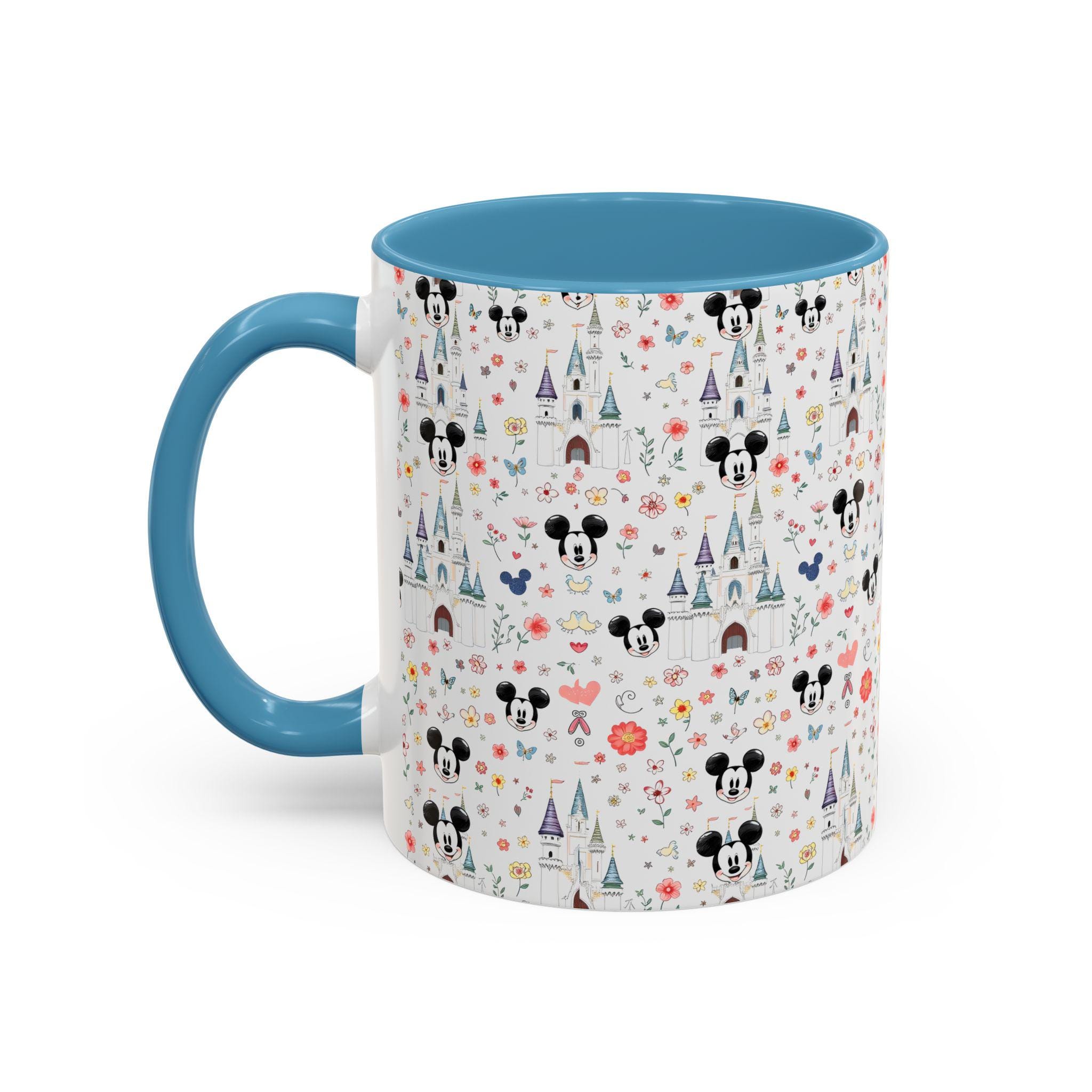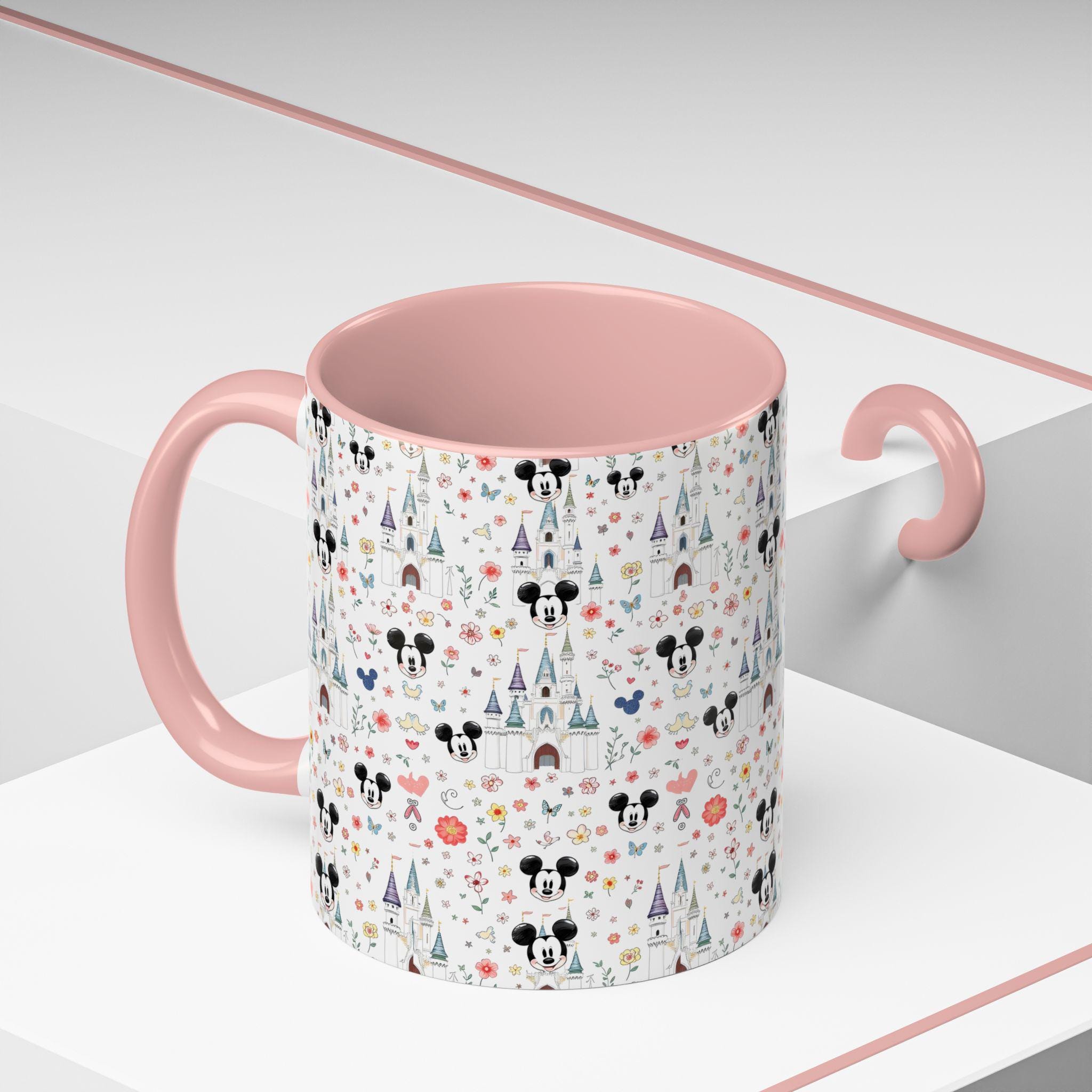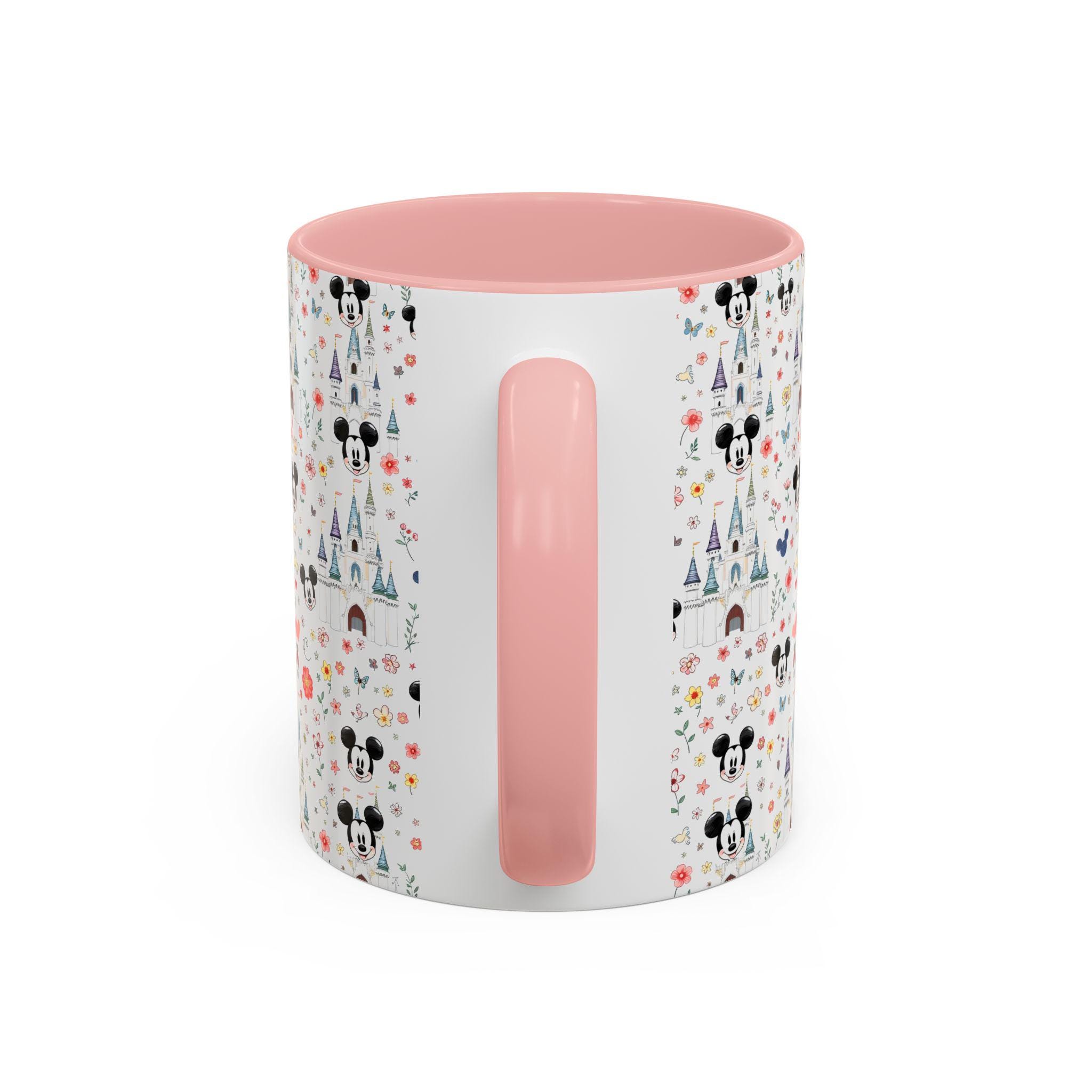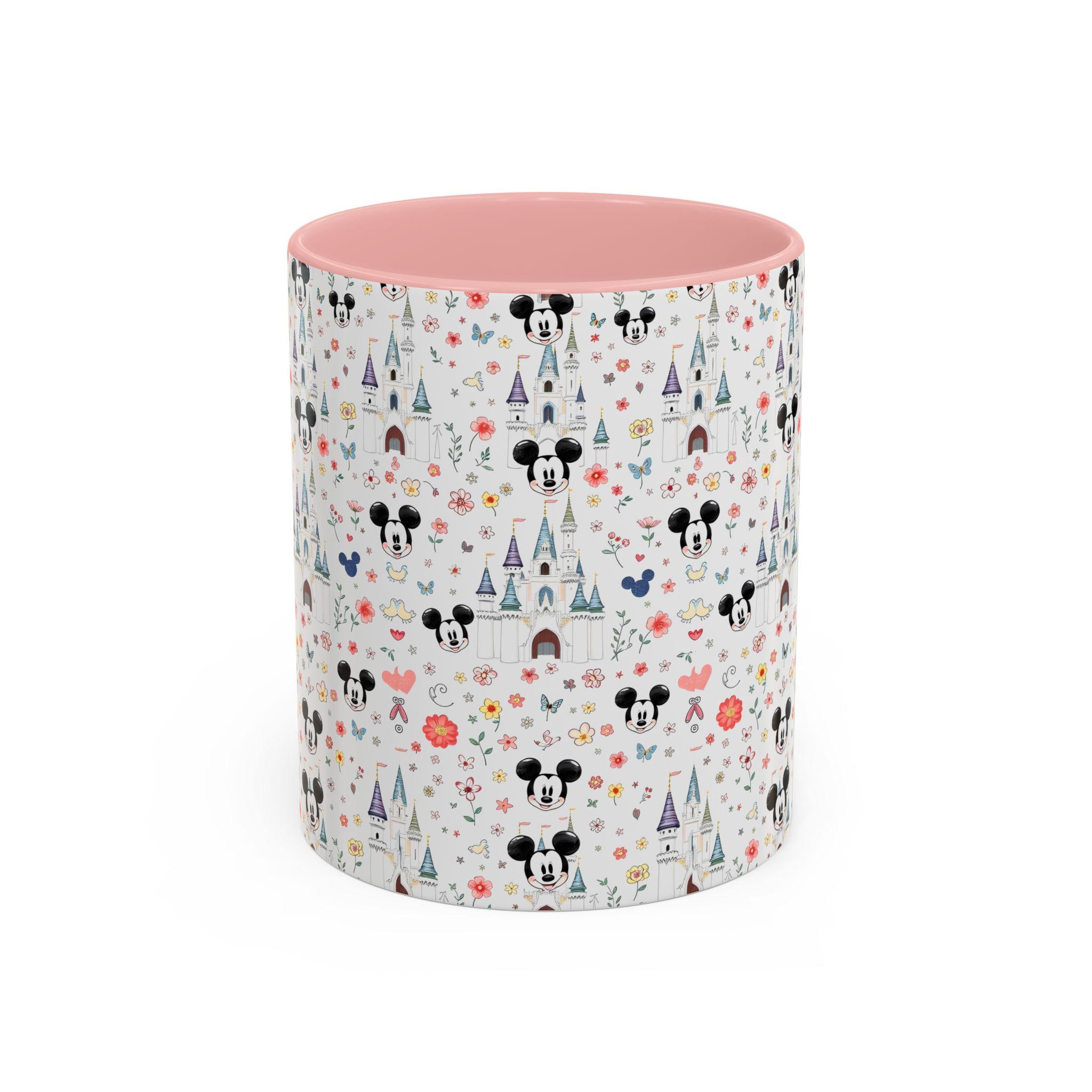 Bright mornings start with a little bit of wonder. This ceramic mug brings a playful, storybook charm to your everyday routine — tiny castle spires, whimsical florals, and cheerful mouse silhouettes scatter across a glossy white canvas, while a soft pink interior and handle add a gentle pop. It feels like a sip of nostalgia: warm, lighthearted, and quietly joyful. Slide it into your hands before a slow weekend breakfast, tuck it into your desk setup for a cheerful workday companion, or bring it along on cozy movie nights when you want something that looks as sweet as the drink inside.