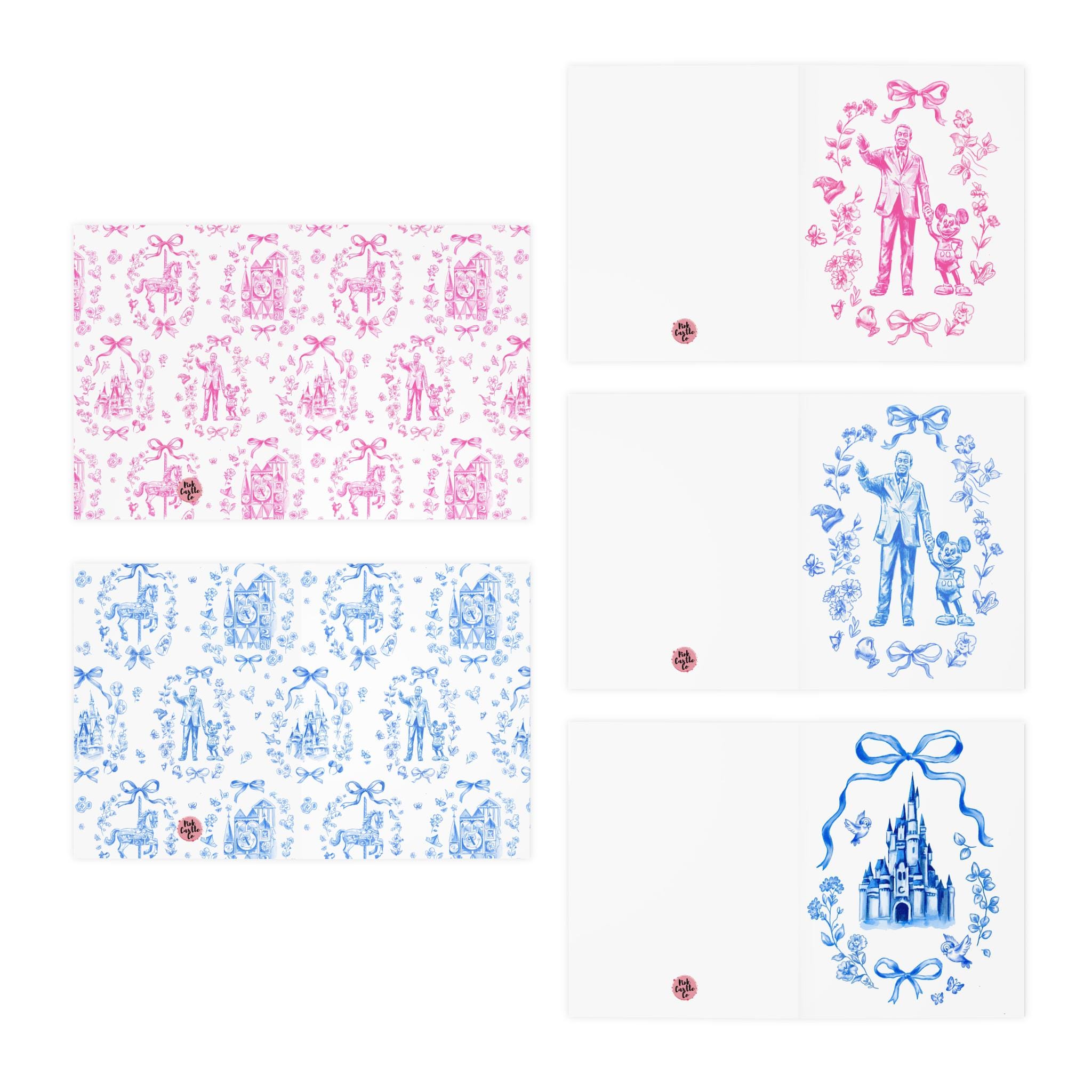 These are thoughtfully illustrated greeting cards printed on heavyweight 271gsm uncoated paper for a soft, tactile finish that takes ink beautifully. The set includes five different disney inspired designs — delicate toile-style vignettes in romantic blue and pink inks featuring disney inspired elegant figures, small animals, floral wreaths and a fairytale castle framed with ribbon bows. Each card arrives with a matching white envelope and is assembled in the USA from globally sourced parts. Use them to write a personal note, tuck inside a gift, or send a small, artful hello that feels handcrafted and sincere.