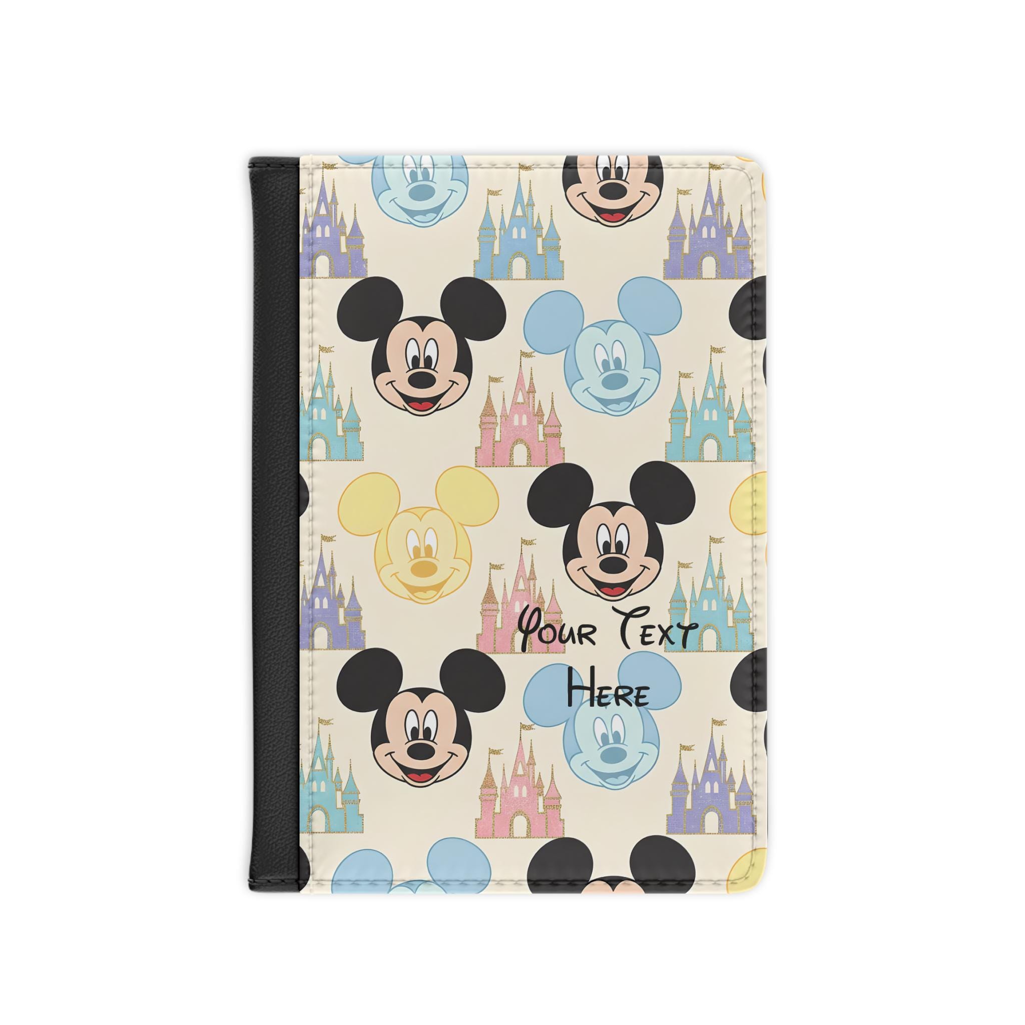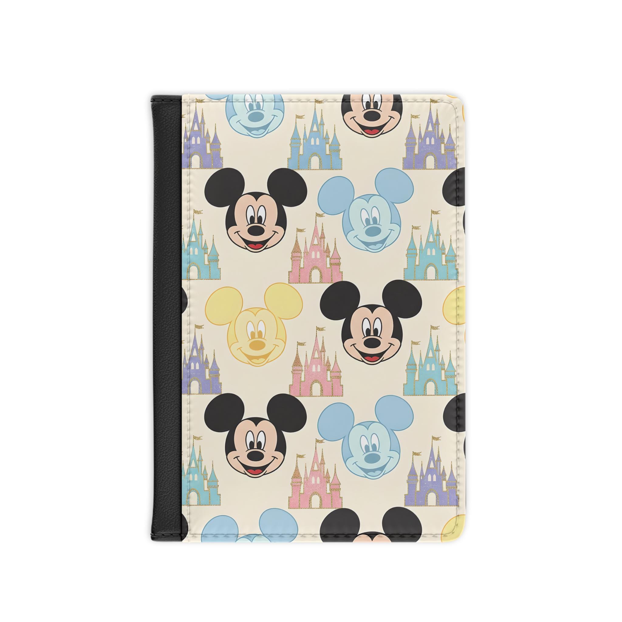 Bright, cheerful, and travel-ready — this passport cover brings a playful pop of color to every journey. The front features a lively pattern of friendly mouse faces and pastel castles printed with high-definition inks on smooth black PU faux leather, personalisation available. Inside, smartly arranged pockets keep a passport, boarding pass, cards, and a little cash organized. RFID blocking layers add a quiet layer of security so you can move through crowded terminals with less worry. Lightweight and compact, it slips into a tote or carry-on while standing out on the luggage carousel.