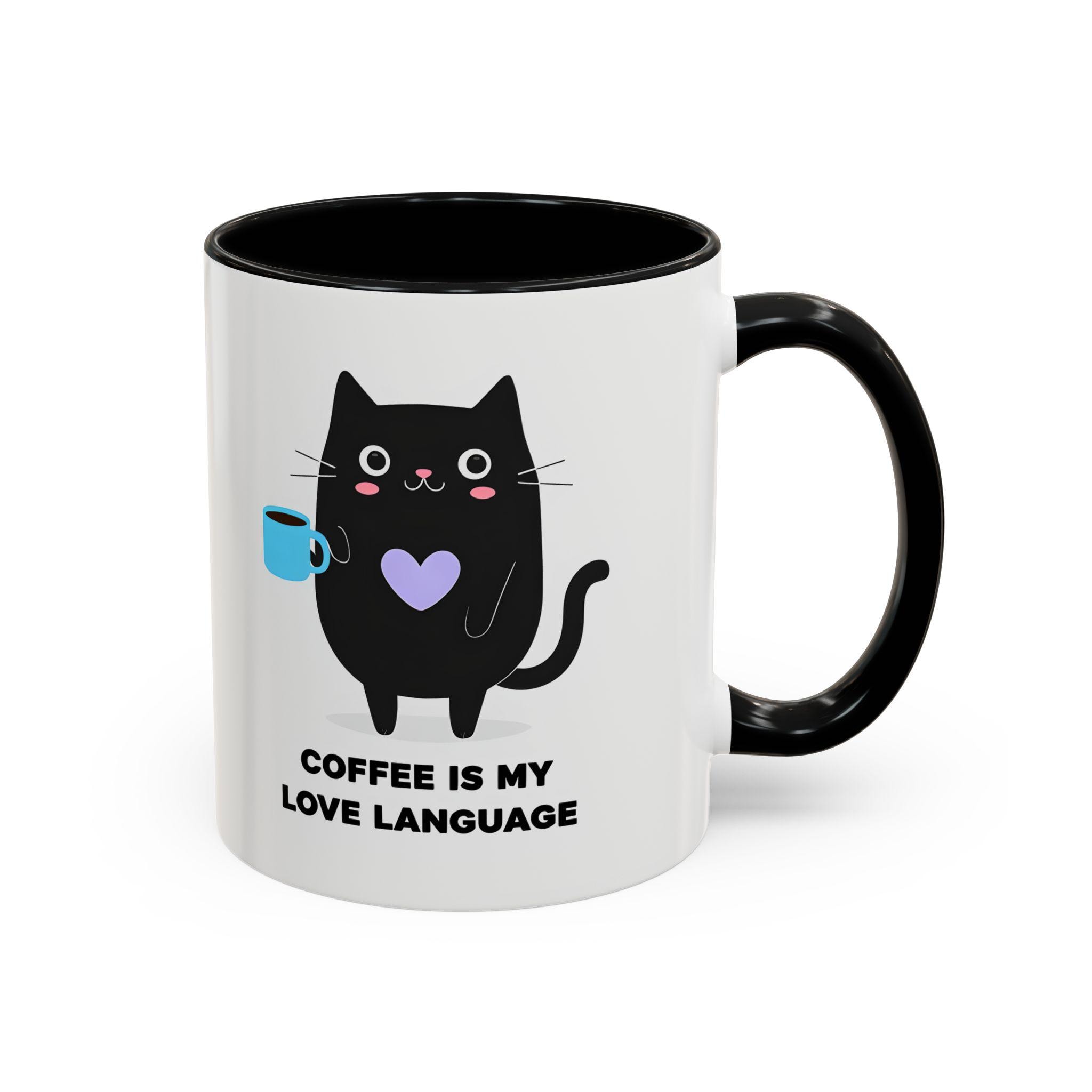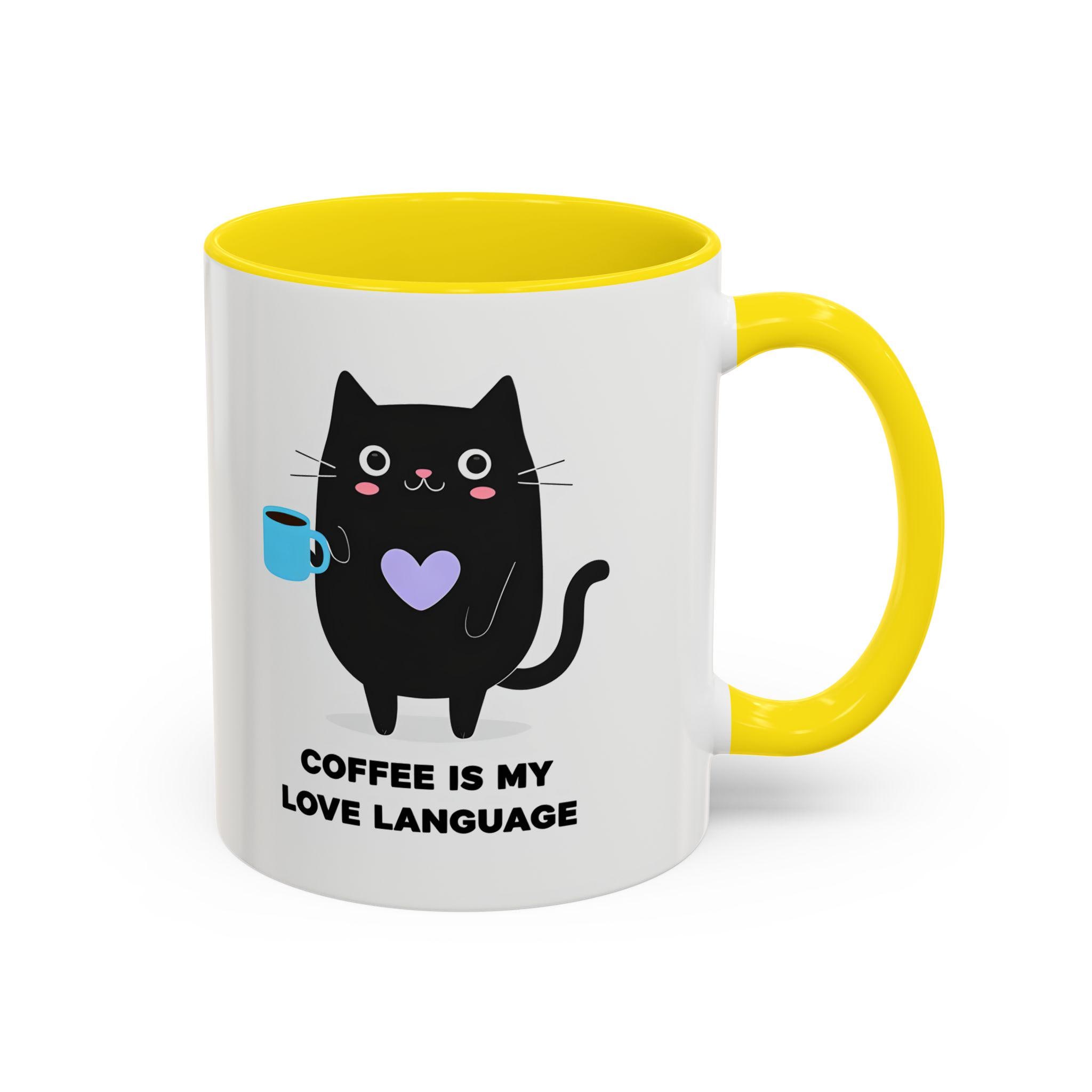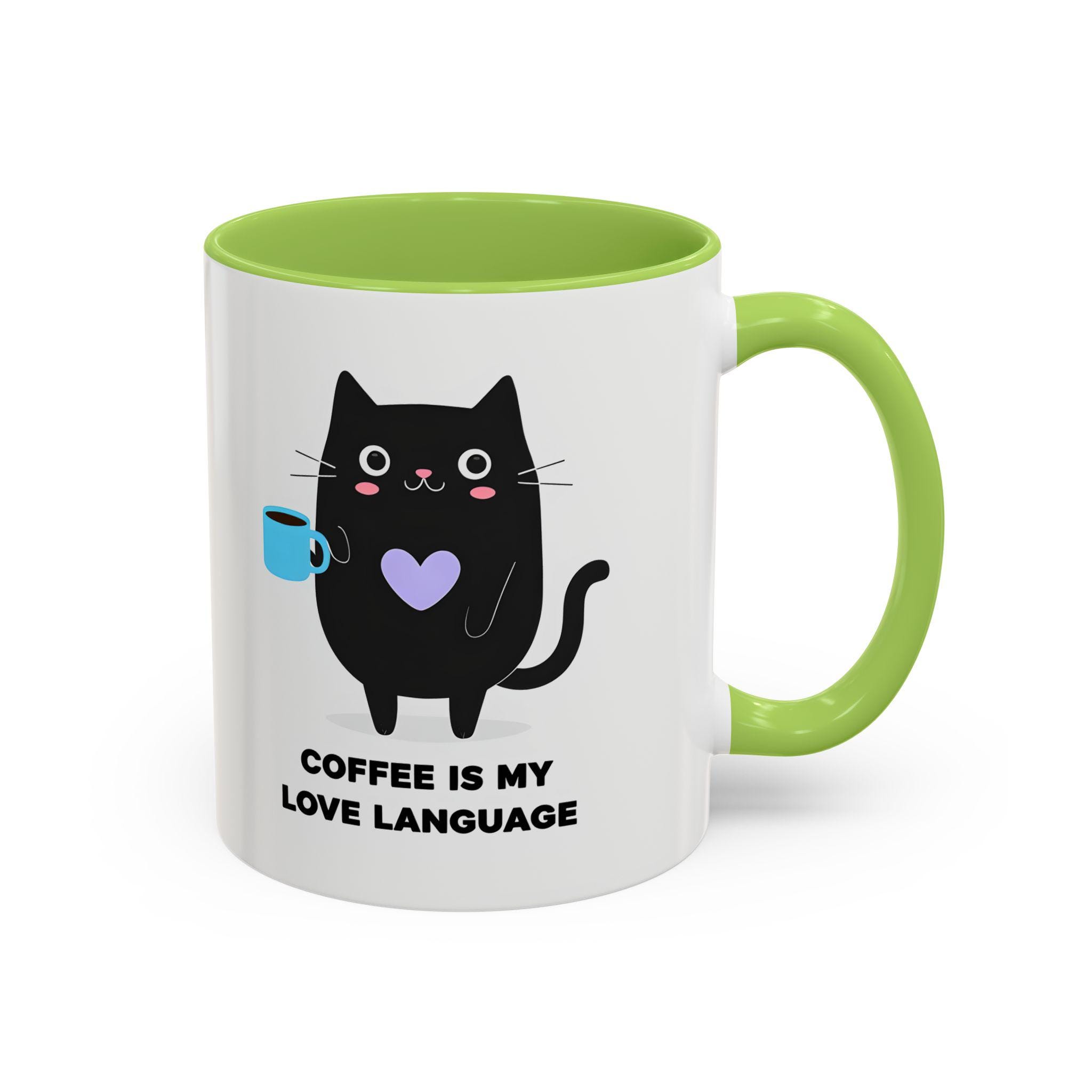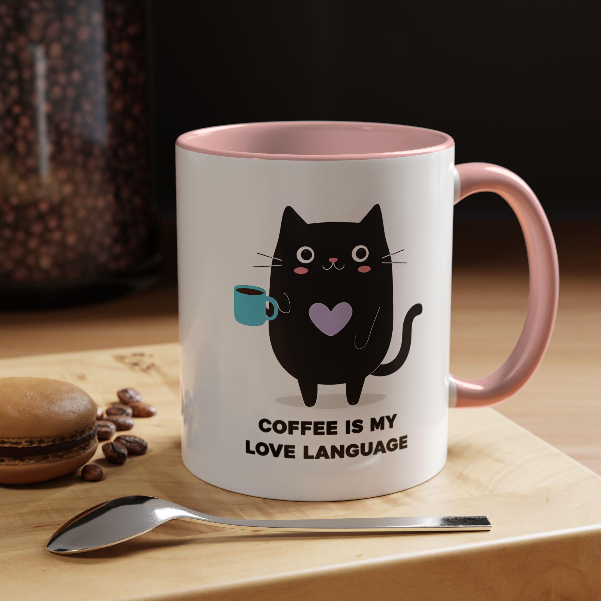 Steam curls up from fresh coffee. A contented cat stretches beside the mug, tail flicking as the first sip warms your hands. This accent coffee mug brings that quiet morning ritual to life — bright color inside, glossy white outside, and a playful script that reads “Coffee Is My Love Language” alongside a simple cat illustration. It’s the kind of mug you reach for when you want a small, honest pleasure: robust coffee, a warm grip, and a little feline companionship. Fits easily on a kitchen shelf or desk, and its cheerful interior color adds a spark to slow mornings, cozy evenings, or that mid-afternoon reset when work lovers need a soft, familiar pause.