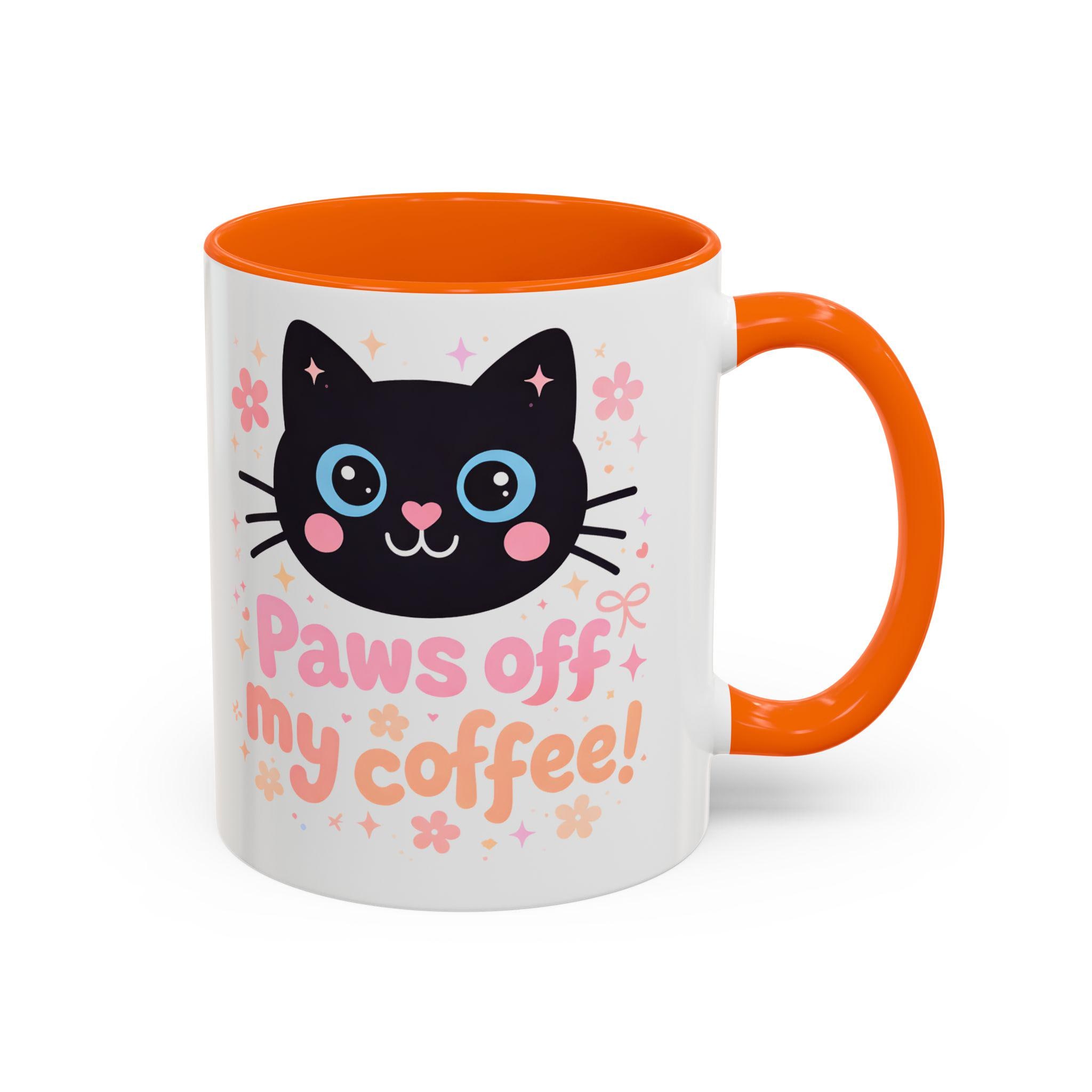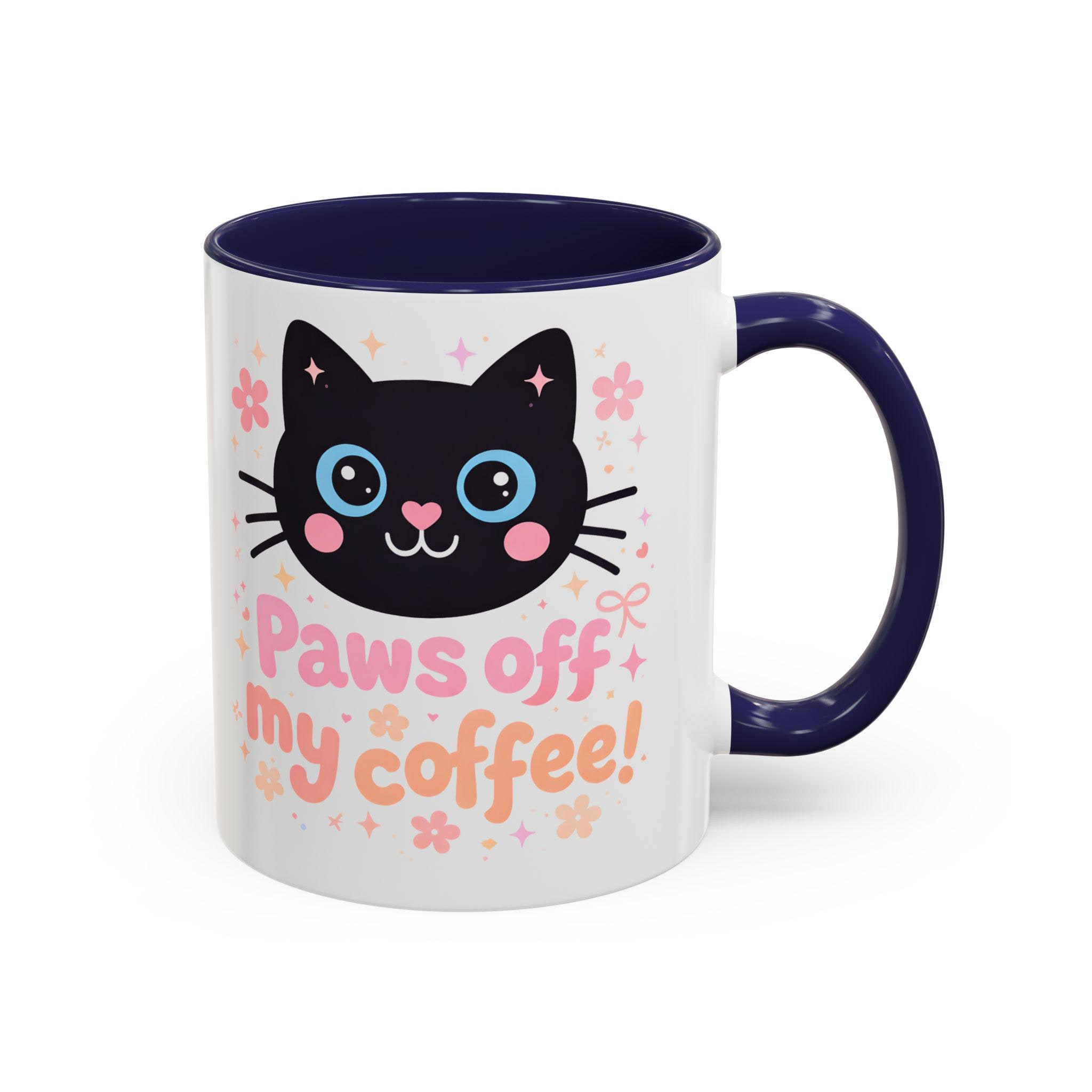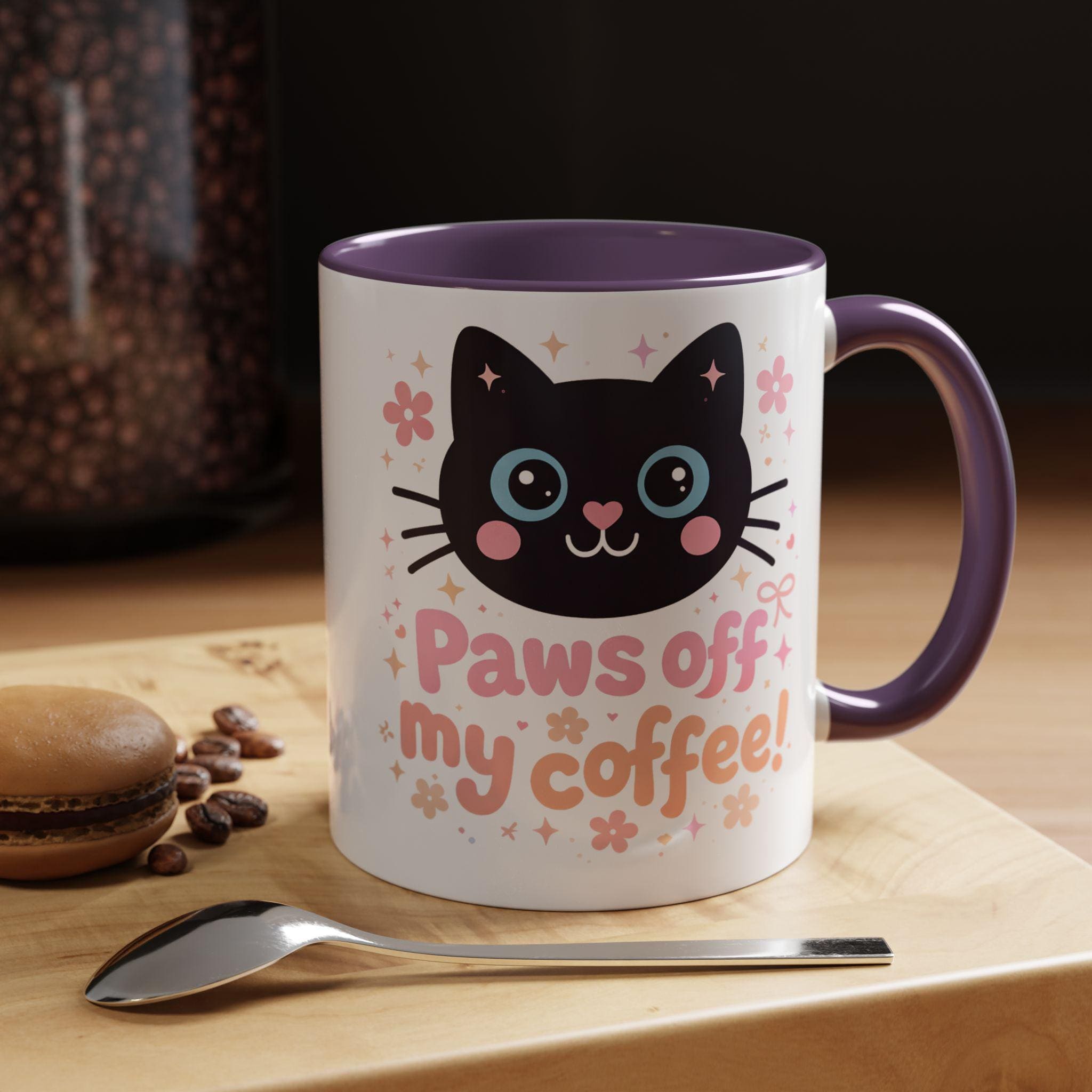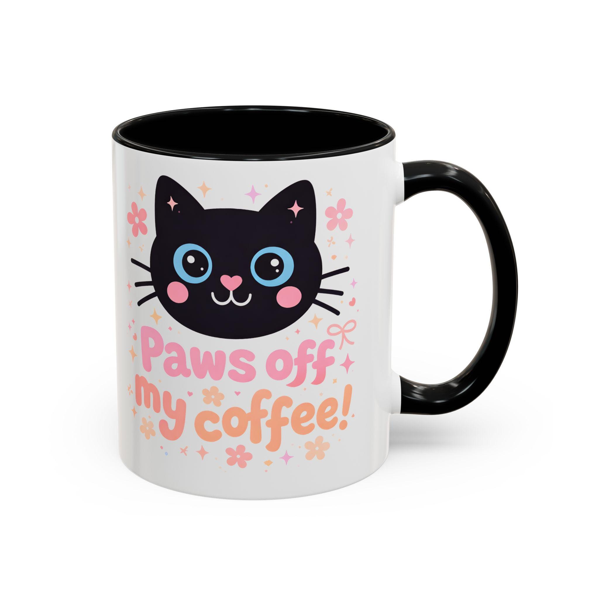 Bright and playful ceramic mug featuring an adorable black cat face and the cheeky phrase “Paws off my coffee!” Soft pastel flowers and blush accents wrap the design, creating a sweet, slightly sassy vibe that lifts a morning routine. The colored interior and handle add a pop of contrast against the glossy white exterior, making the illustration stand out. Comfortable C-shaped handle and two size options let you tailor your morning pour. Dishwasher- and microwave-safe with vibrant print quality, this mug brings a little feline charm and personality to coffee, tea, or cocoa moments.