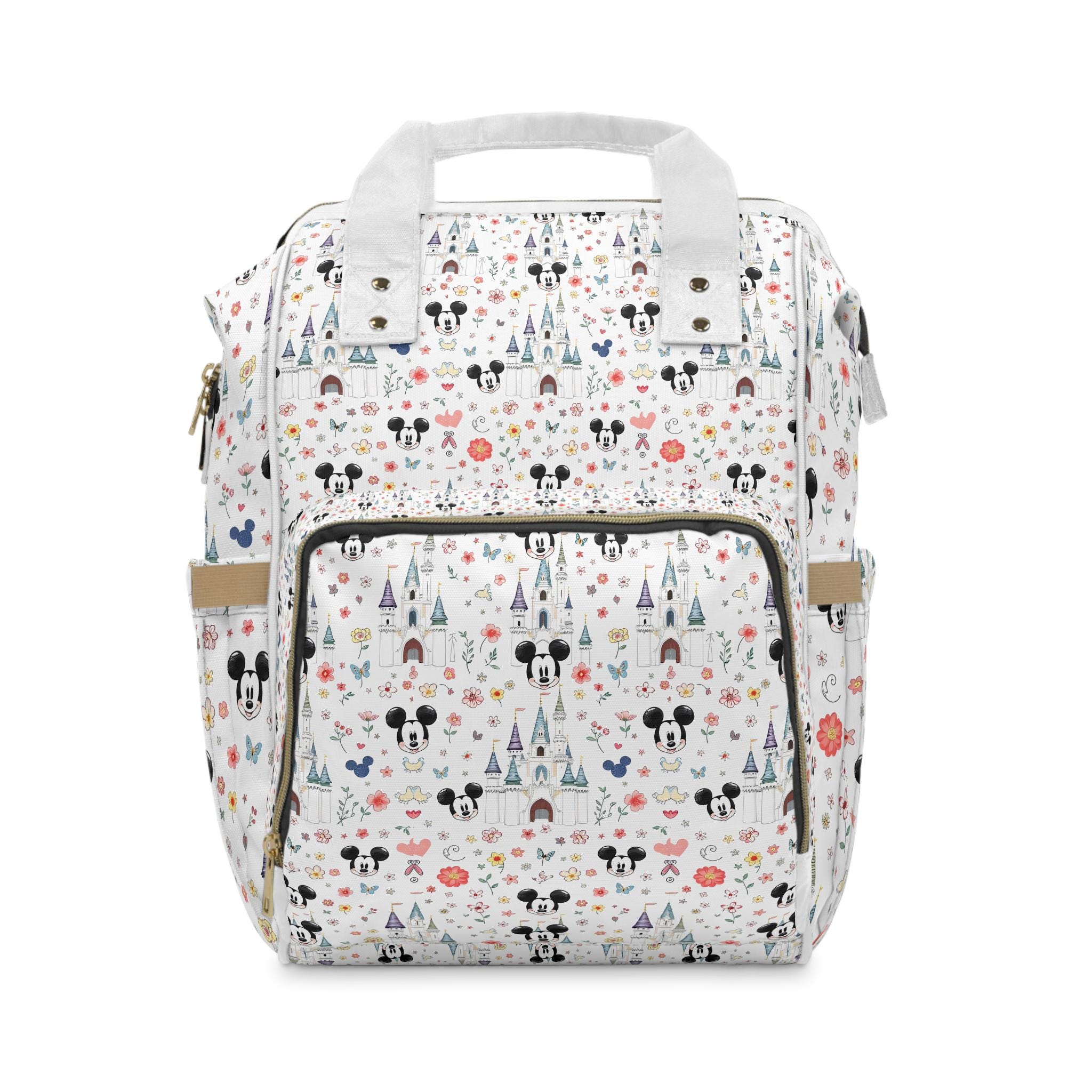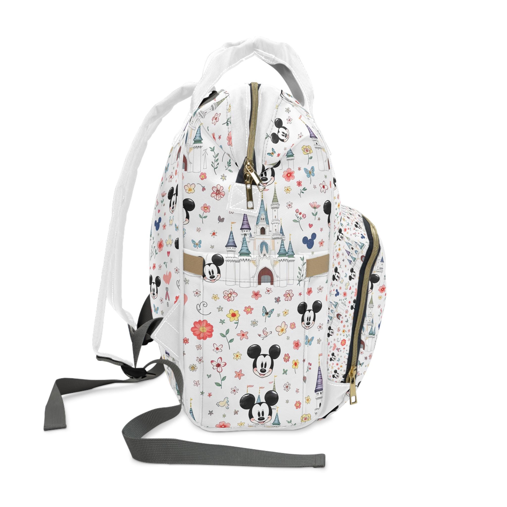 Light, bright, and built for the little-adventure days. This diaper backpack carries more than diapers — it carries snacks, spare outfits, favorite toys, and the calm of being organized. The whimsical castle-and-mouse print softens the practical shape, turning an everyday carryall into a cheerful companion for stroller walks, theme-park hours, and neighborhood outings. Cushioned straps and a padded back make errands feel less like work. Multiple pockets keep bottles upright, wipes within reach, and the changing essentials easy to find so you can focus on the small moments that matter.