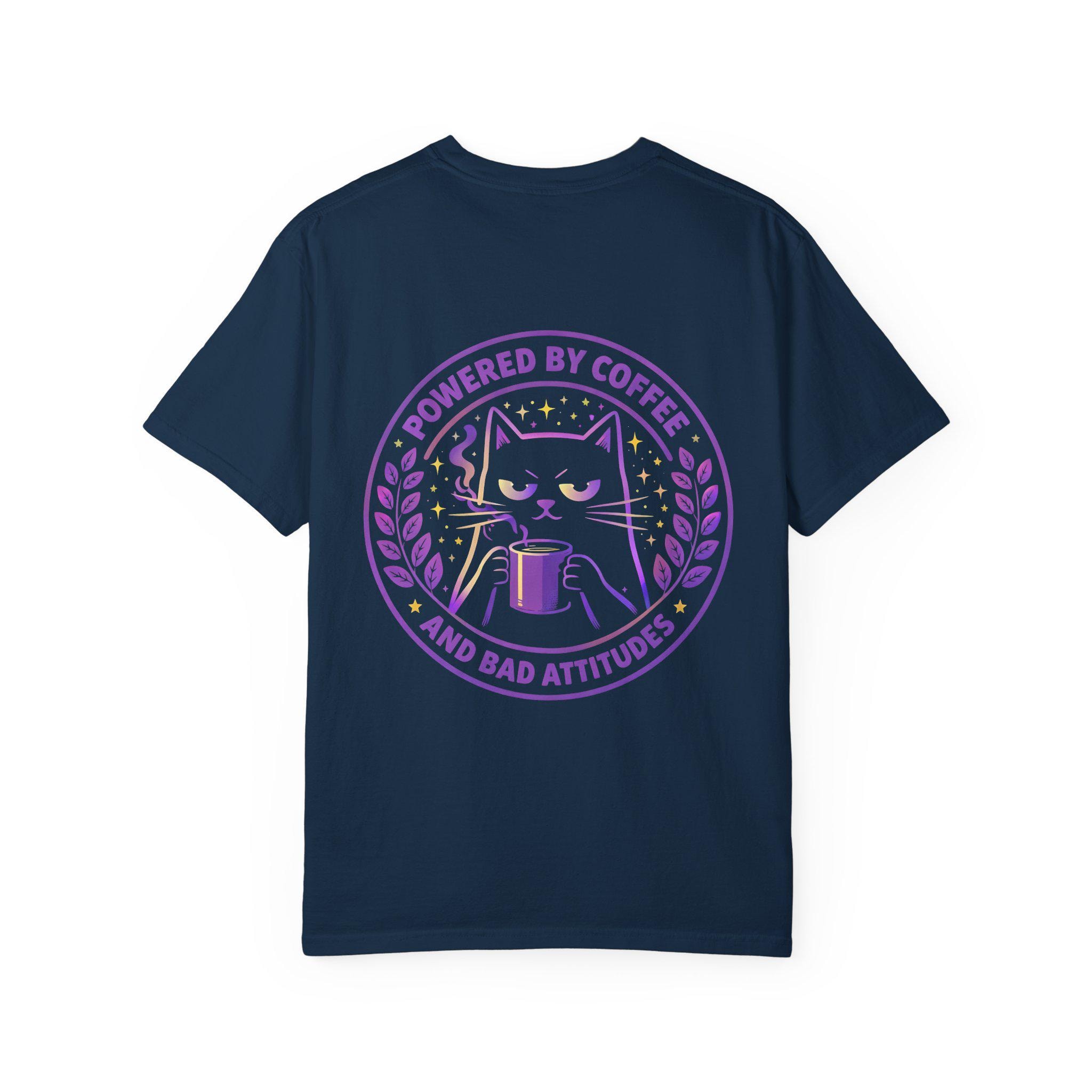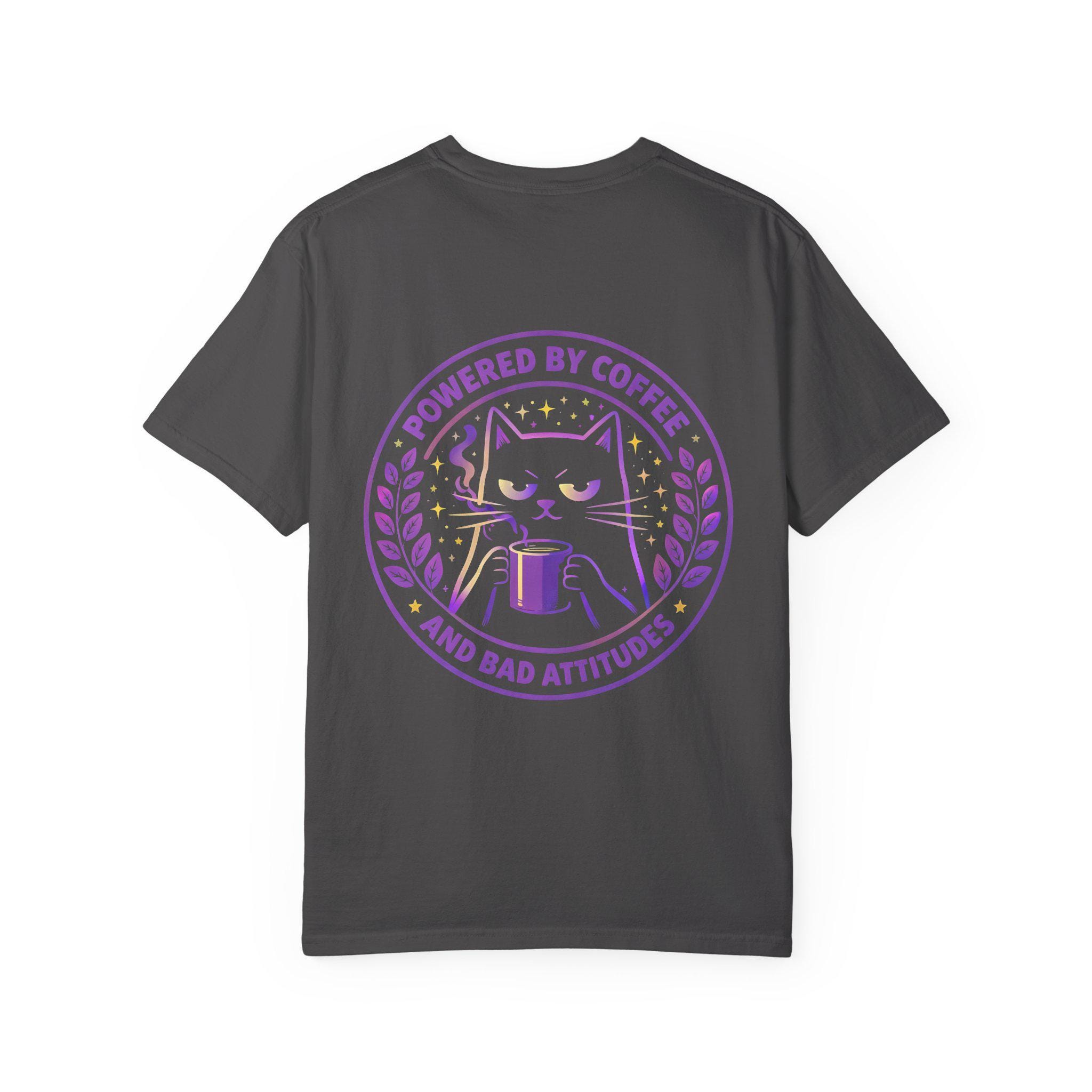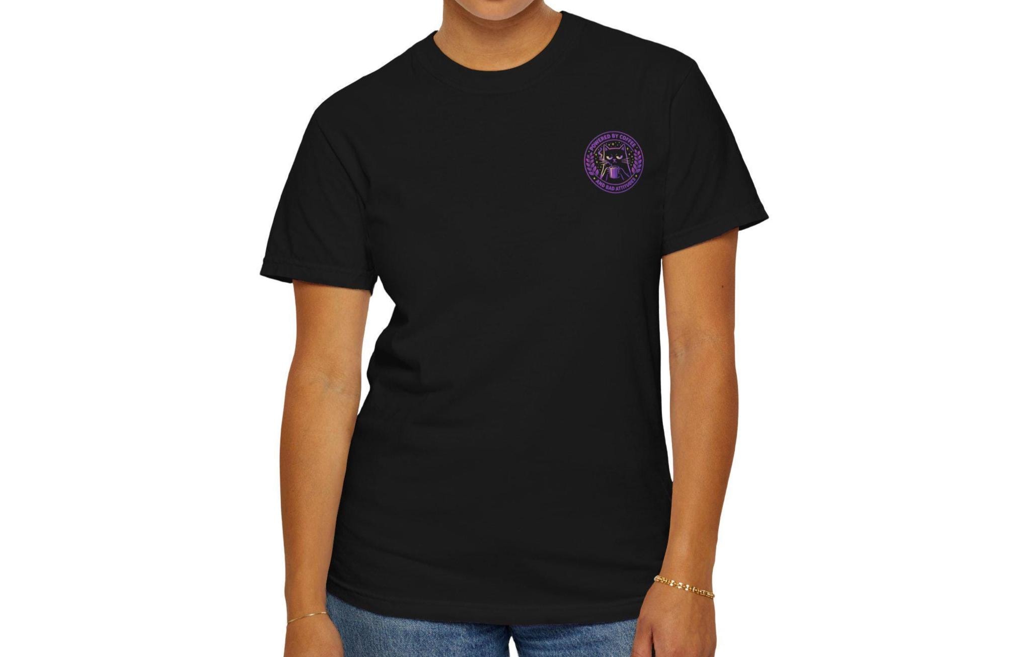 This heavyweight garment-dyed tee feels lived-in from the first wear. The relaxed cut drapes easily over layers or stands alone as a cozy statement piece. On the back, a bold purple-and-lime emblem shows a unimpressed cat clutching a steaming mug beneath the words “Powered by Coffee and Bad Attitudes,” while a small matching badge sits over the heart. It’s the kind of shirt you reach for when you want comfort and a little sarcastic armor for mornings, long shifts, or slow weekends. The soft, pre-shrunk cotton and garment-dyed finish give the color depth and a worn-in softness that only gets better with time. Available in a wide range of sizes and colors so you can pick the vibe that fits your routine.
