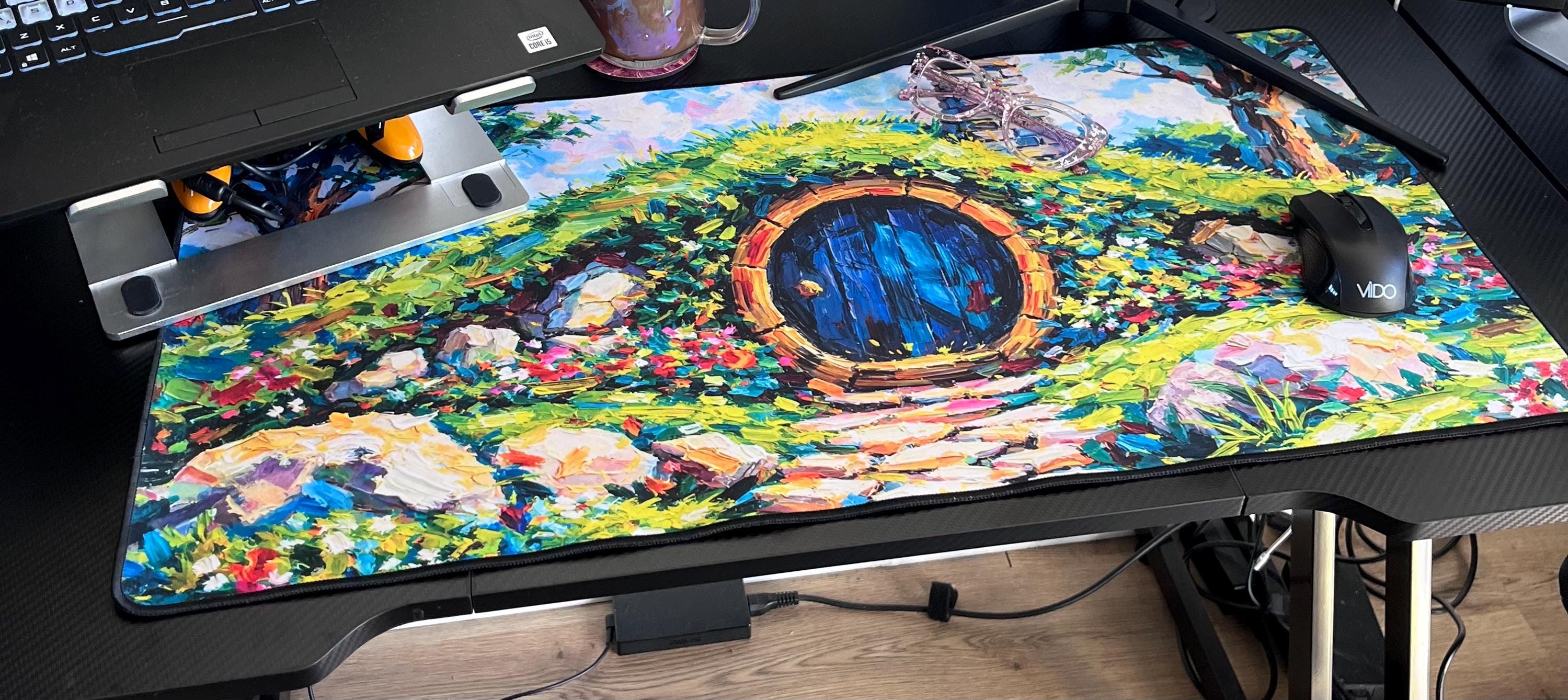 Bring a quiet corner of the Shire to your workspace with this Hobbit Hole Landscape desk mat. Soft, detailed artwork wraps the surface in rolling green hills, a round door half-hidden by ivy, and warm golden light spilling from a cottage window. Roll it out beneath your keyboard and mouse to anchor your desk in storybook calm. The smooth, durable surface makes cursor movement whisper-quiet, while the natural rubber base keeps everything steady as you sketch, game, or write. For evenings spent journaling by lamplight or long creative sessions on a rainy Saturday, this mat feels like a tiny home for your hands and tools—a slice of cozy fantasy stitched into your everyday routine.