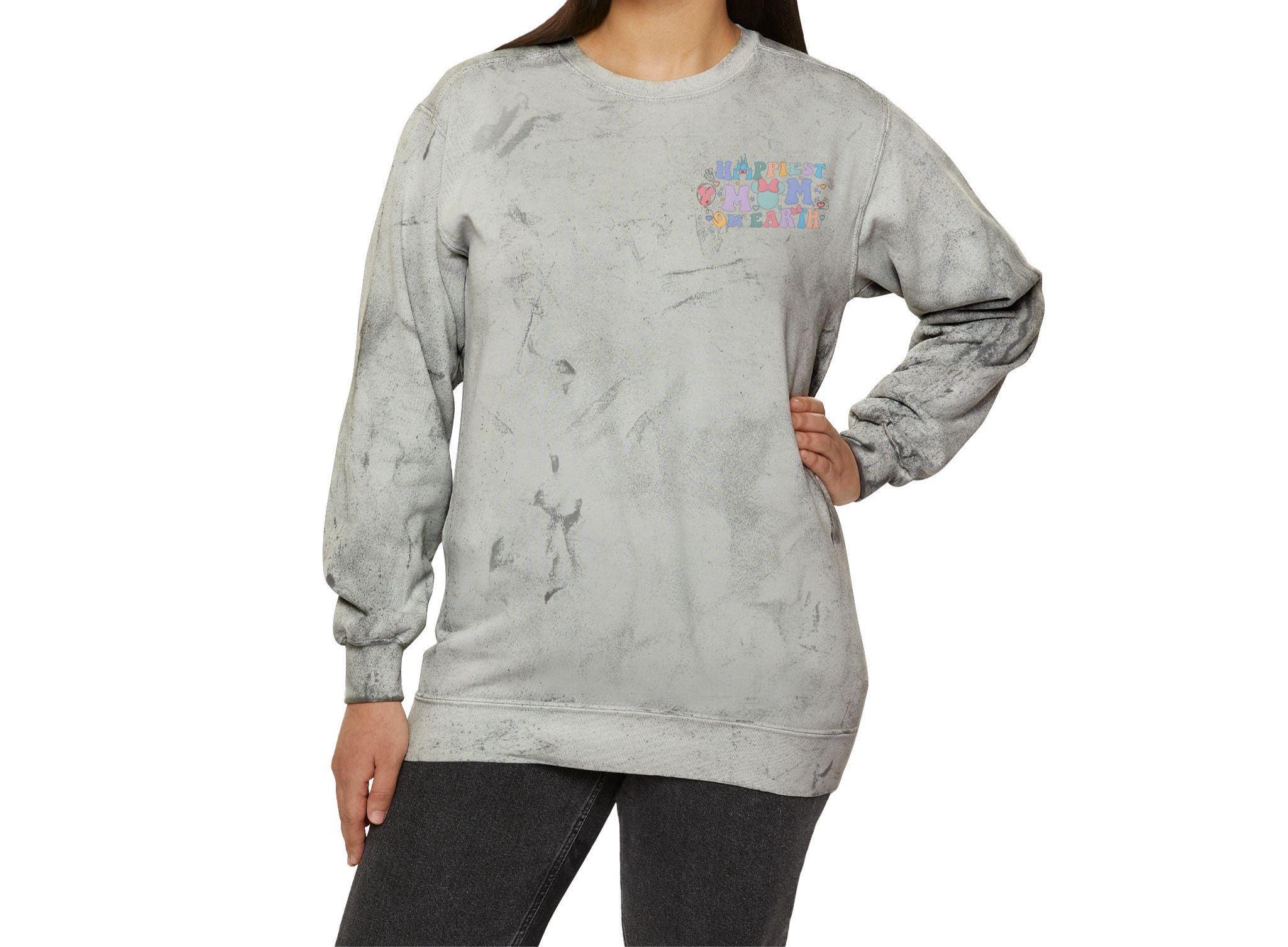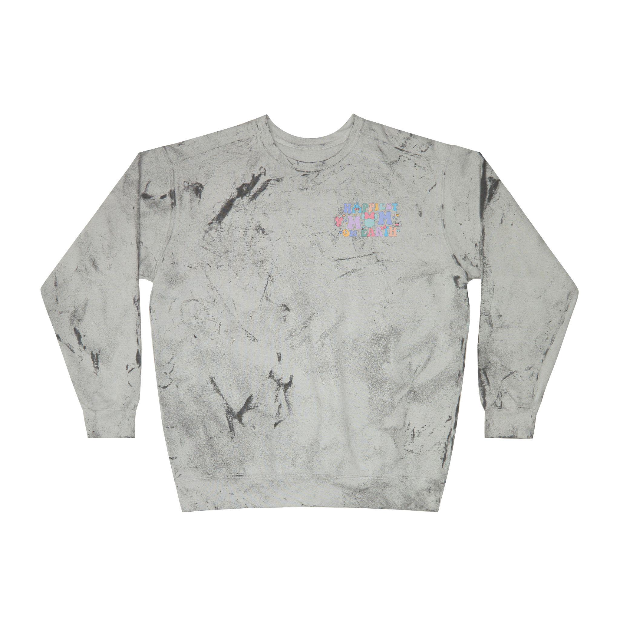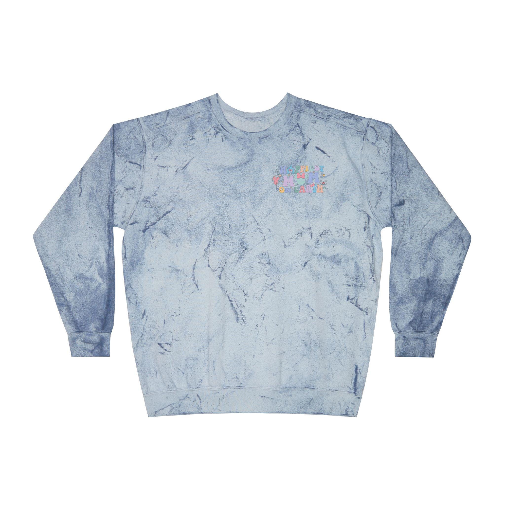 Bright, playful crewneck sweatshirt with a tie-dye marble wash and cheerful slogan. The soft, combed ringspun cotton blend feels gentle against skin while the garment-dyed finish gives each piece a lived-in, slightly vintage look. Double-needle stitched seams and necktape add durability and comfort, so this cozy crew moves with you through park days, weekend errands, and family mornings. The relaxed fit drapes easily over layers without feeling bulky. Wear it to lean into joy, celebrate small moments, or bring a splash of color to everyday routines.