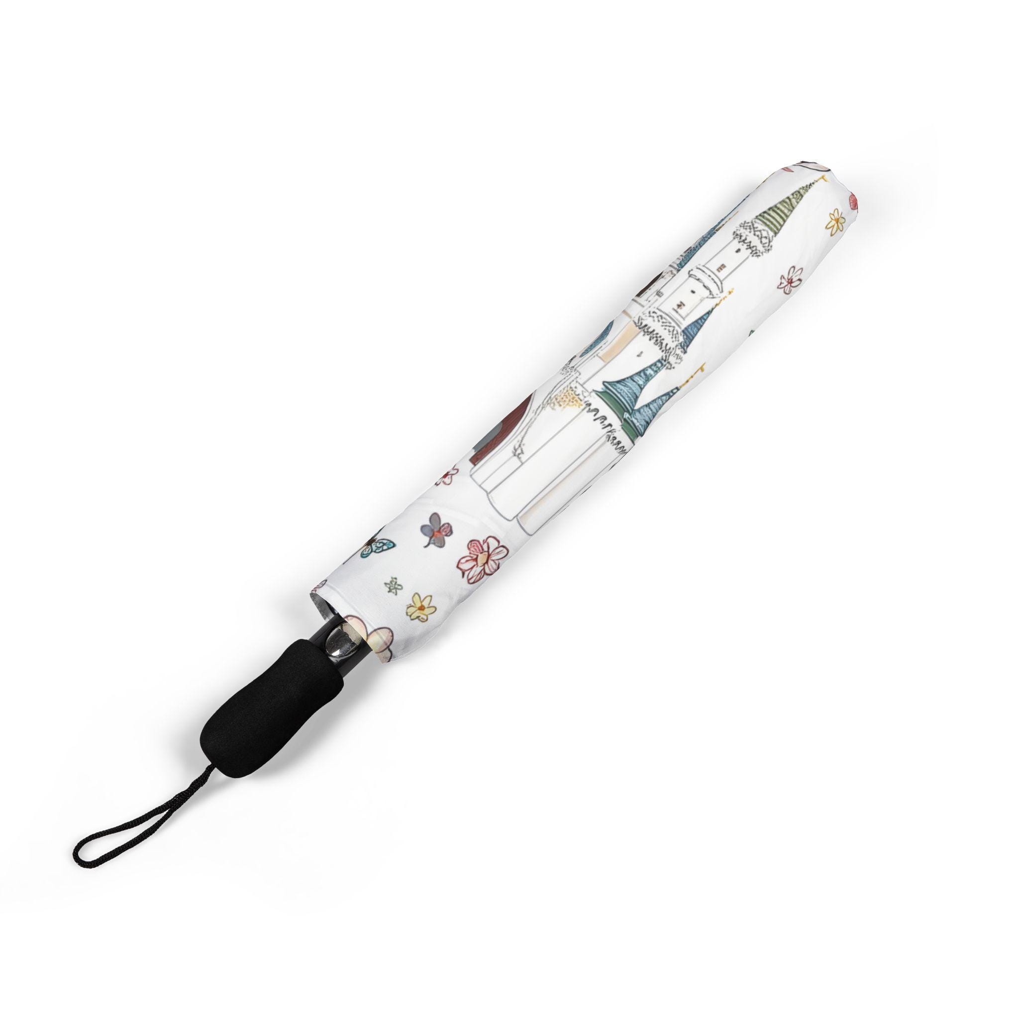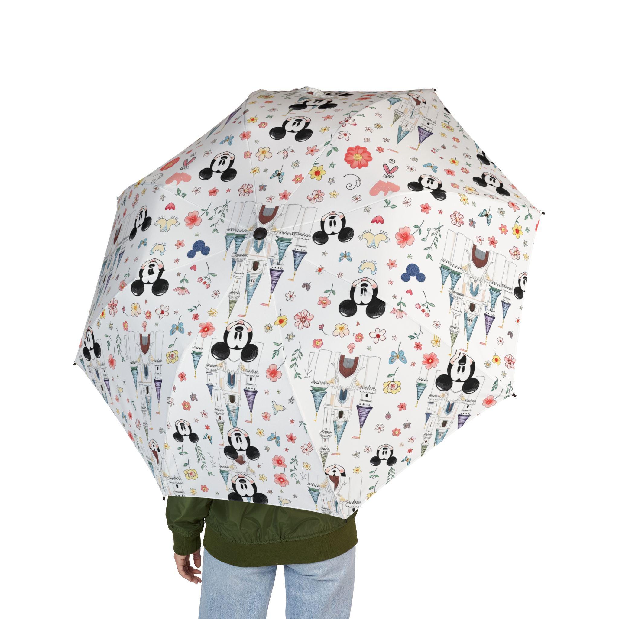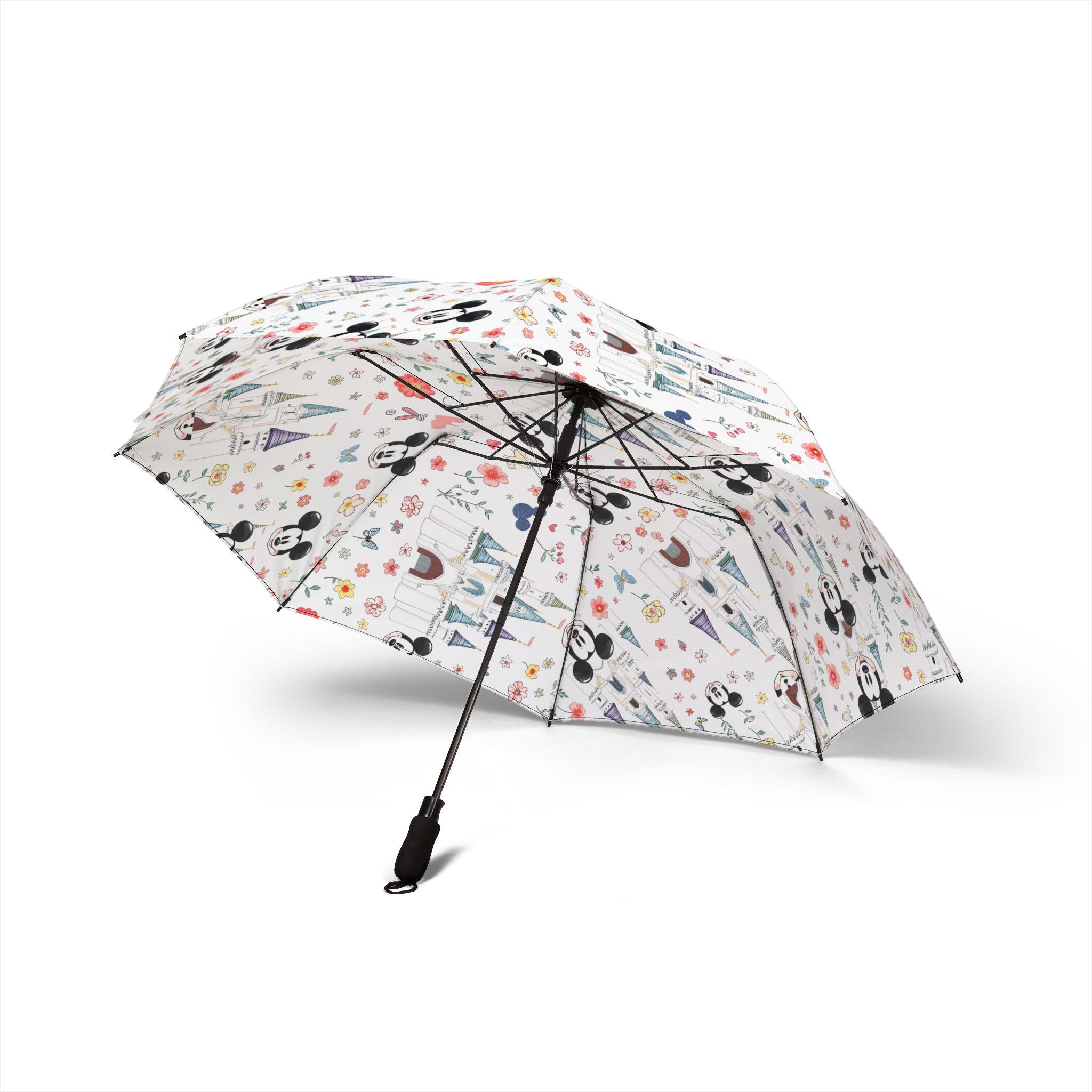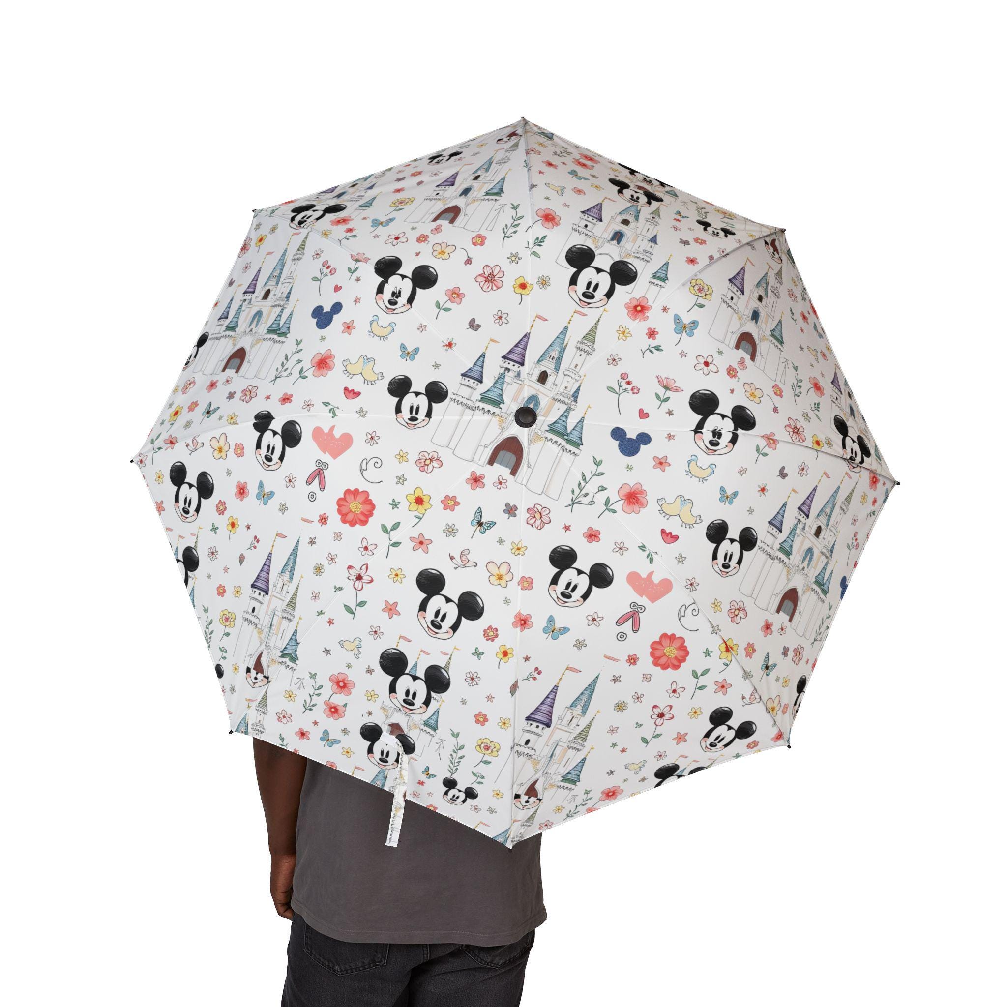 Rain turns into a little celebration when you unfurl this foldable umbrella. Bright retro Mickey faces peek from the canopy, bringing a playful, park-day energy to gray skies. The semi-automatic mechanism opens with one hand in a second, so you can stay focused on coffee, kids, or the next photo op. Durable polyester and eight reinforced fiber ribs keep the canopy taut through gusts, while sublimation printing locks in the vintage colors so the character artwork stays crisp after repeated use. The comfortable rubber handle, wrist strap, and matching sleeve — which echoes the umbrella’s central design — make it simple to carry and tuck away between errands or on the walk from subway to office. This umbrella feels familiar, cheerful, and built to go with you on everyday adventures and rainy-day commutes.