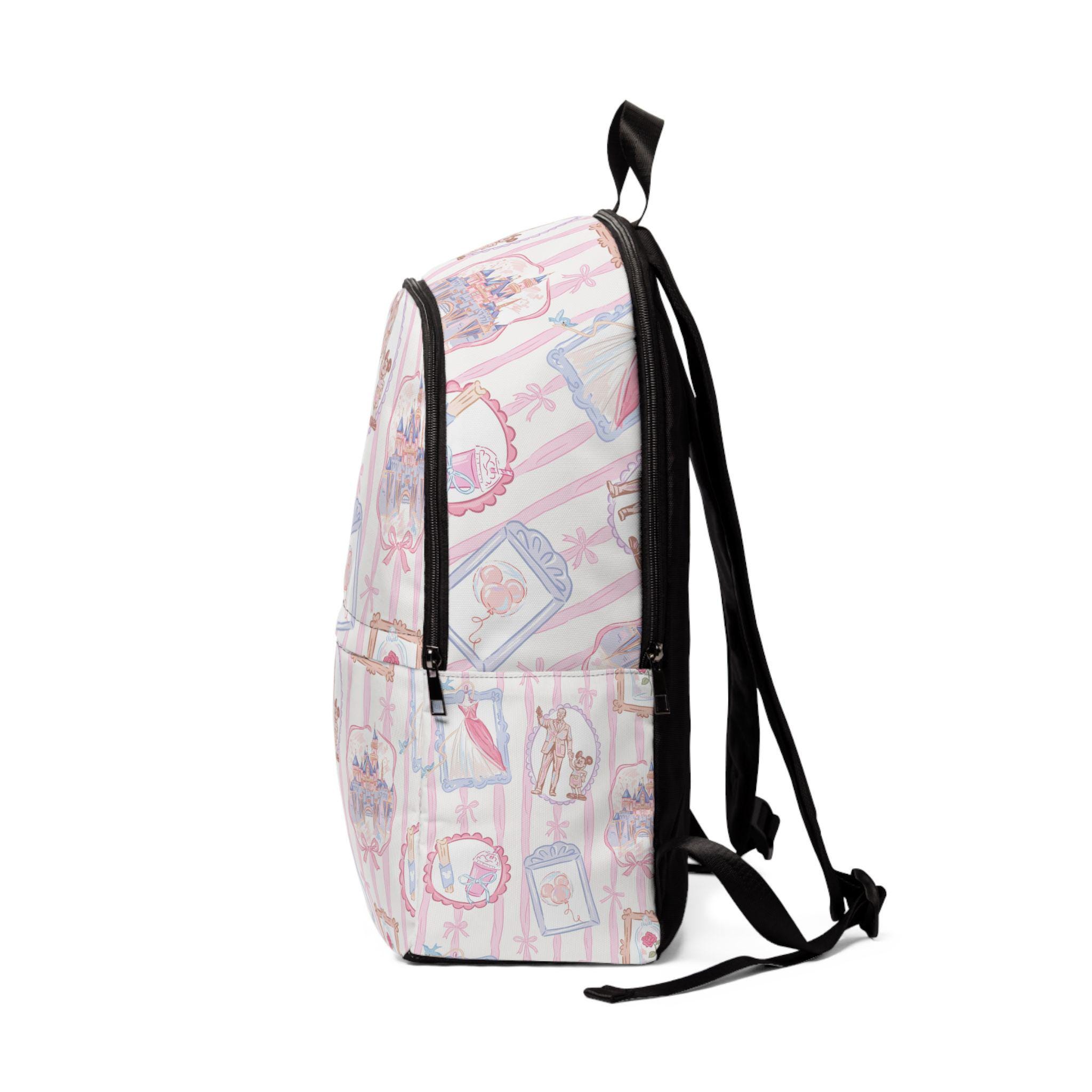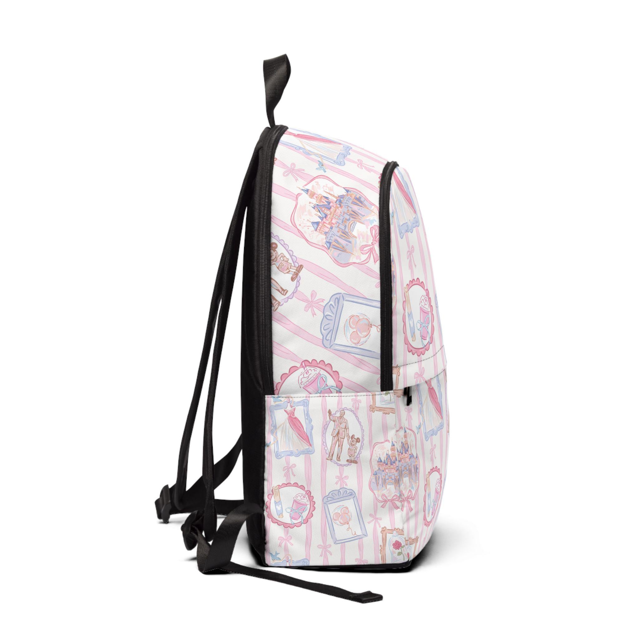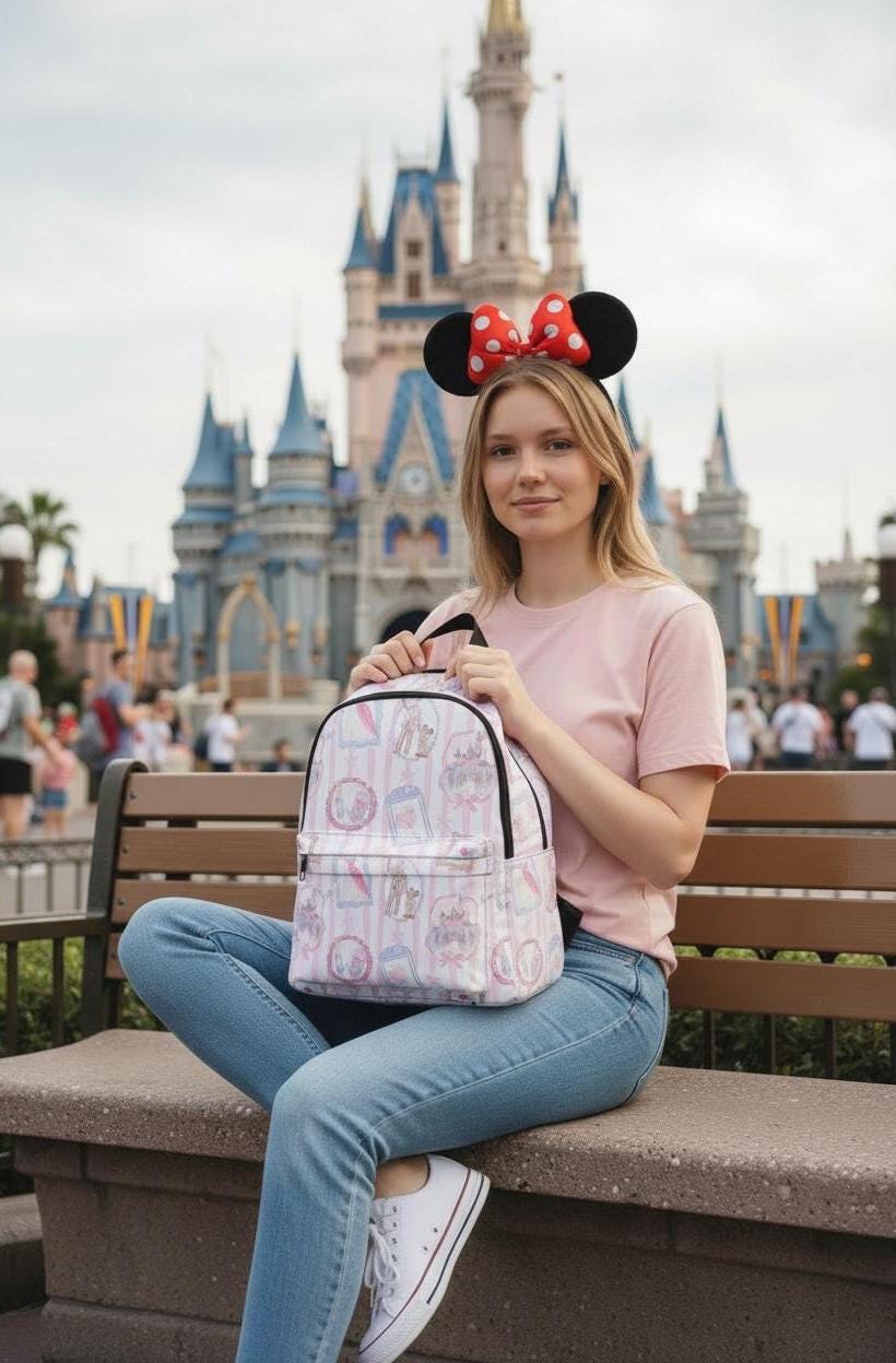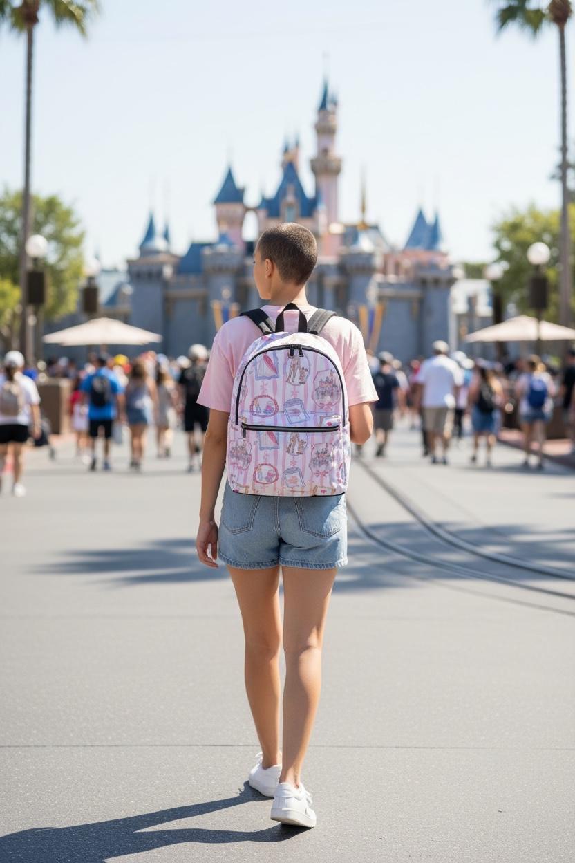 This pastel-pink backpack brings a playful, park-day mood to everyday carry. Soft nylon canvas holds the Disney Parks–inspired frame print with crisp, charming details—tiny icons and swirls that feel like a stroll down Main Street. The padded mesh back and straps make longer days comfortable, whether you're wandering through rides, sketching in a café, or commuting across town. Three zippered pockets keep ticket stubs, sketchbook, and water bottle organized and secure. Lightweight and water-resistant, it shrug-offs spring showers so your essentials stay dry. It reads young at heart and quietly practical—made to travel, collect memories, and sit happily at your side while you explore.
