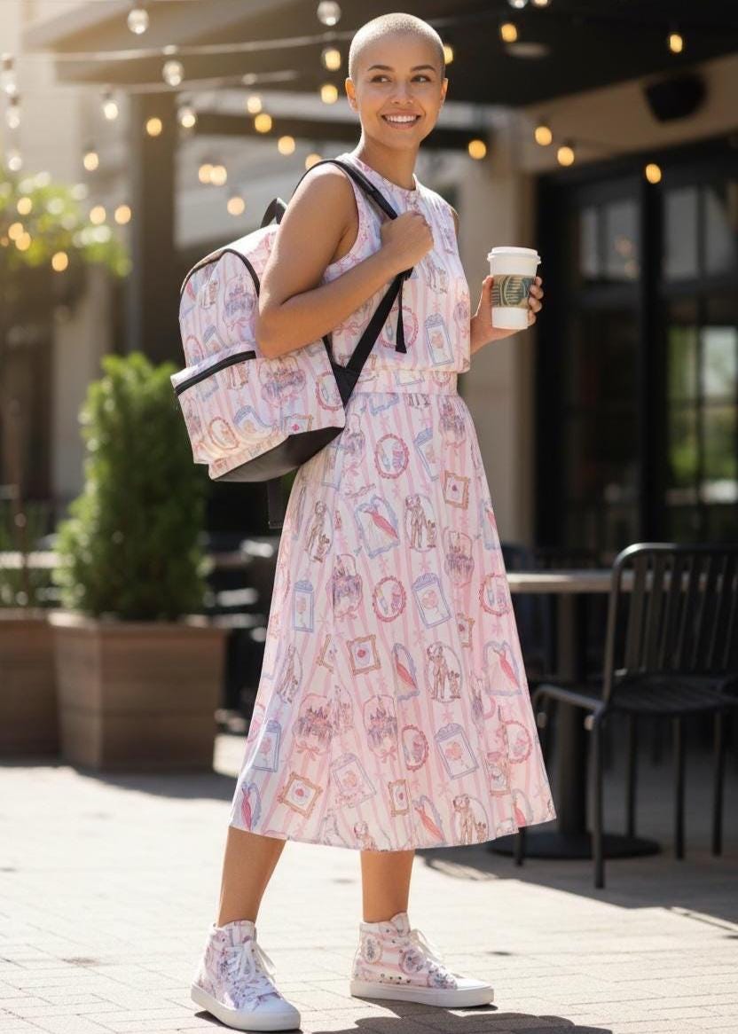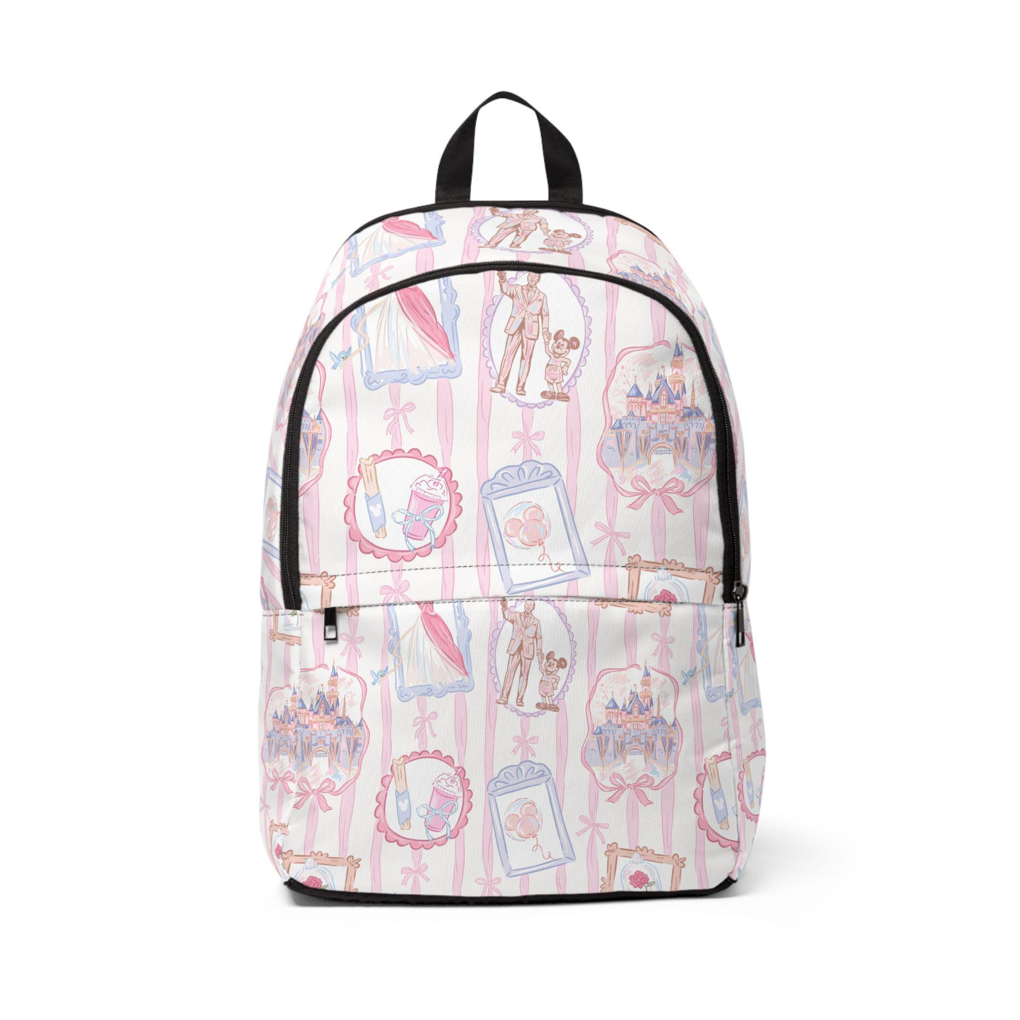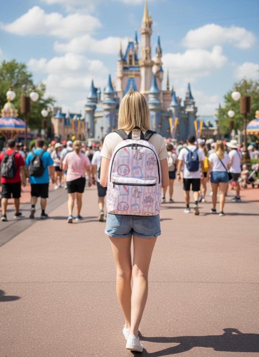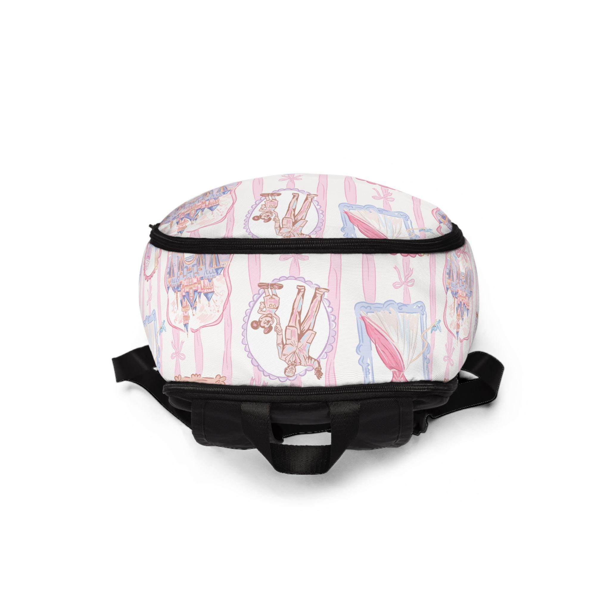 This pastel-pink backpack brings a playful, park-day mood to everyday carry. Soft nylon canvas holds the Disney Parks–inspired frame print with crisp, charming details—tiny icons and swirls that feel like a stroll down Main Street. The padded mesh back and straps make longer days comfortable, whether you're wandering through rides, sketching in a café, or commuting across town. Three zippered pockets keep ticket stubs, sketchbook, and water bottle organized and secure. Lightweight and water-resistant, it shrug-offs spring showers so your essentials stay dry. It reads young at heart and quietly practical—made to travel, collect memories, and sit happily at your side while you explore.