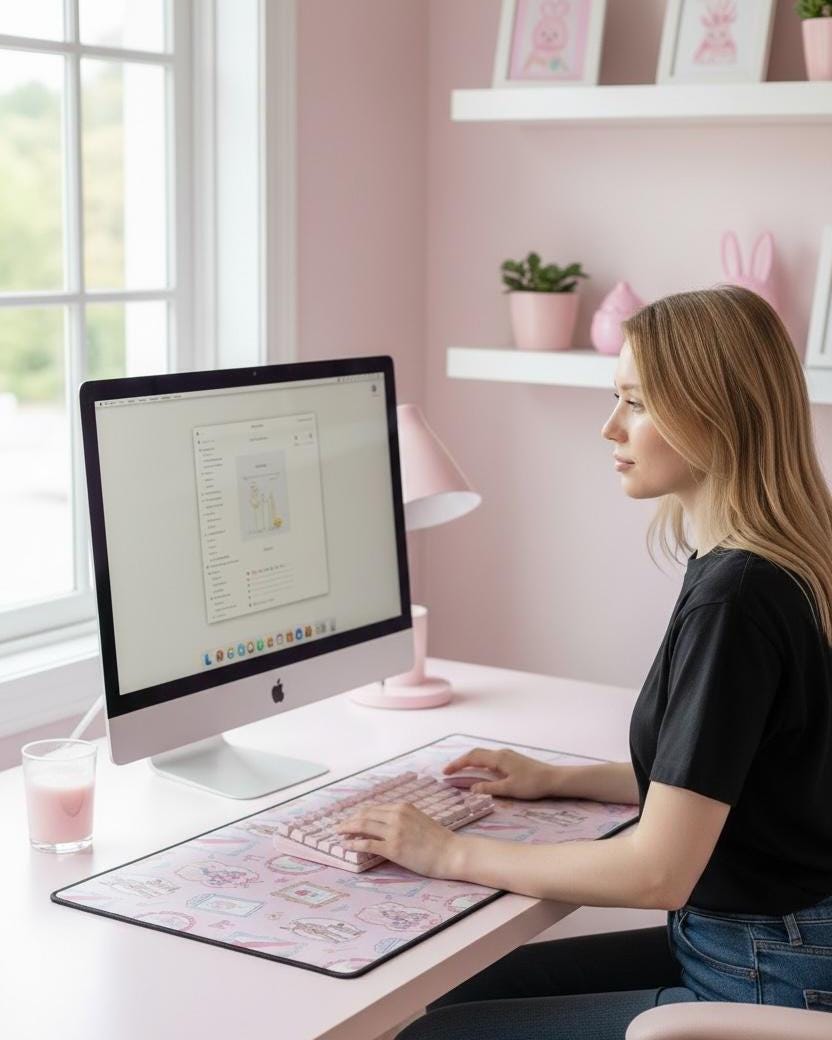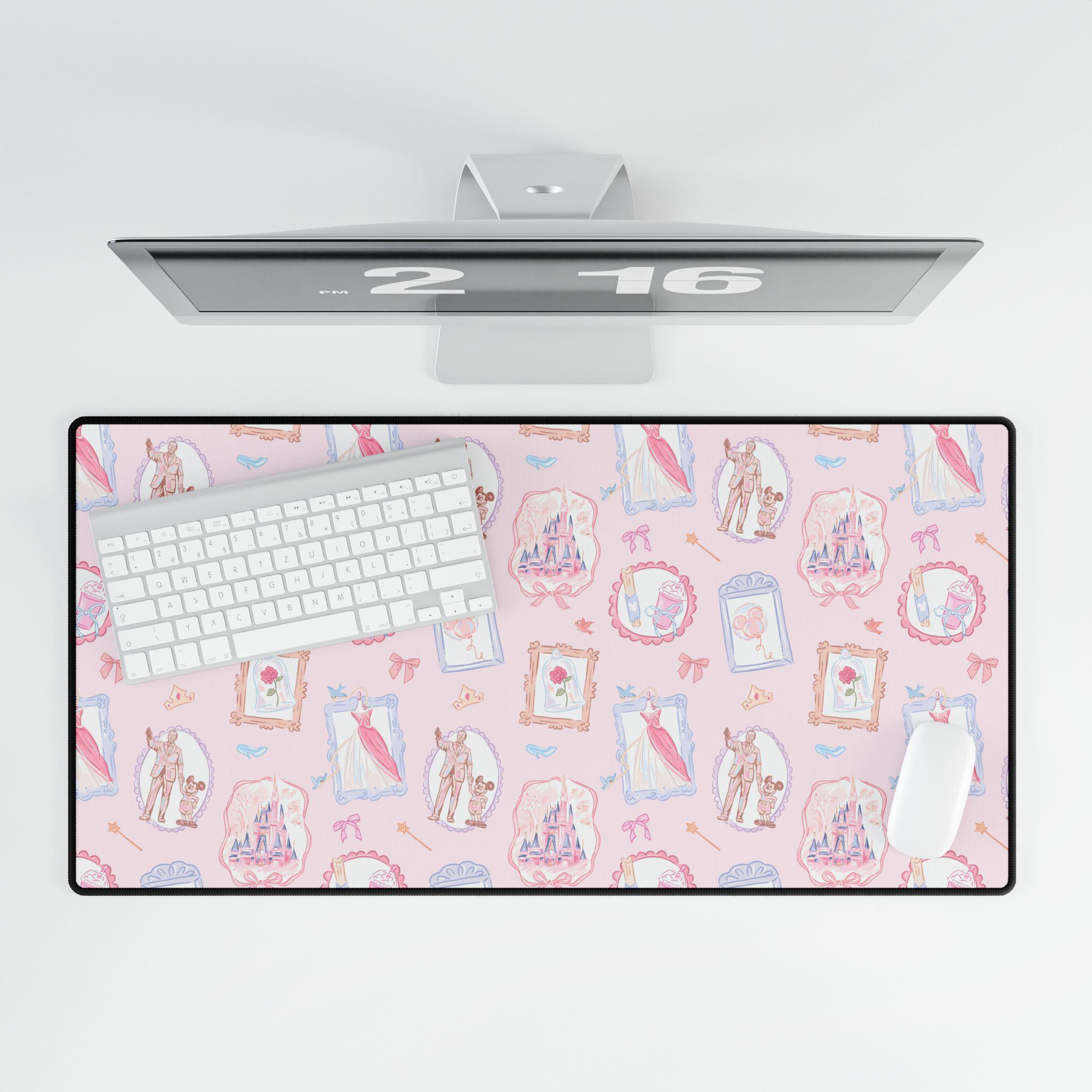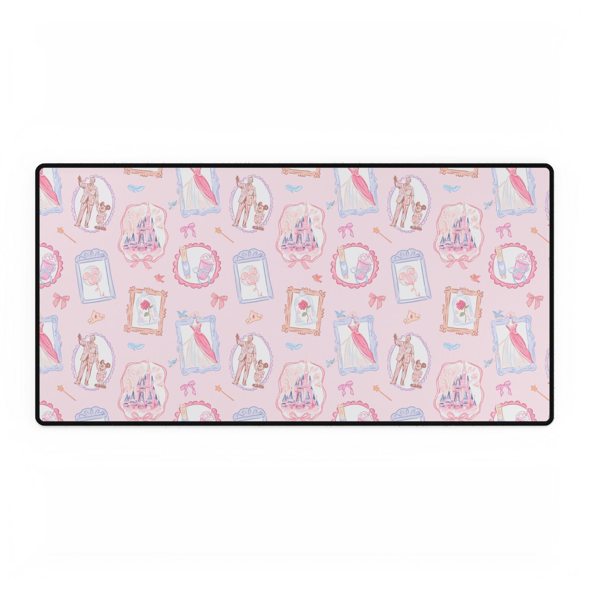 A romantic, vintage-inspired desk mat that brings museum-like charm to your everyday workspace. Soft pink tones and Victorian cameo silhouettes recall an old-world parlor, while playful mouse-and-castle motifs nod to beloved fairytales. Lay it under your keyboard and mouse to soften your desk and invite a gentler rhythm to work—one that feels like turning a page in a treasured storybook. The design blends nostalgia with a touch of whimsy, making long hours at the desk feel calmer and a little more magical during cozy evenings, creative afternoons, or when you’re curating a themed desktop setup.