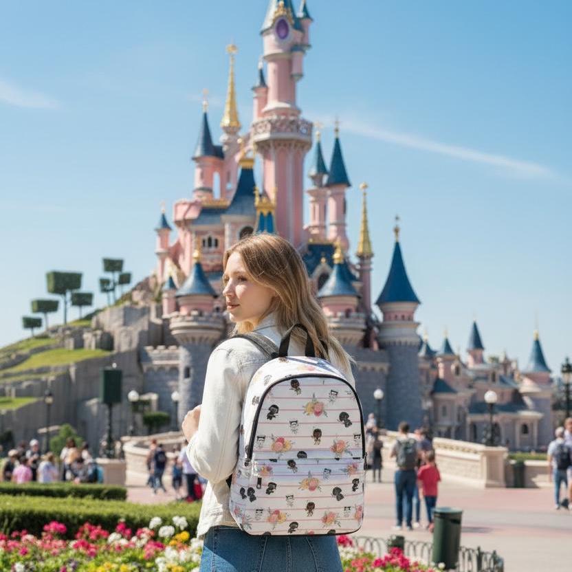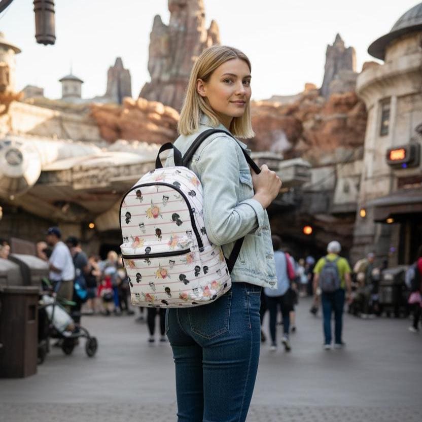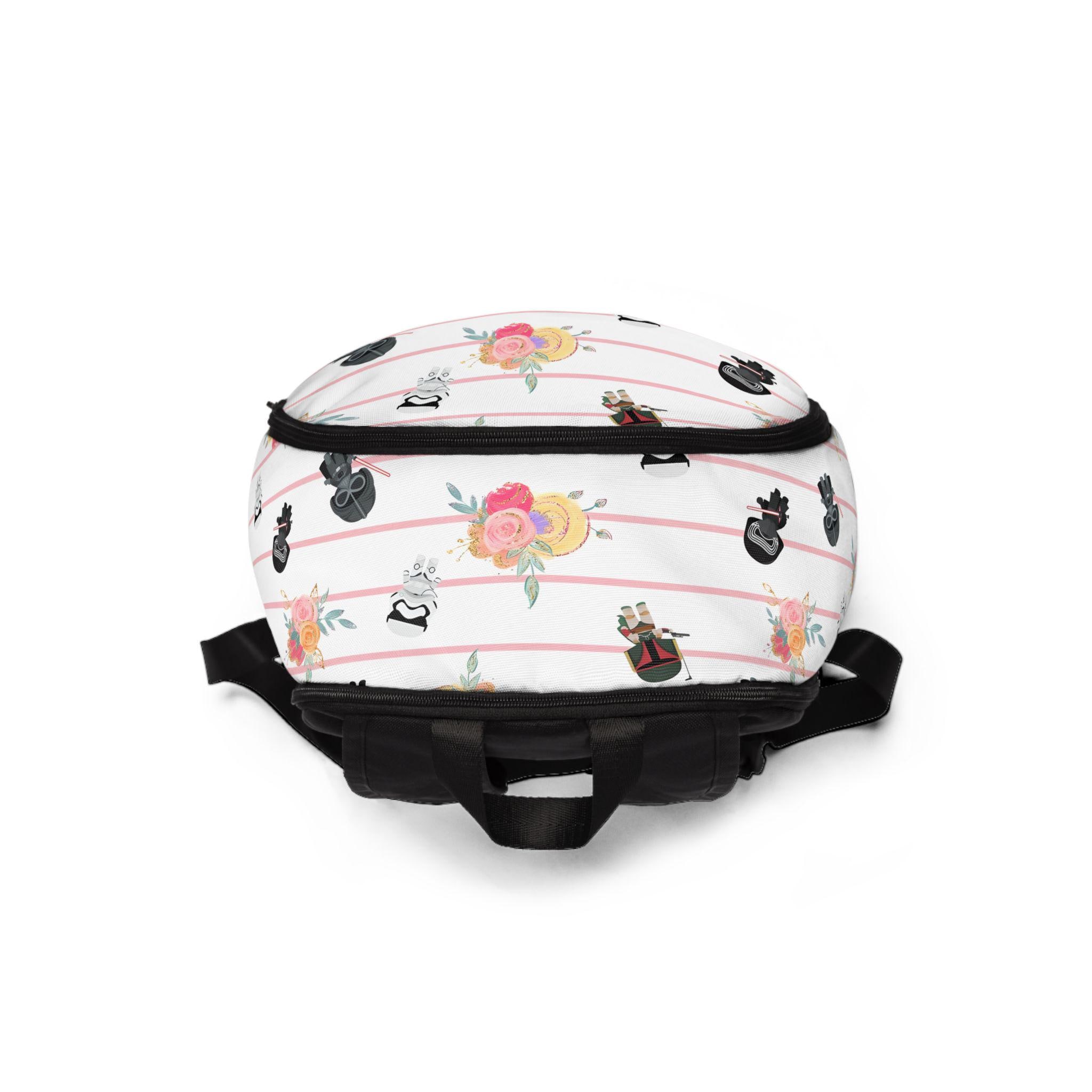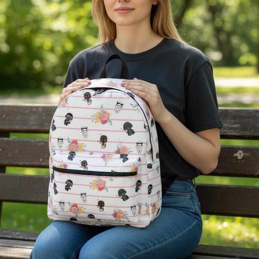 A playful, compact backpack that brings a quirky, floral-meets-galaxy vibe to everyday carry. Cute Stormtrooper and Darth Vader silhouettes dance across soft, striped blooms—an offbeat mix of nostalgic fandom and gentle, feminine patterning. It wears comfortably on city streets, campus walks, or museum days; the padded mesh back and adjustable straps make longer strolls easy. Thoughtful pockets keep sketchbooks, chargers, and small treasures organized while waterproof, tear-resistant nylon protects whatever you tuck inside. This bag feels like an affectionate wink to longtime fans who also love floral prints—practical, light, and a little whimsical.