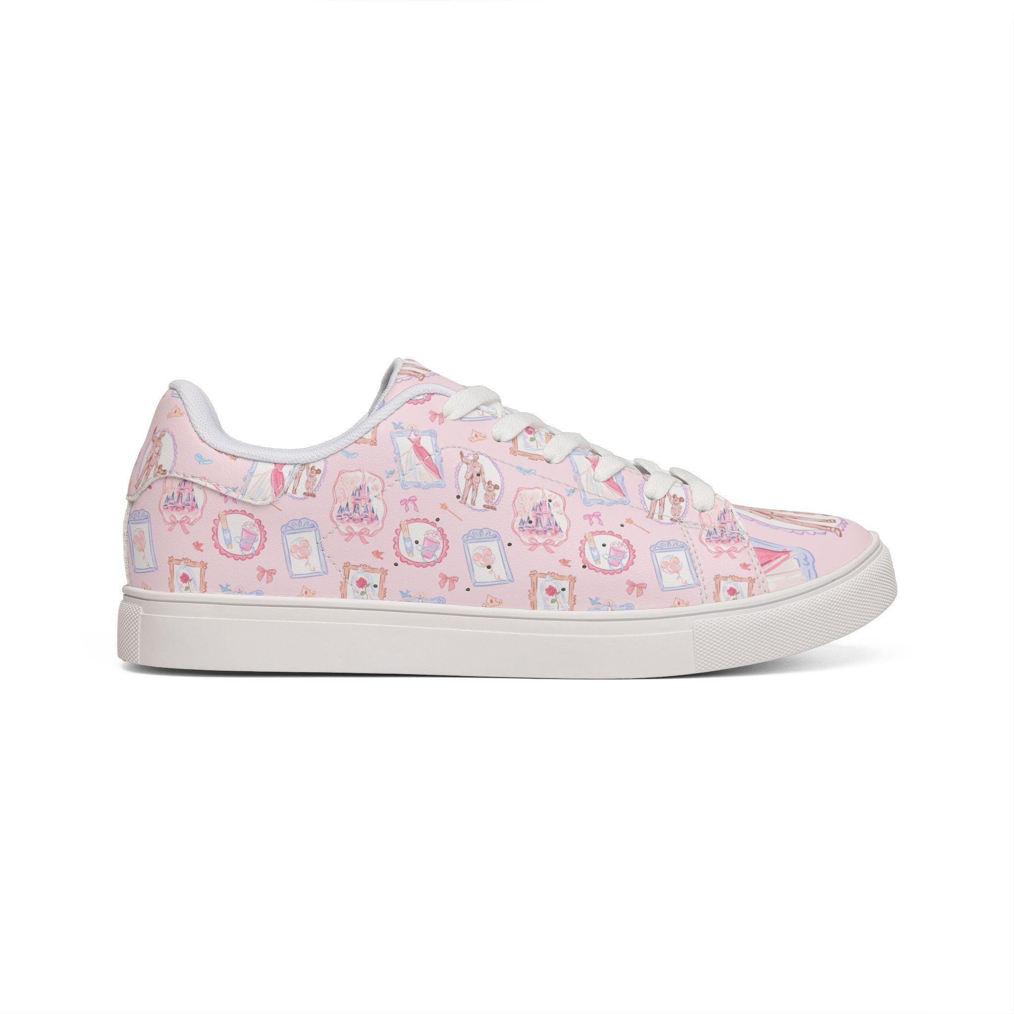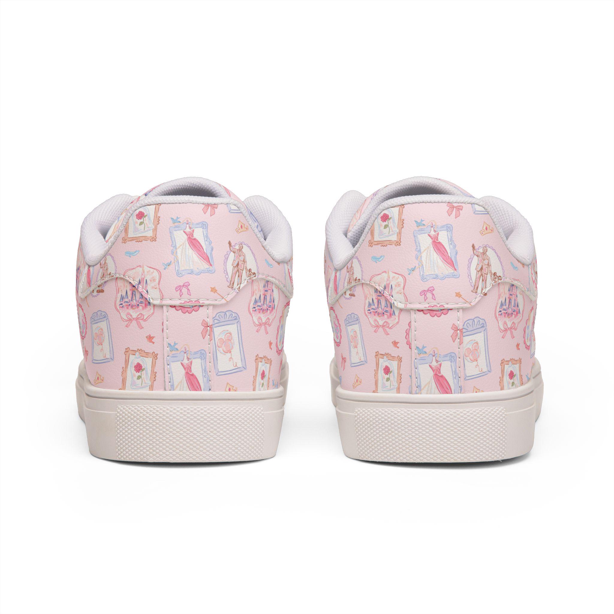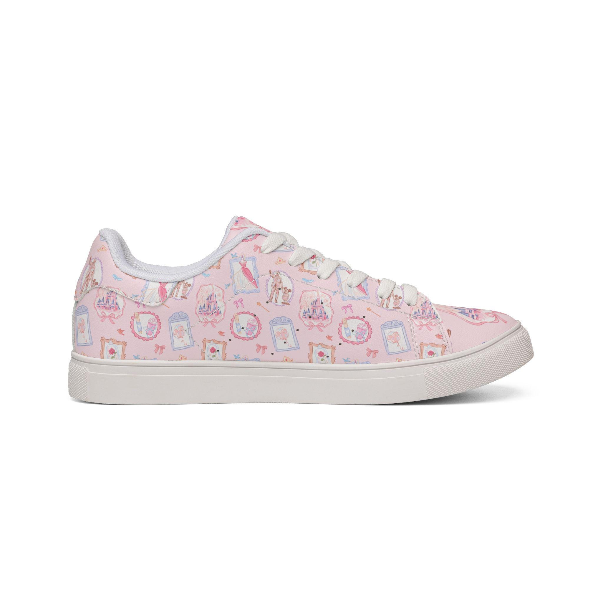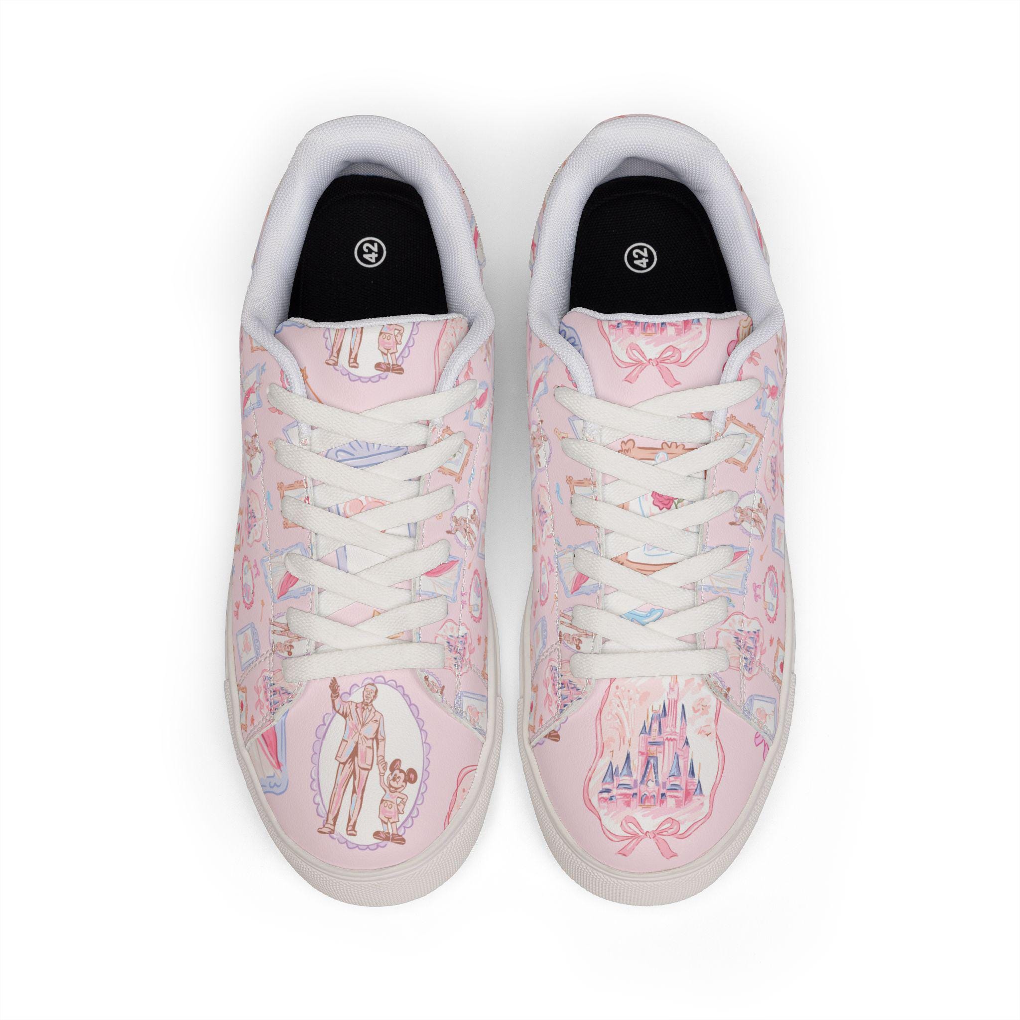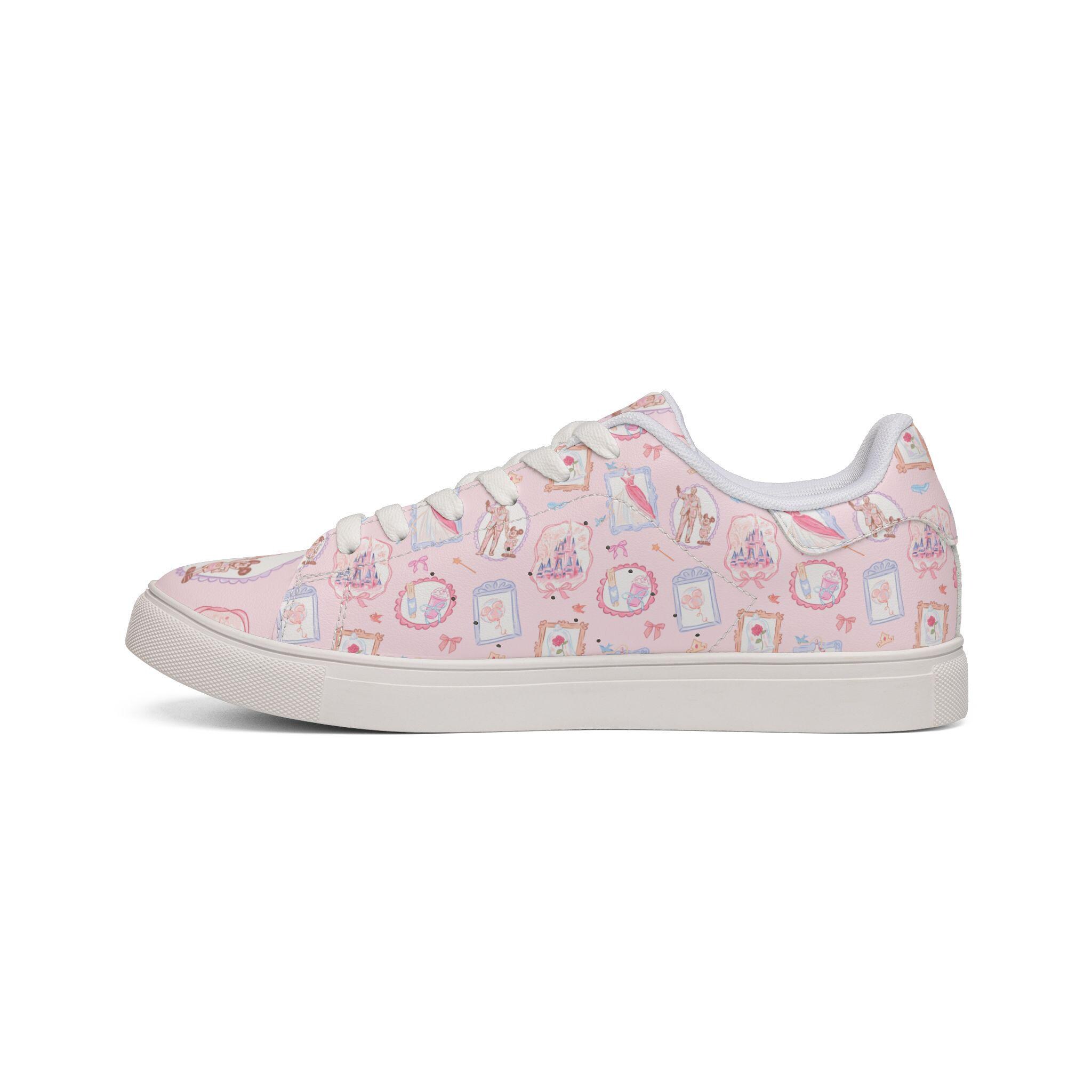 Step into soft, storybook magic with these dreamy pink Disney-inspired sneakers, featuring a delicate vintage-style design inspired by Mickey Mouse and fairytale castle details 🏰💖
