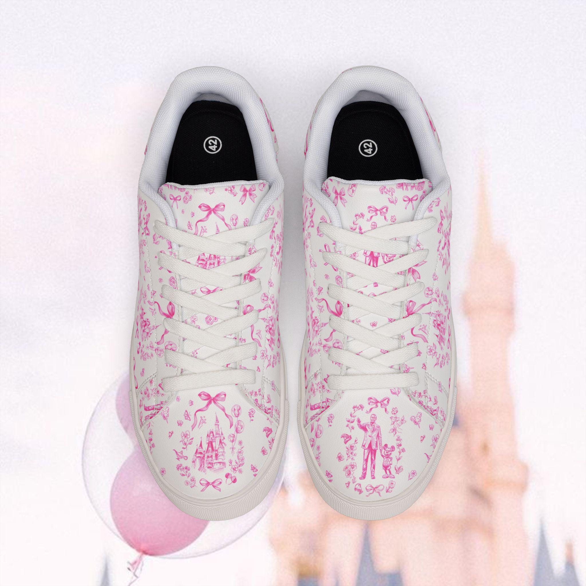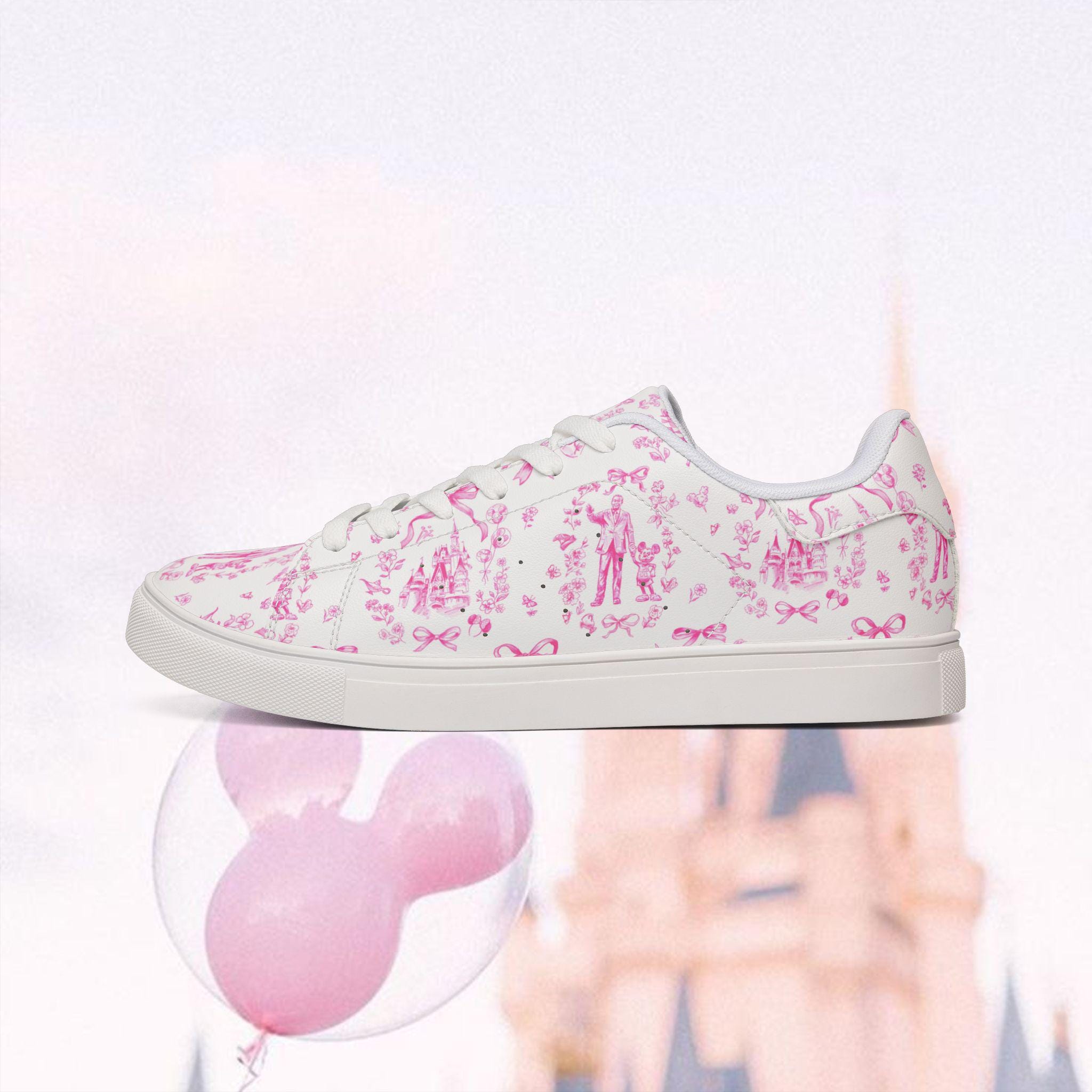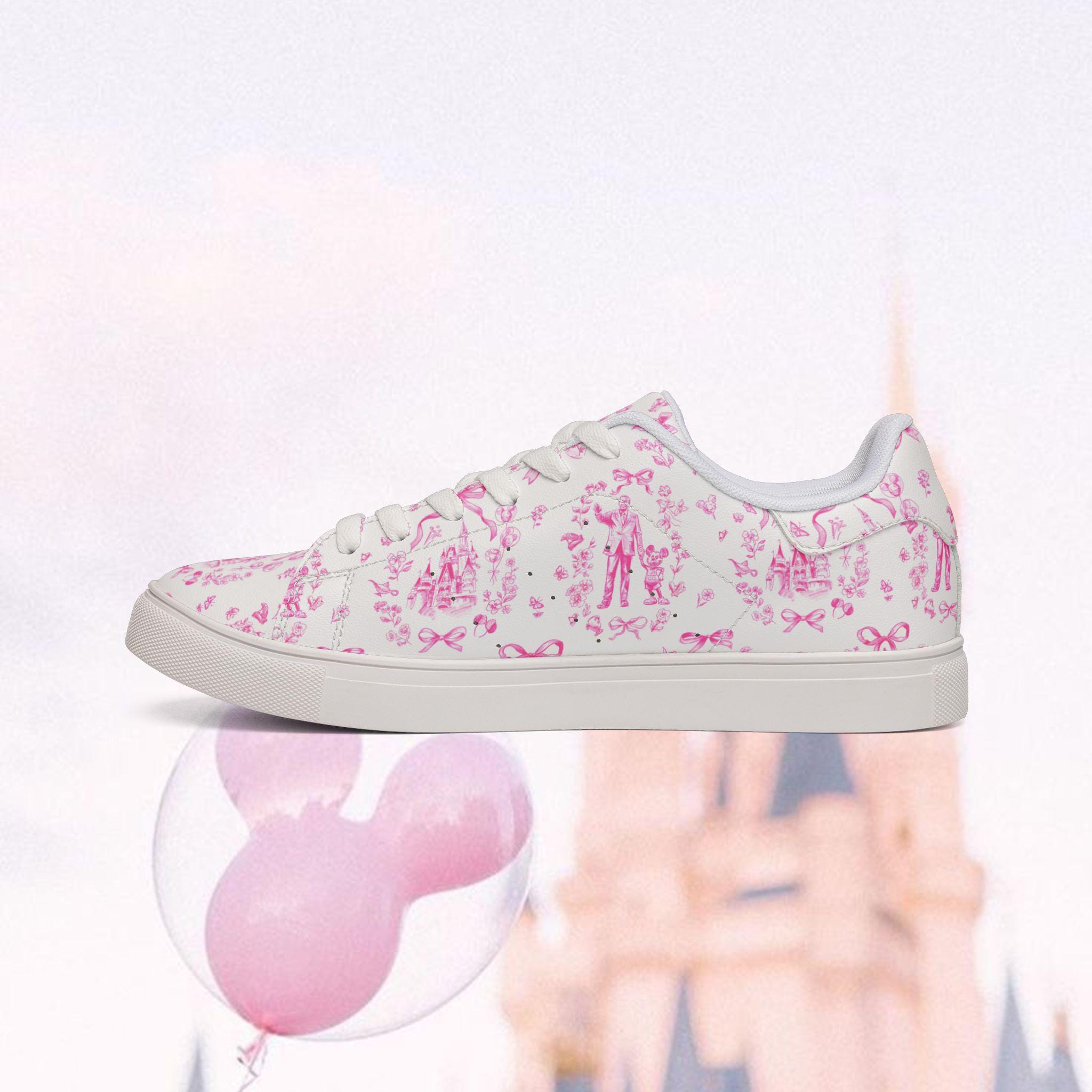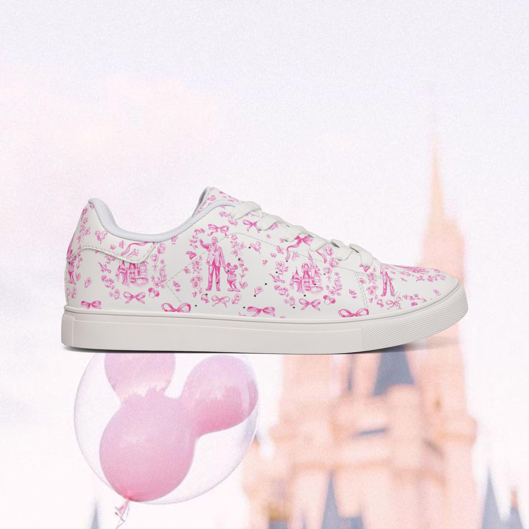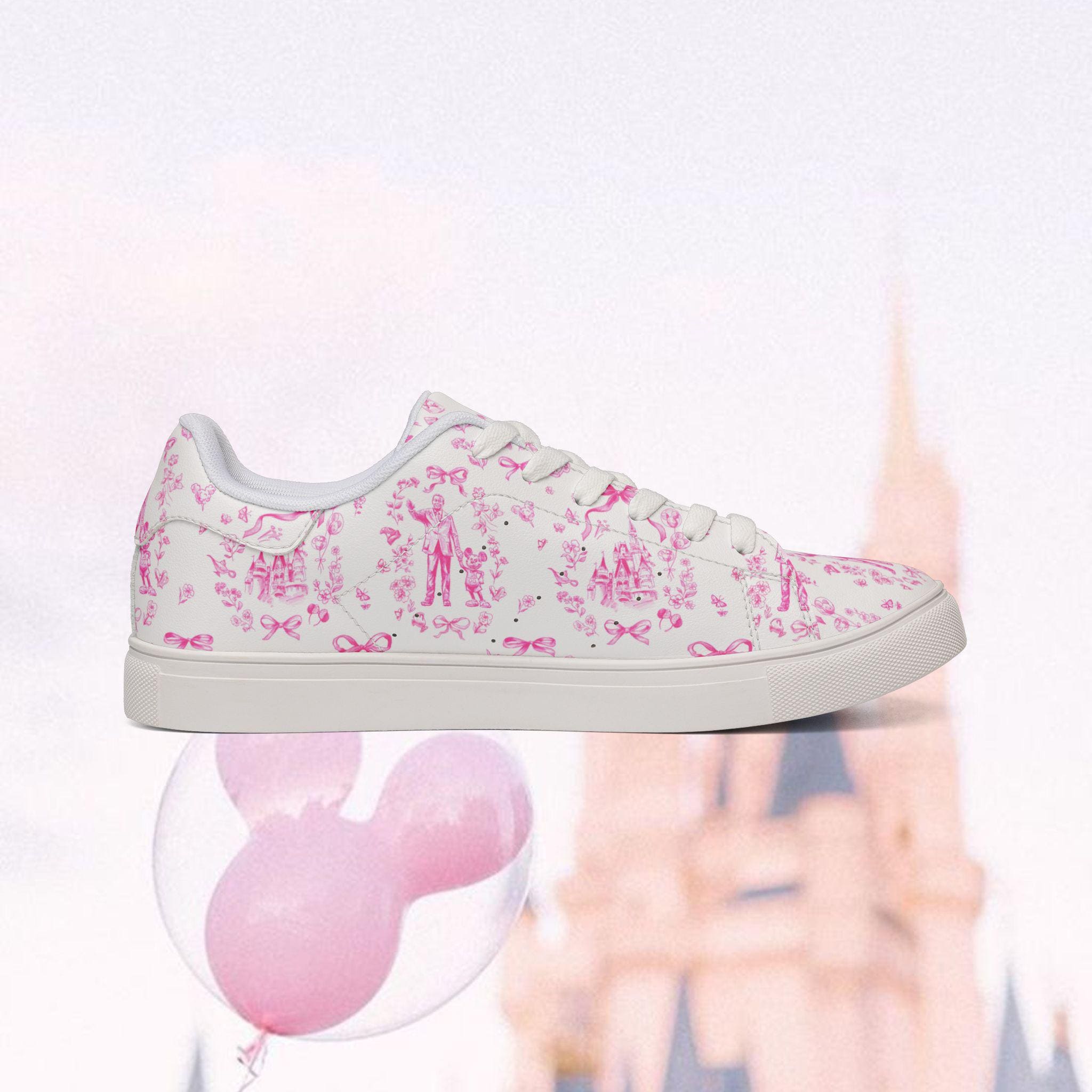 These low-top leather-look trainers feature a delicate pink toile-style print filled with charming, storybook-inspired motifs. From dreamy castles to playful character silhouettes, every detail brings a soft, magical touch to your everyday outfit — whether you're strolling down Main Street, boarding a Disney cruise, or simply adding a little joy to your day.
